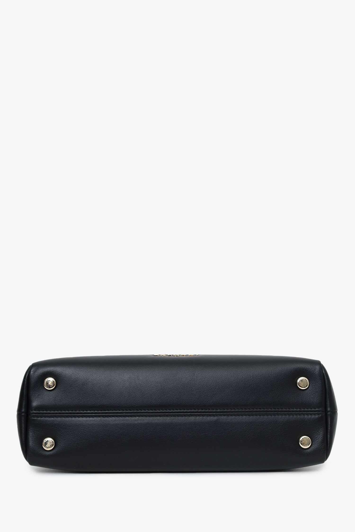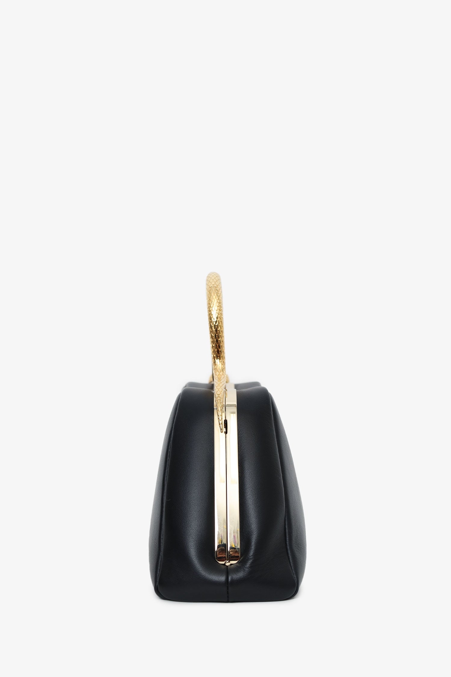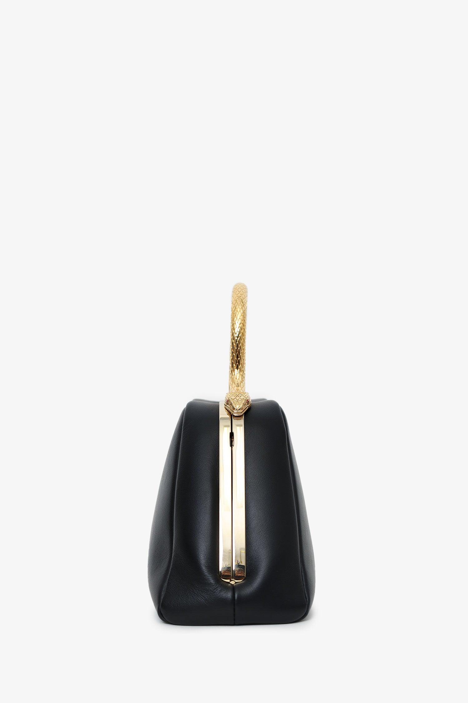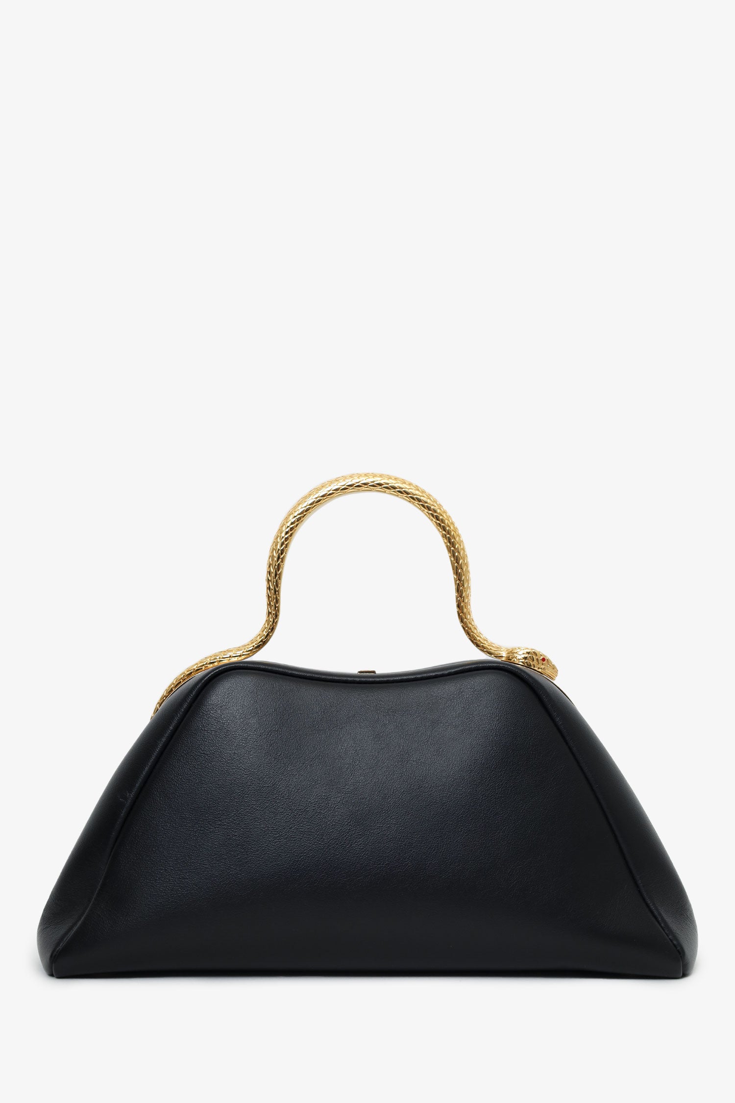 Refresh availabilityBvlgari Black Soft Calfskin Serpentine Top Handle Bag with Strap. Top push-clasp closure. Top handle. Removable and adjustable crossbody strap with clasp closure. Protective base studs. Single interior slip pocket. Gold-tone hardware. Tonal stitching.