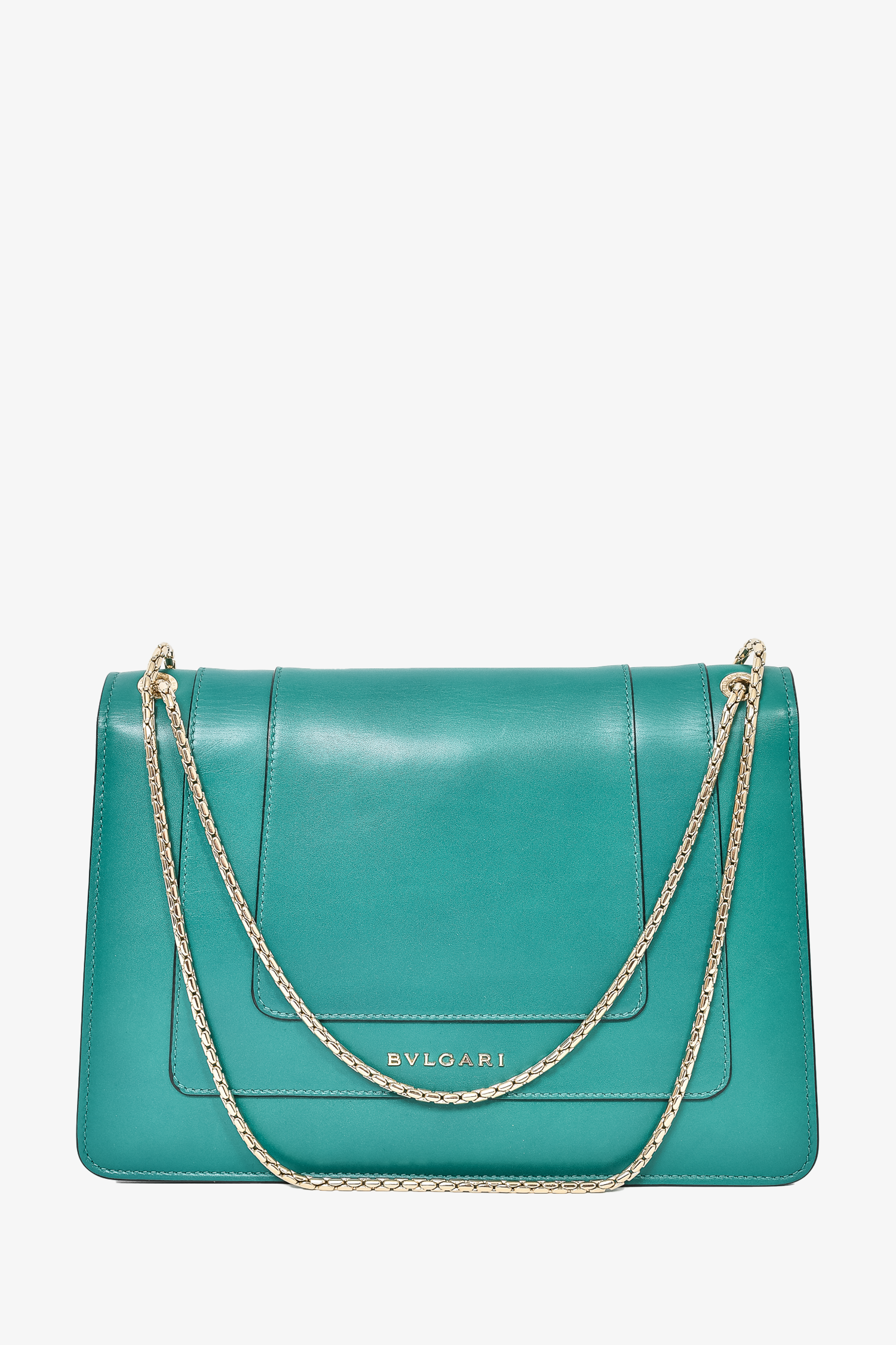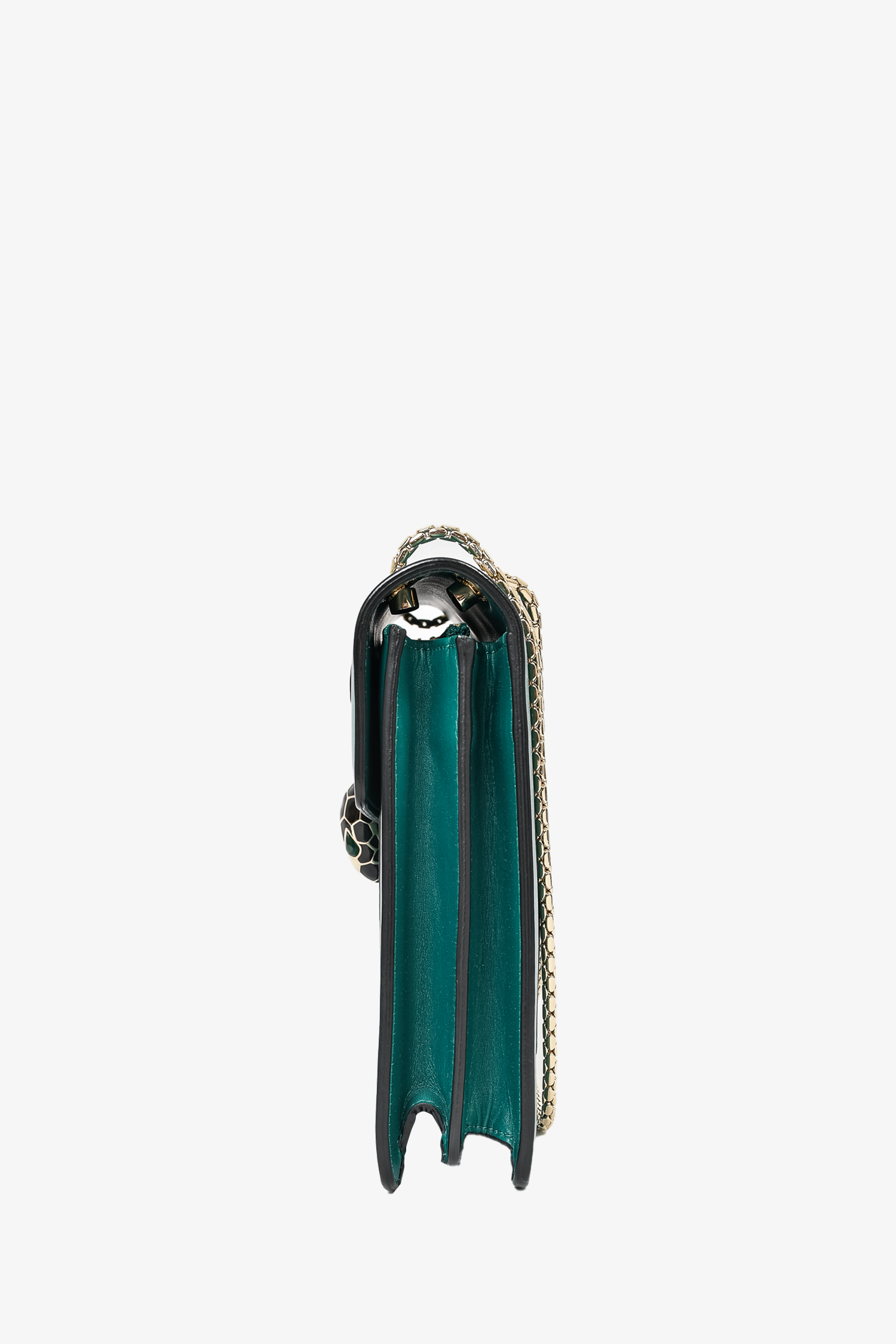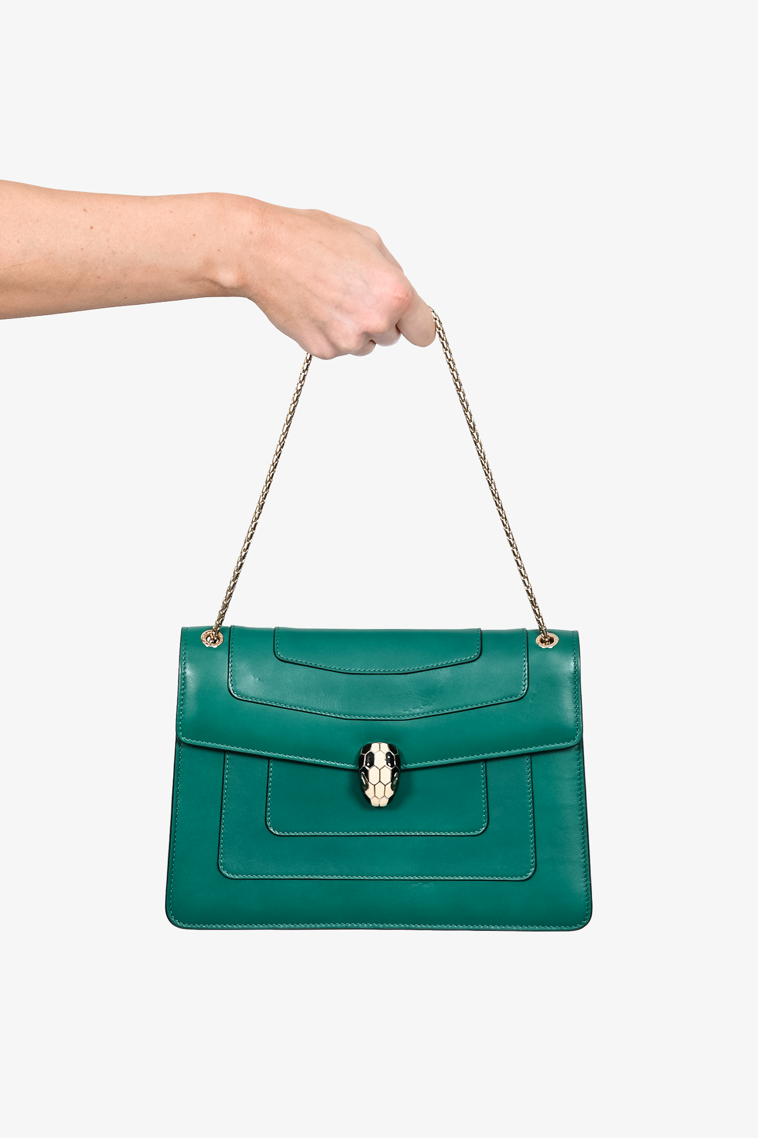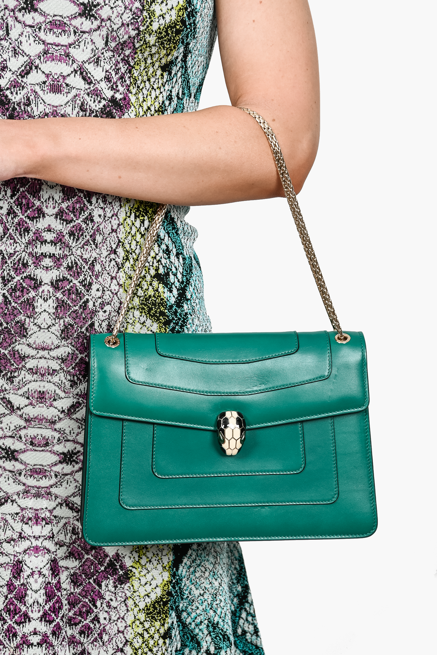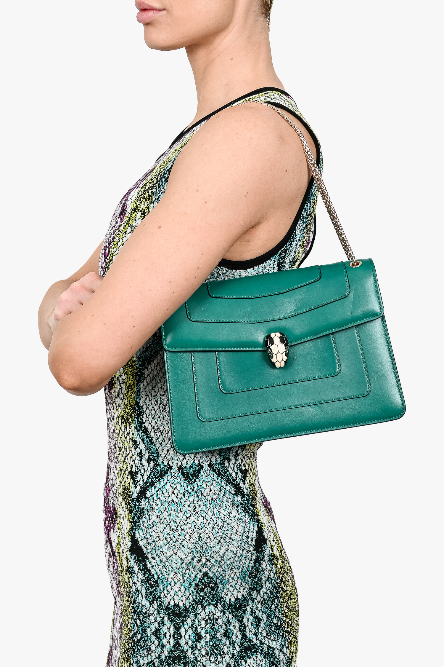 Refresh availabilityBvlgari Green Leather Serpenti Forever Medium Shoulder Bag. Front fold-over flap with push closure. Purple textile interior lining. 3 interior compartments; 2 open and 1 with zip closure. Slide-around chain. 2 interior wall pockets; 1 slip and 1 with zip closure. Gold-tone hardware. Tonal stitching.