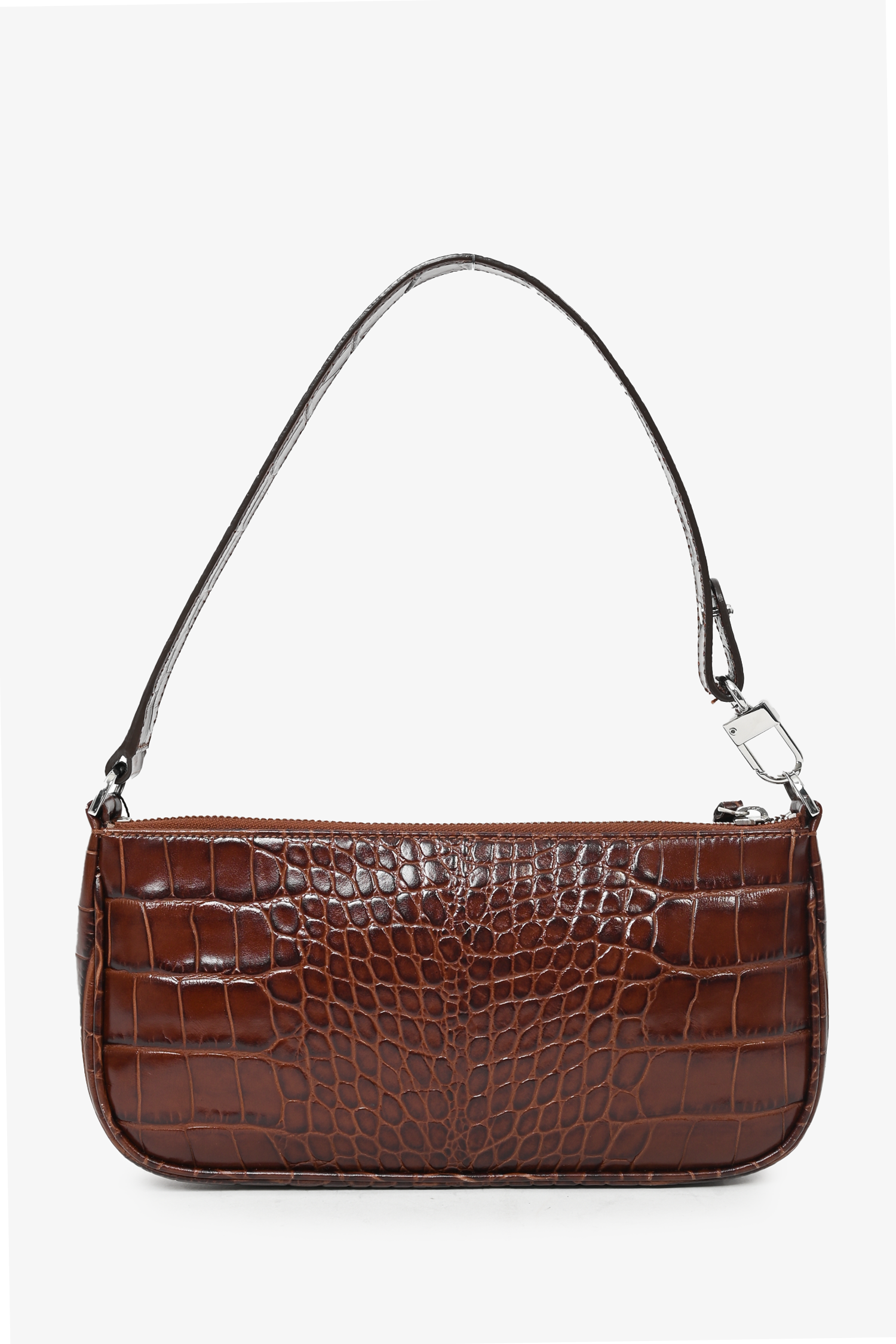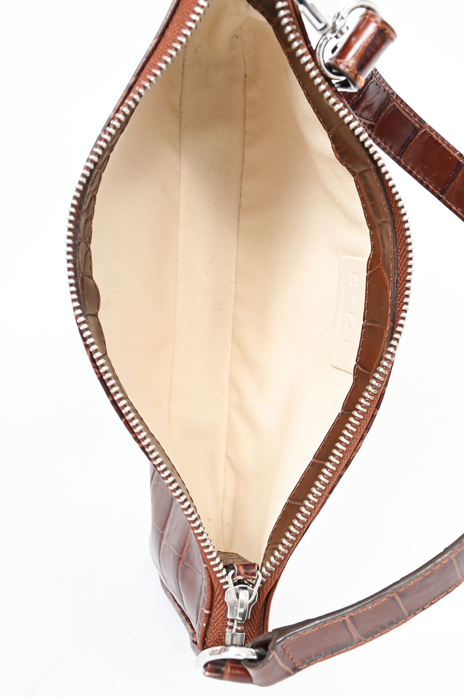 Refresh availabilityBy Far Brown Leather Croc Embossed Shoulder Bag. Top zip closure. Cream textile interior lining. Open interior. Silver-tone hardware. Tonal stitching.