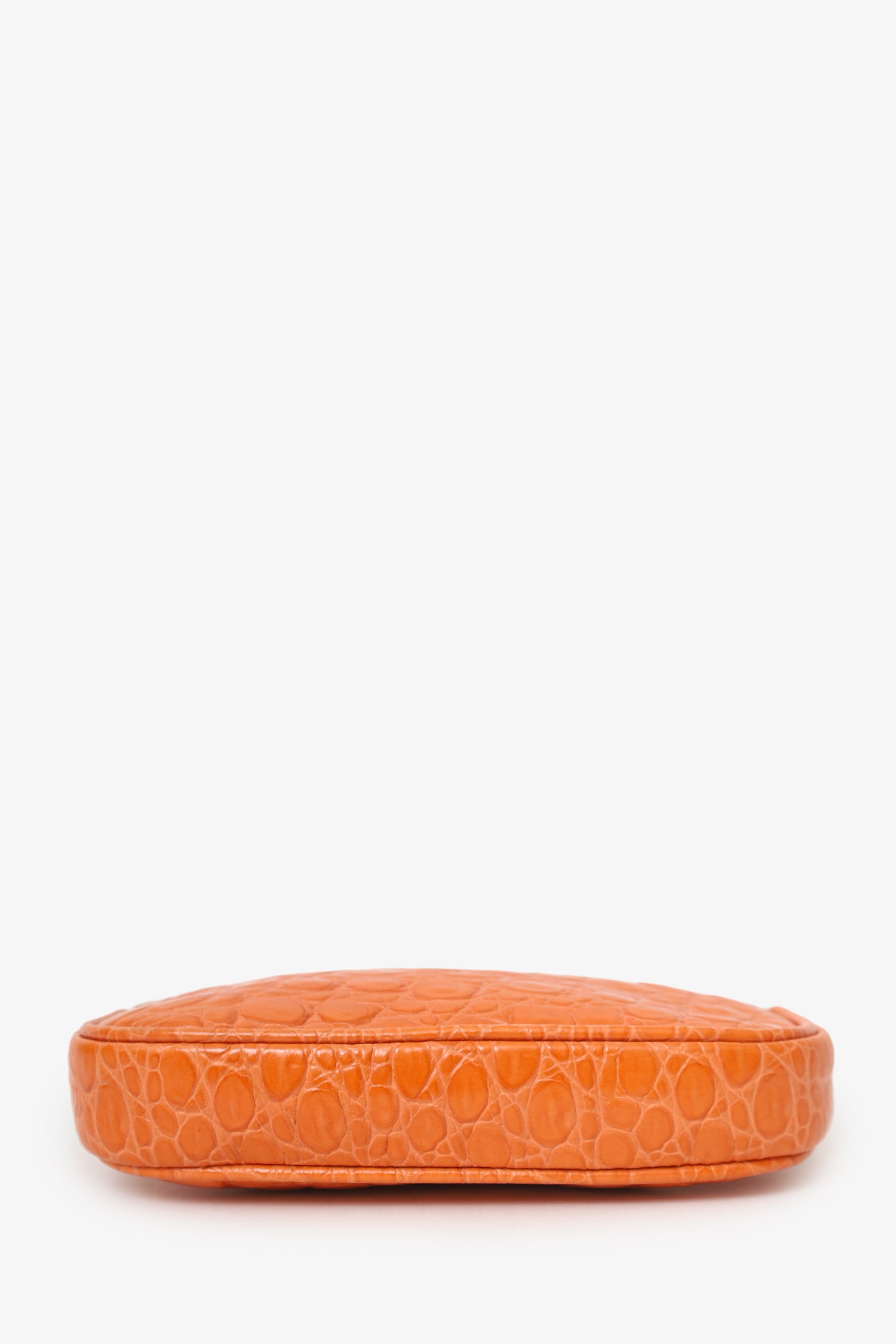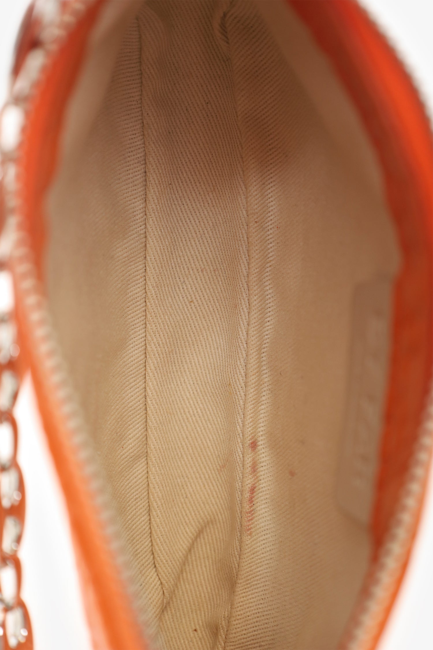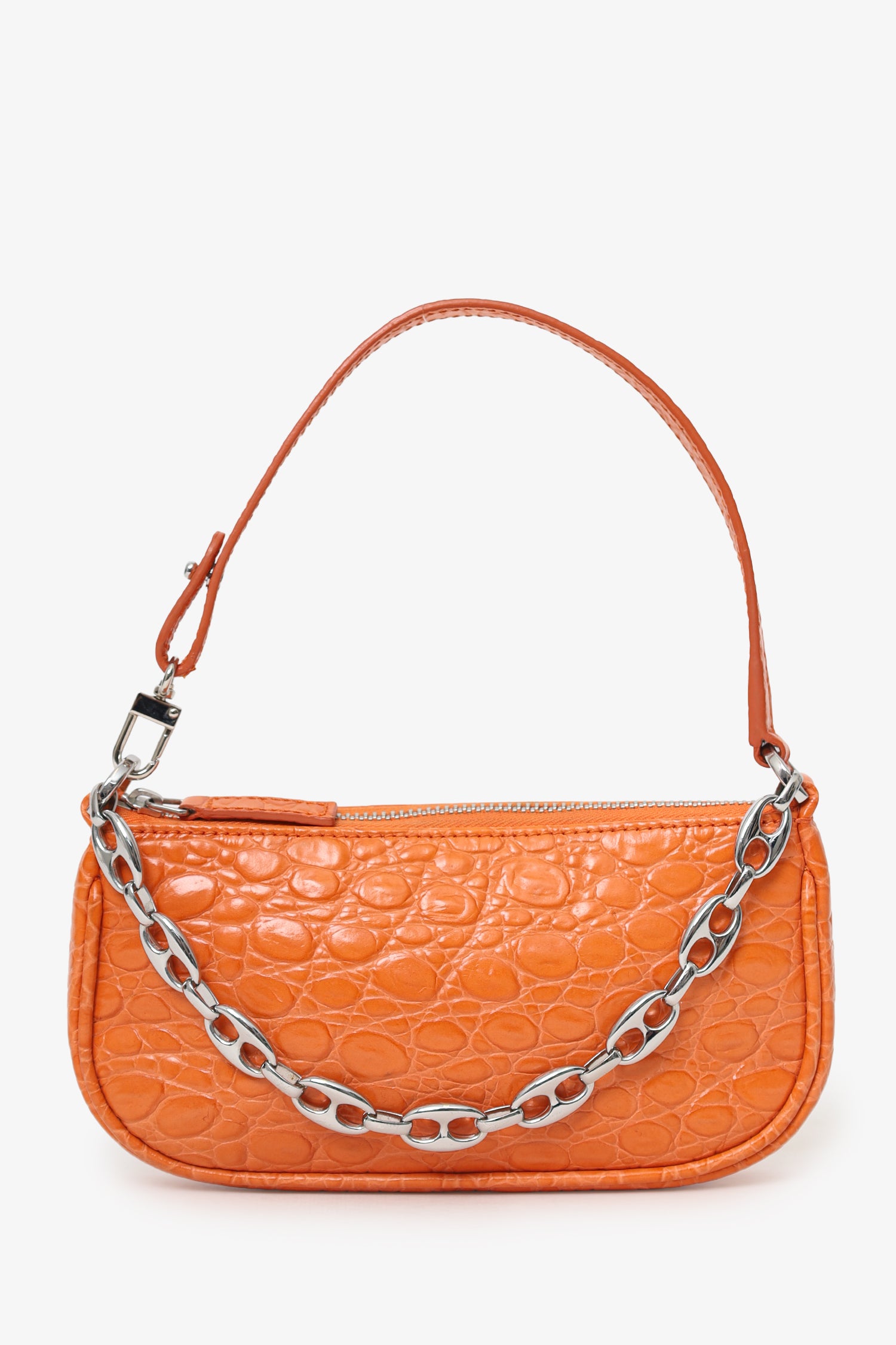 Refresh availabilityBy Far Orange Embossed Mini Rachel Bag. Top zip closure. Chain link strap. Removable strap with clasp closure. Lined interior. Open interior. Silver-tone hardware. Tonal stitching.