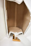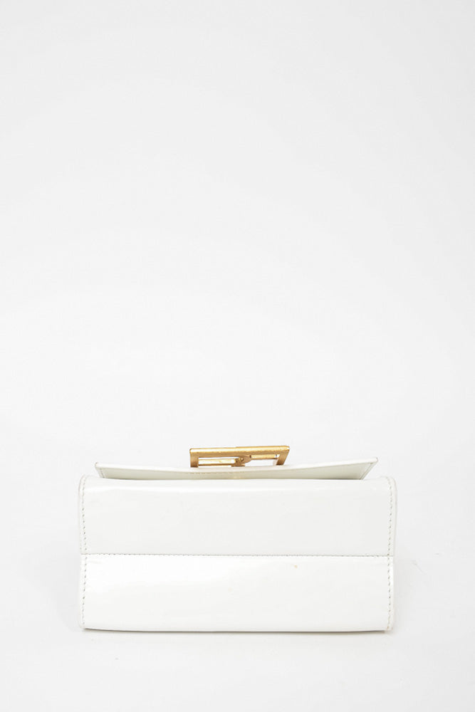 By Far White Patent Leather 'Fran' Shoulder Bag. Front foldover flap with magnetic button closure. Beige textile interior lining. Open interior. Adjustable strap. Gold-tone hardware. Tonal stitching.