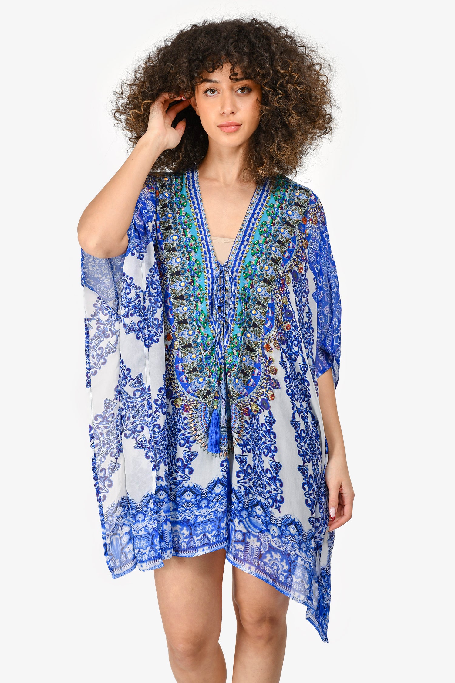 Camilla Blue Rhinestone Embellished Silk Kaftan Size One Size
