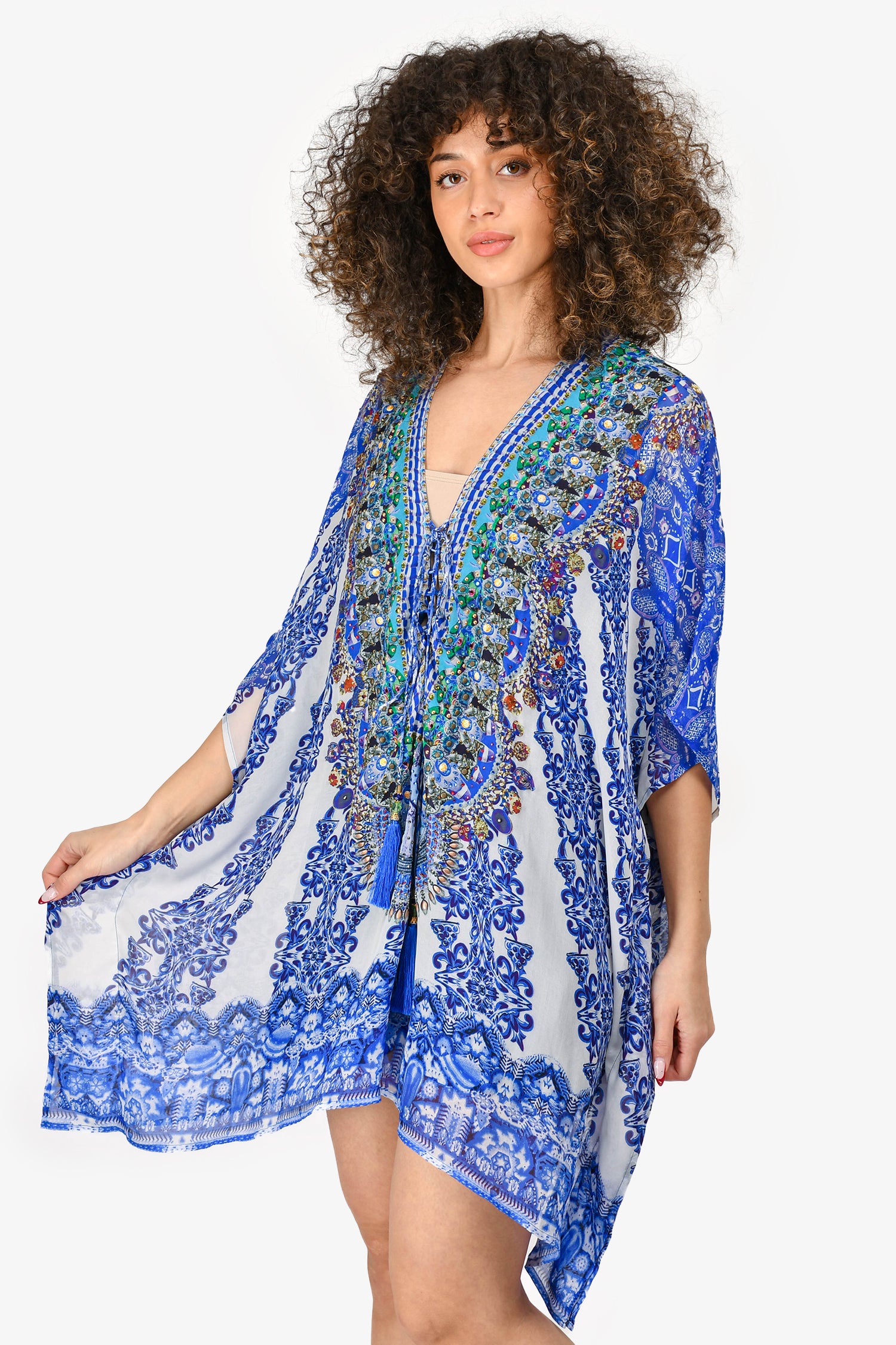 Refresh availabilityCamilla Blue Rhinestone Embellished Silk Kaftan Size. Front tie-up closure. Gold-tone hardware. Tonal stitching.