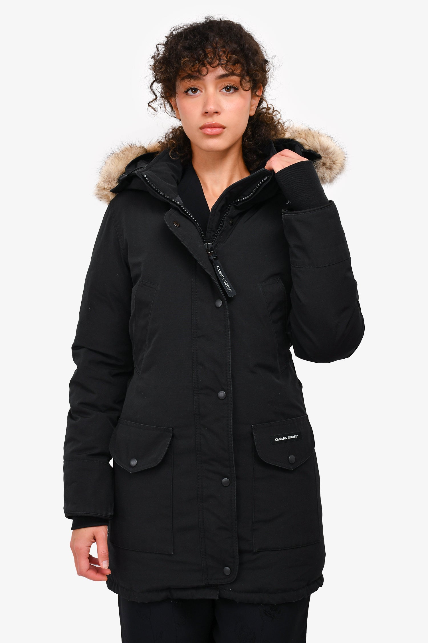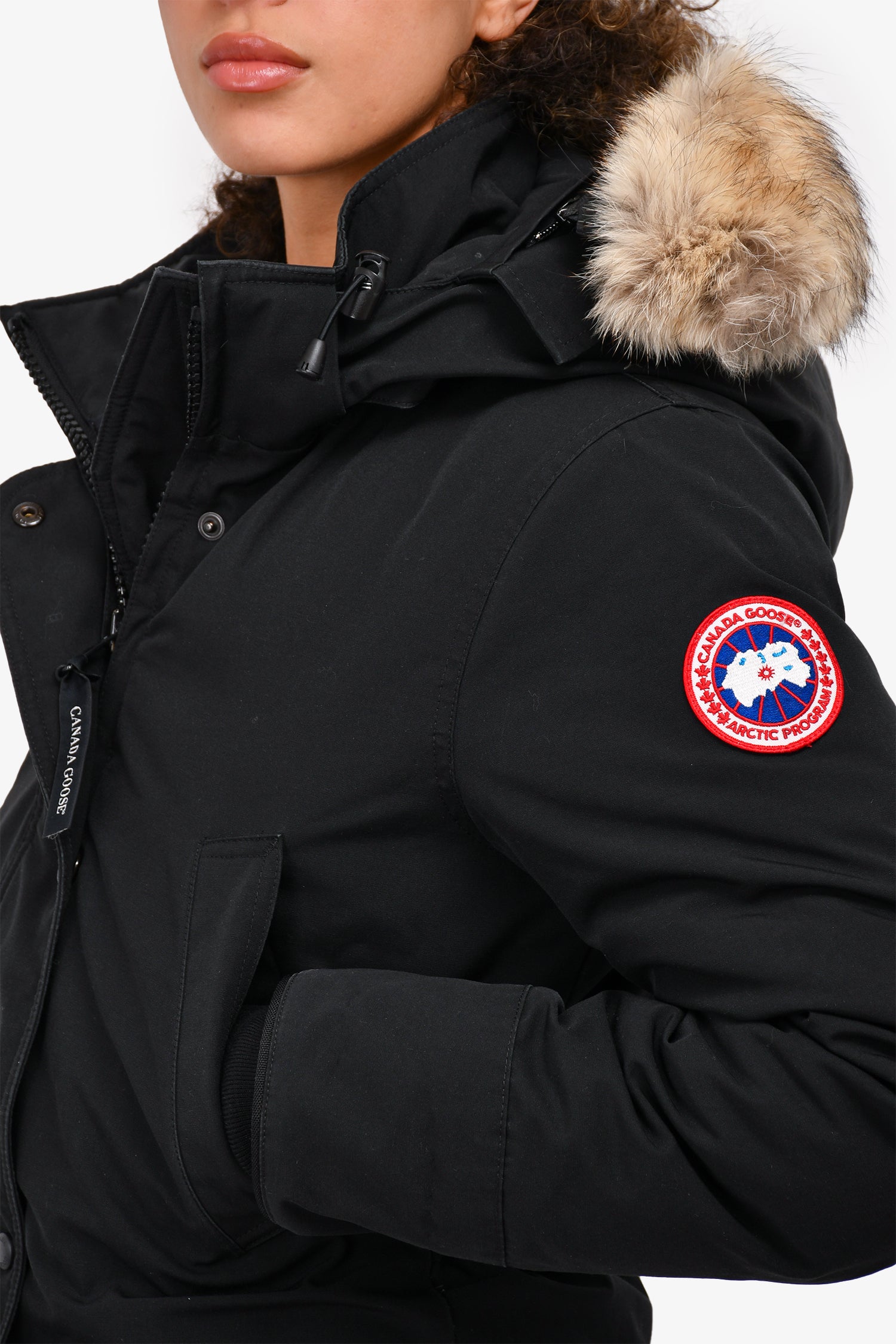 Refresh availabilityCanada Goose Black Down Puffer Jacket with Fur Hood. Front two-way and snap-button zip closures. Front pockets with snap-button closure. Brand logo patch on the left sleeve. Removable fur trim with zip closure. Ribbed cuffs. Lined. Tonal stitching.