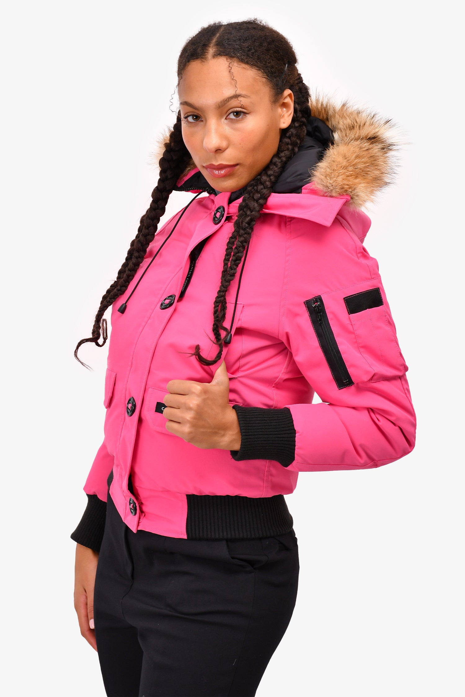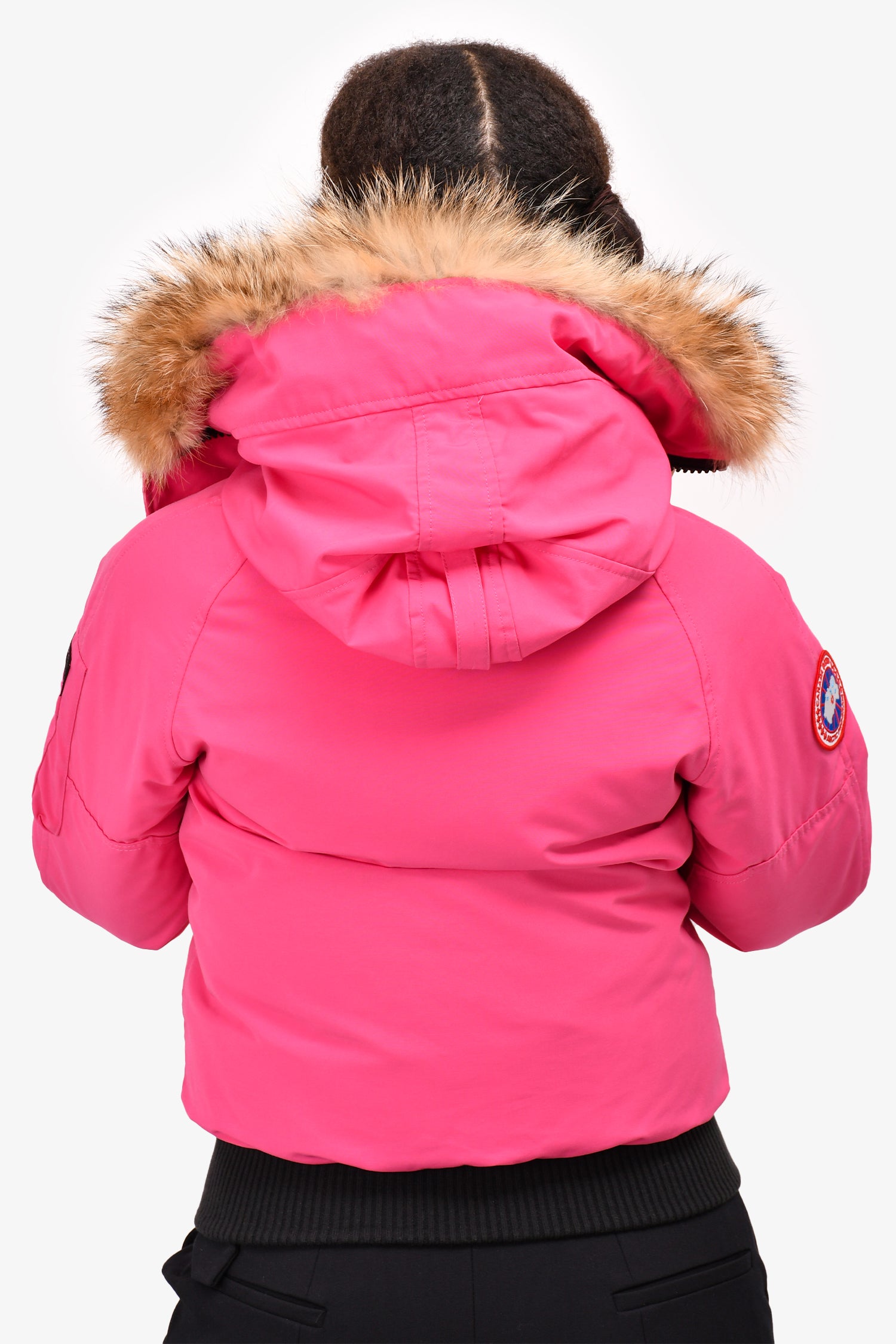 Refresh availabilityCanada Goose Pink Chilliwack Bomber Jacket. Front zipper and button-up closure. Adjustable straps on the hood. Four front pockets. Zipper pockets on one shoulder. Interior handle straps. Tonal stitching.
