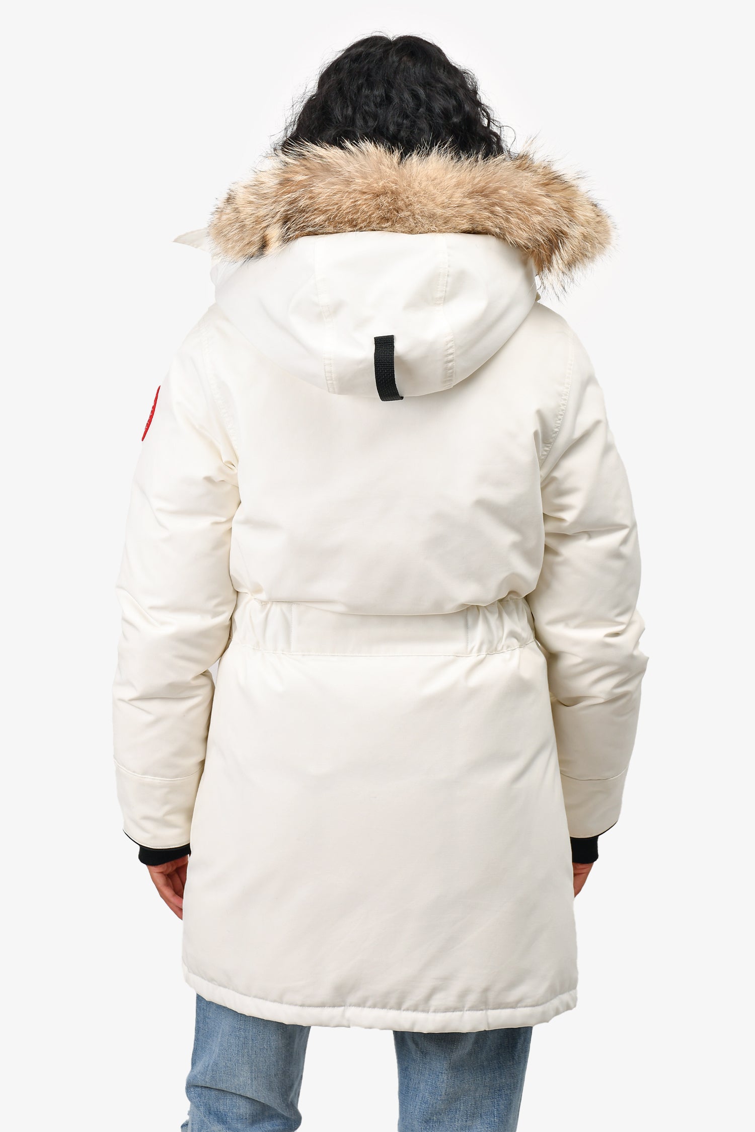 Refresh availabilityCanada Goose White Shelburne Fur Hooded Parka Down Coat. Front two-way zip and snap-button closure. 2 front pockets with snap-button closure. Brand logo patch on left sleeve. Removable hood and fur trim with zip closure.