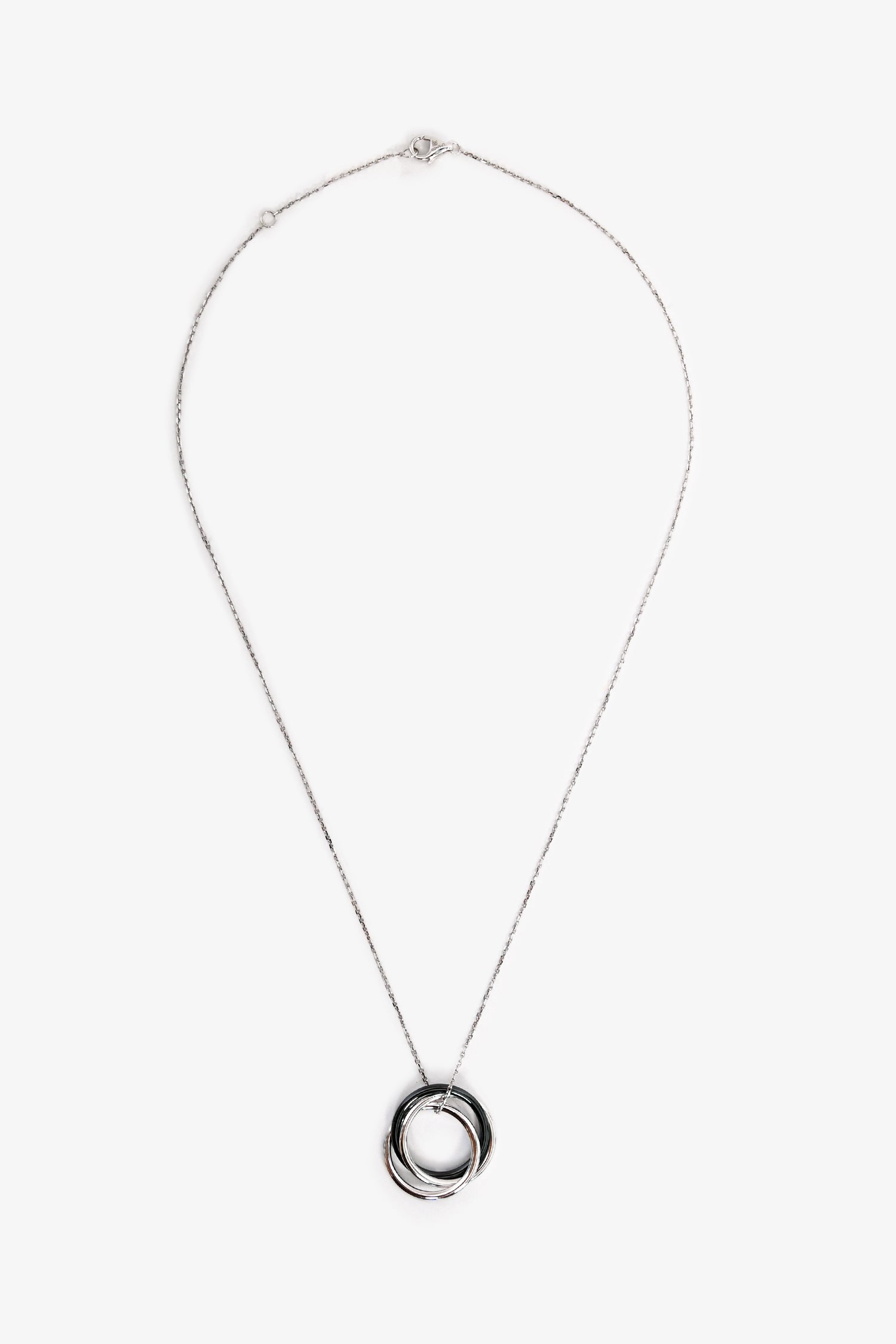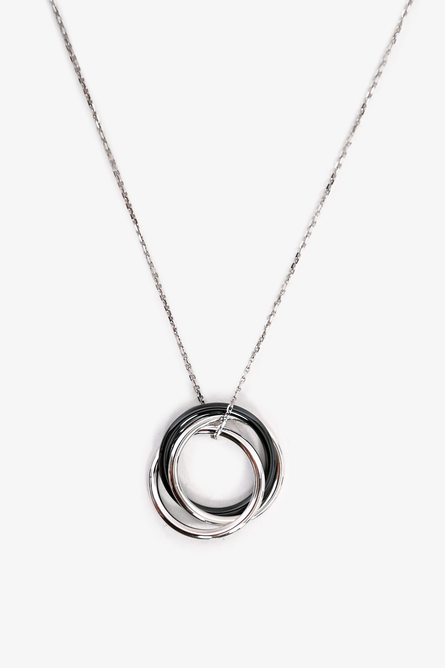 Refresh availabilityCartier Trinity Diamond Black Ceramic 18K White Gold Necklace with Pendant. 1 single Diamond, White Gold, and Ceramic pendant on a chain link necklace. Lobster clasp closure.