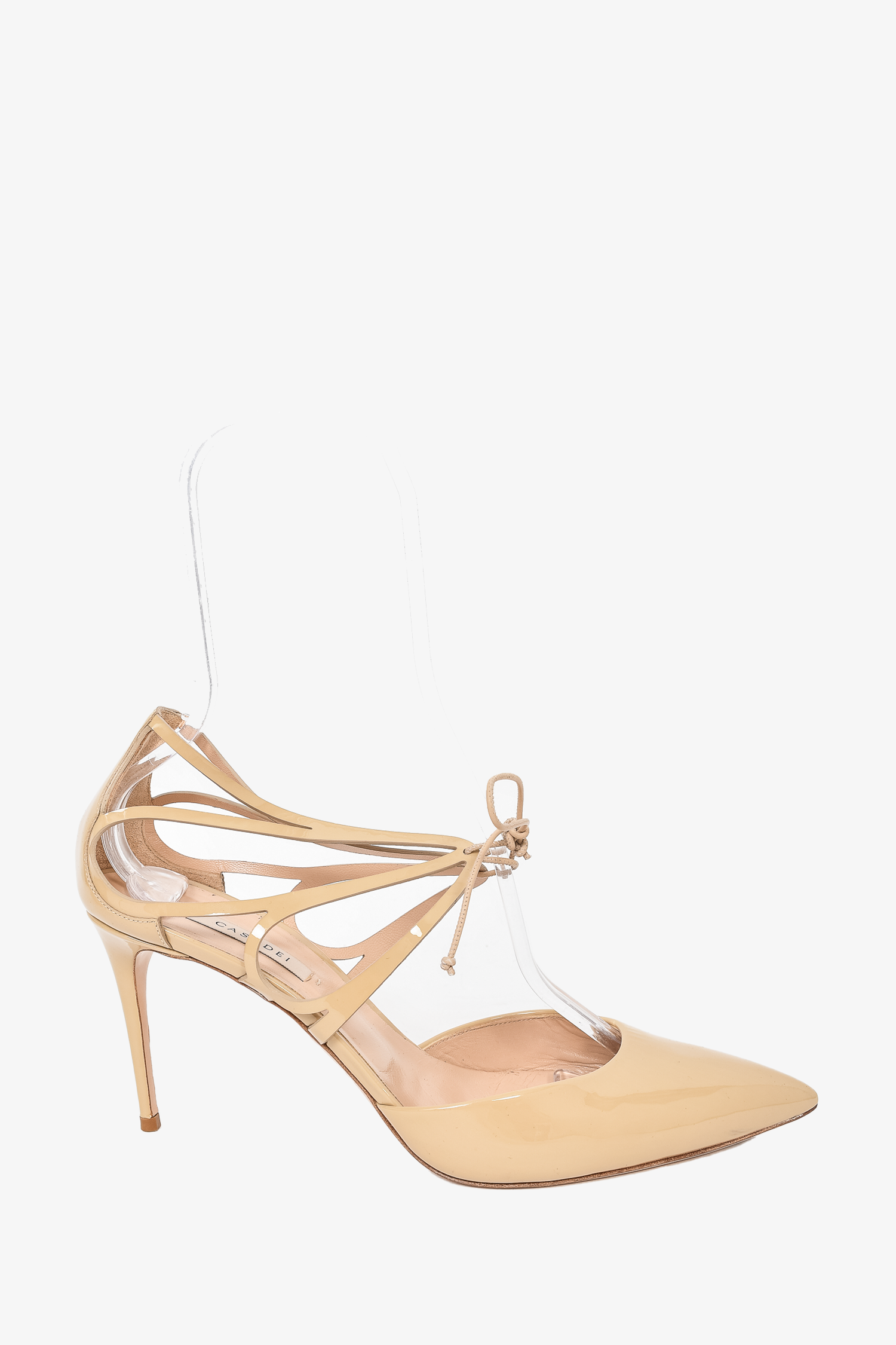 Refresh availabilityCasadei Beige Patent Strappy Pointed Toe Heels. Glossy finish. Tonal stitching.