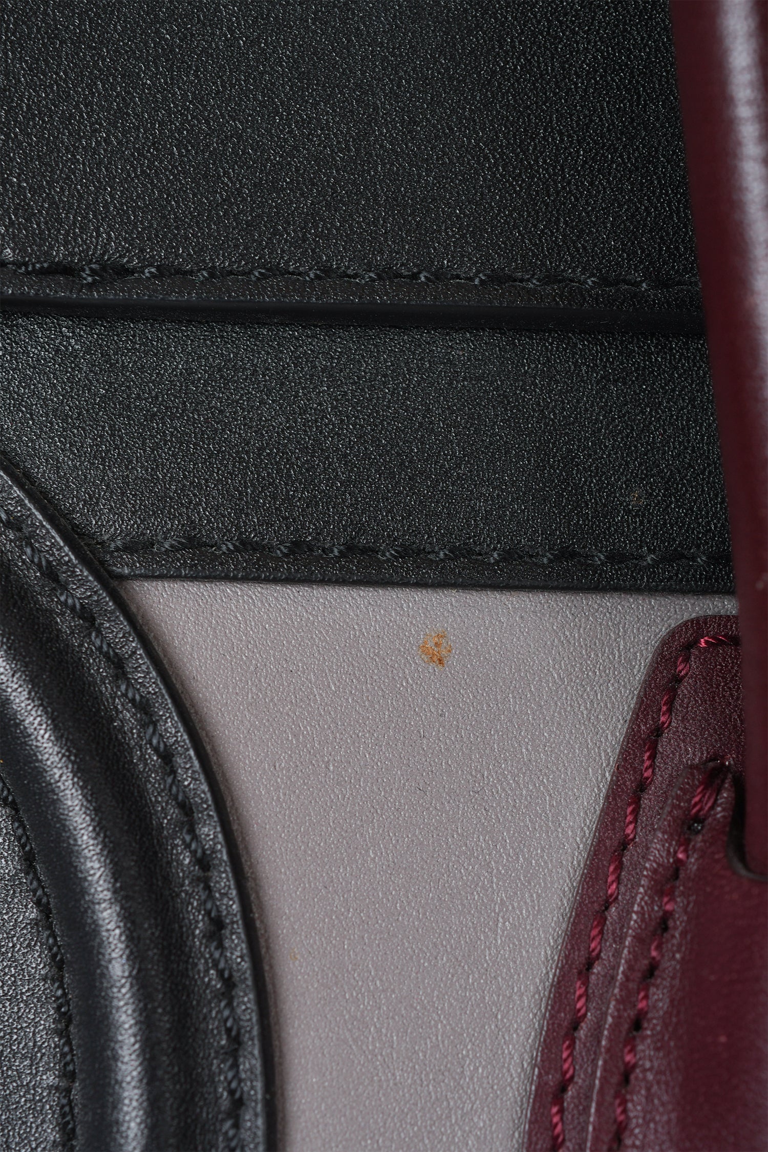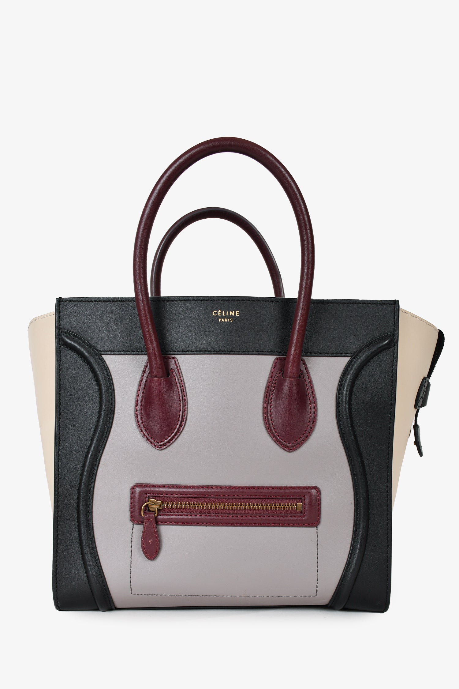 Refresh availabilityCeline 2011 Black/Burgundy/Grey Leather Medium Luggage Tote. Rolled twin handles. Top zipper closure. 2 slip pockets. 1 interior zip closure. Gunmetal-toned hardware. Tonal stitching.