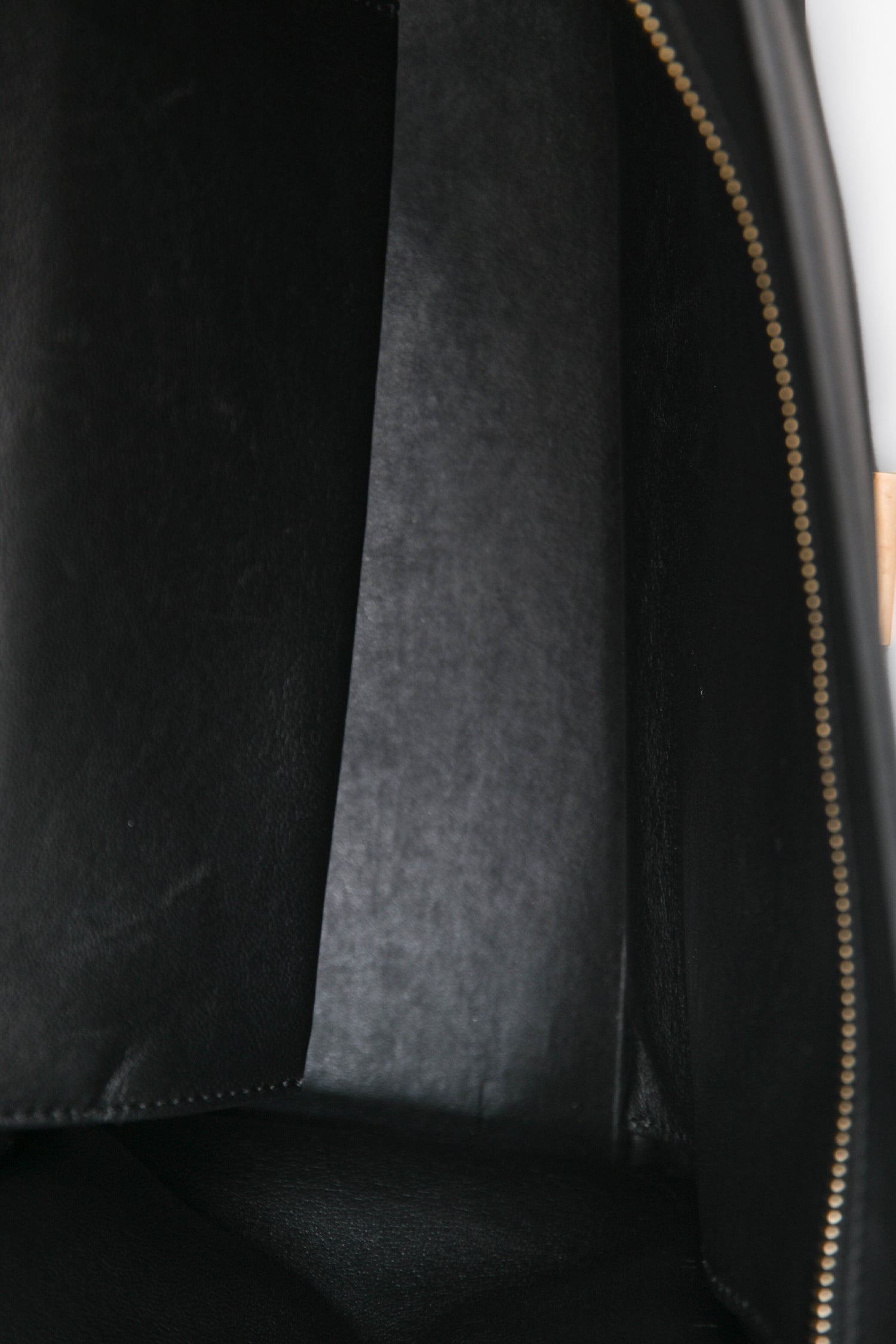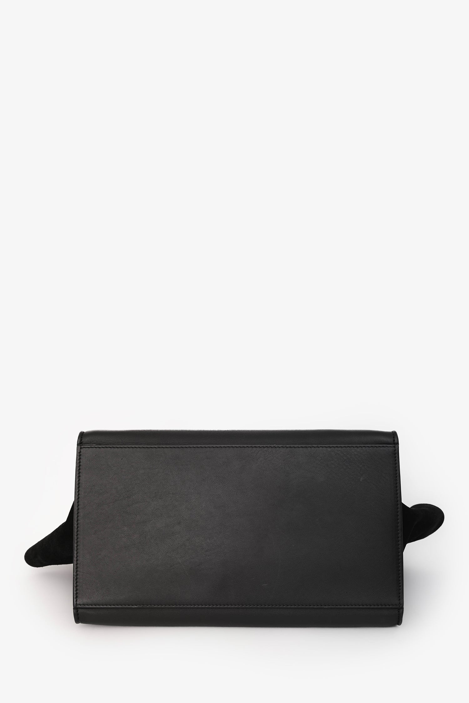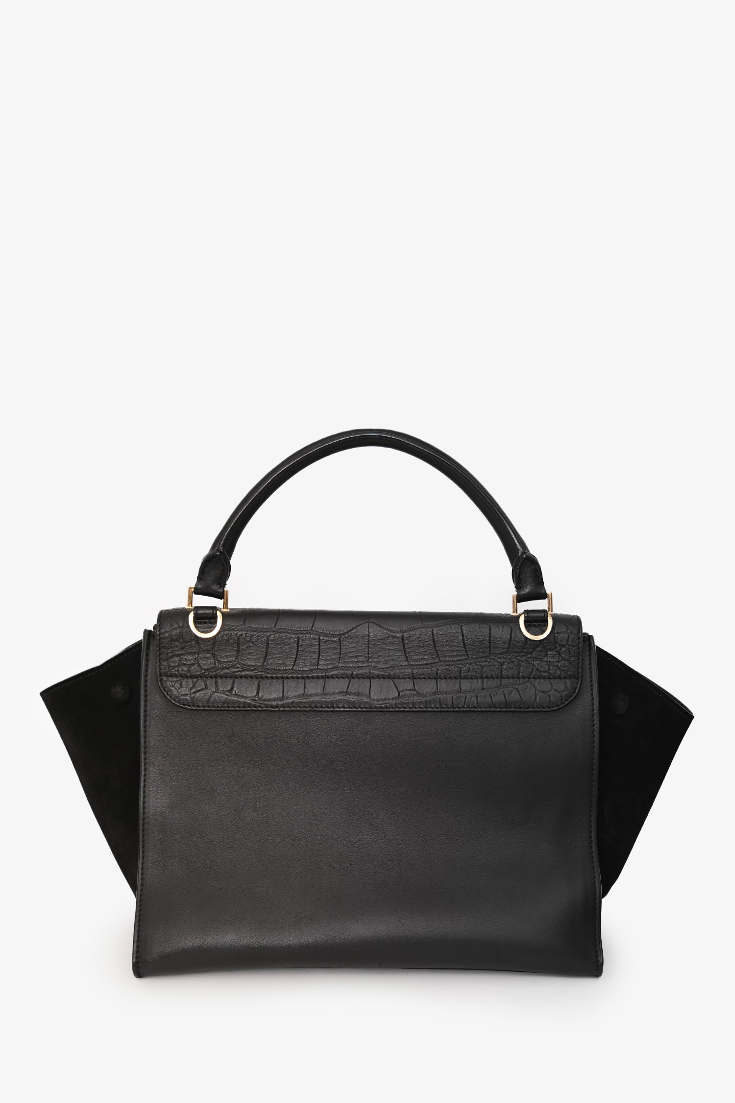 Refresh availabilityCeline Black Croc-Embossed Leather Medium Trapeze Shoulder Bag. Front fold-over flap with clasp closure. Single top handle. Detachable shoulder strap. Suede sides with snap closures. 1 interior zip pocket. Main compartment with zipper closure. 1 interior slip pocket. Gold-tone hardware. Tonal stitching.