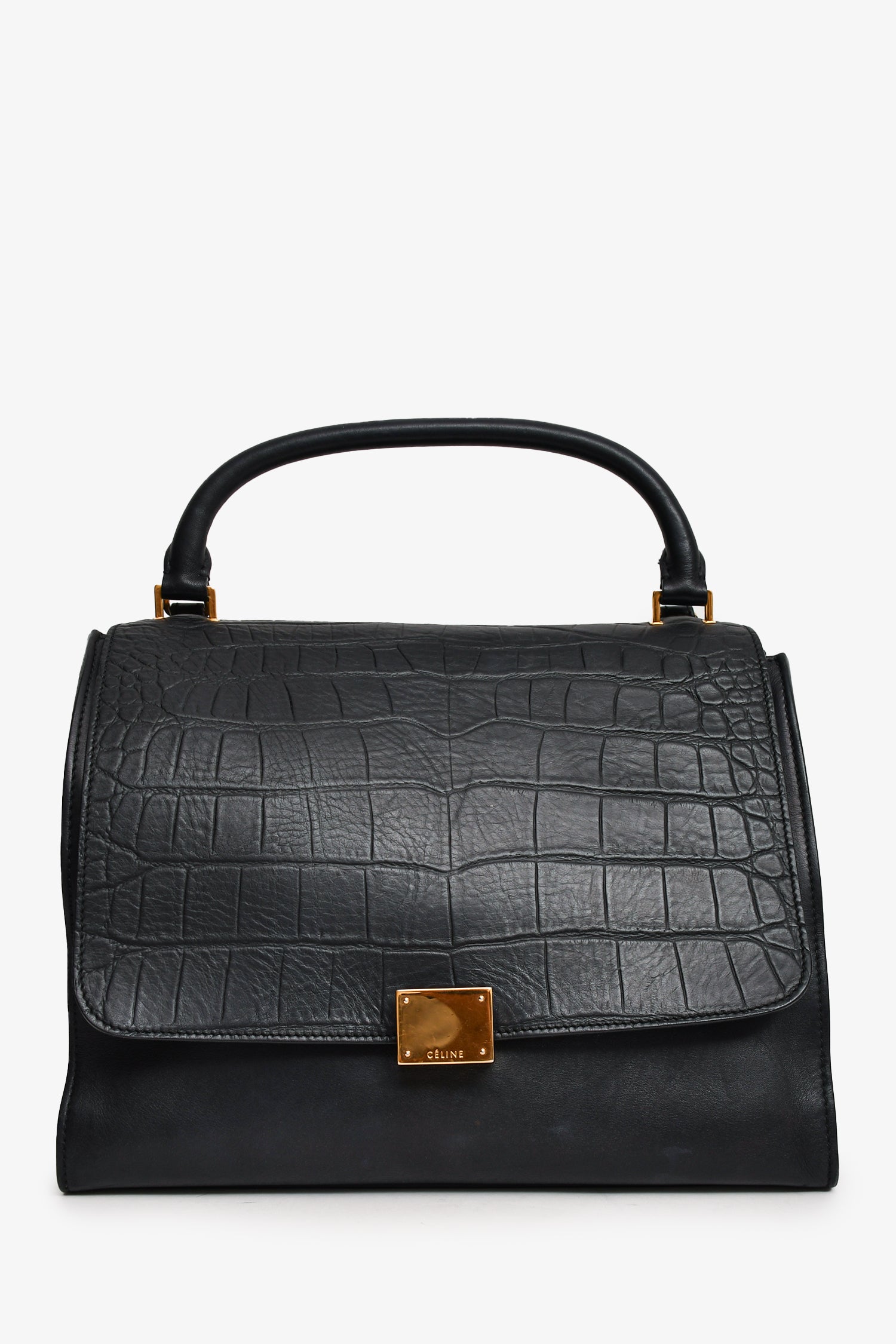 Refresh availabilityCeline 2012 Black Croc Embossed Leather Trapeze Bag. Gold-tone flip-lock closure. Single rolled top handle. Fold-over croc flap. 2 interior zippers. Single slip pocket. Suede lined sides. Attachable strap. Leather trimming. Tonal stitching.