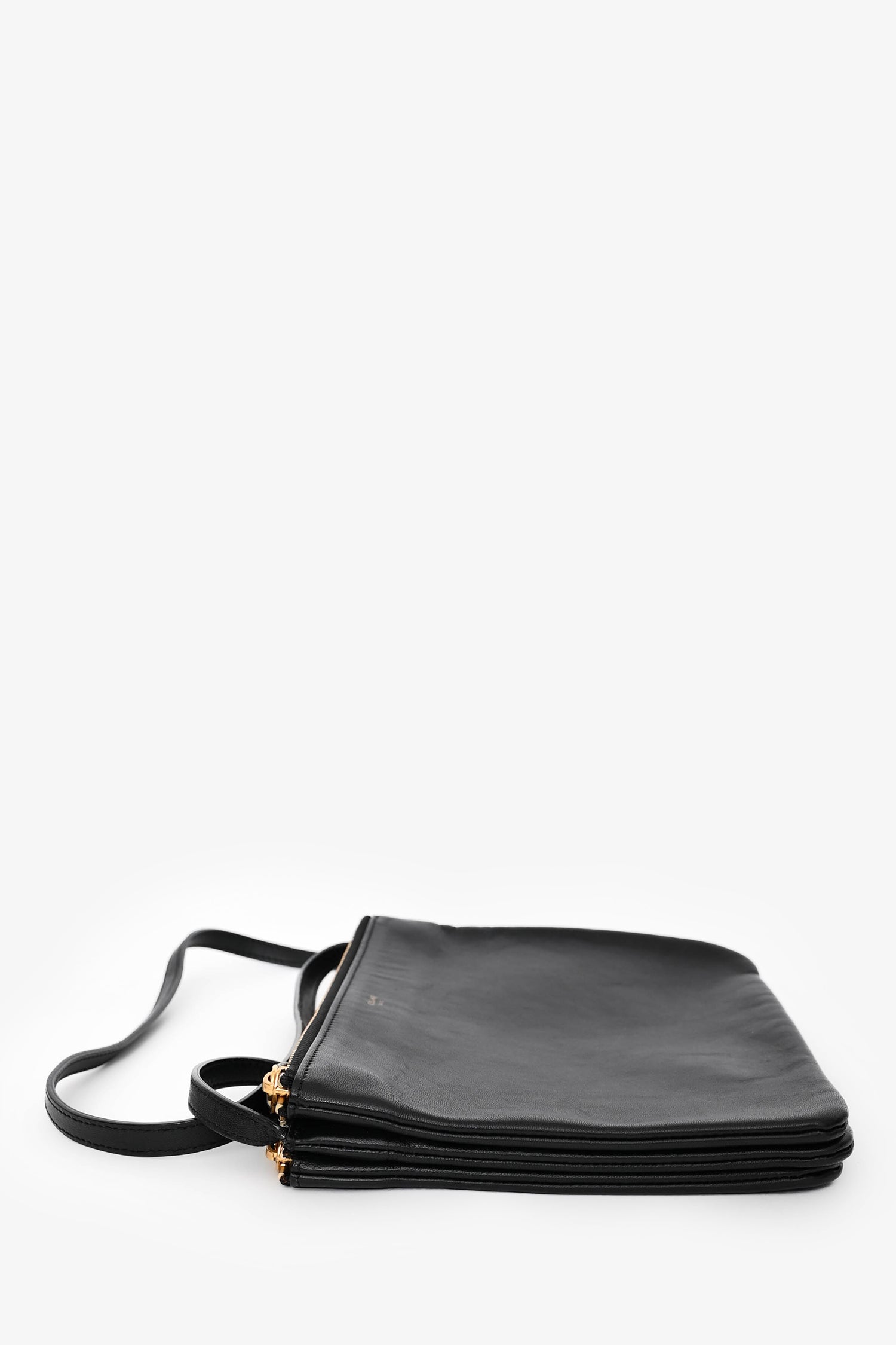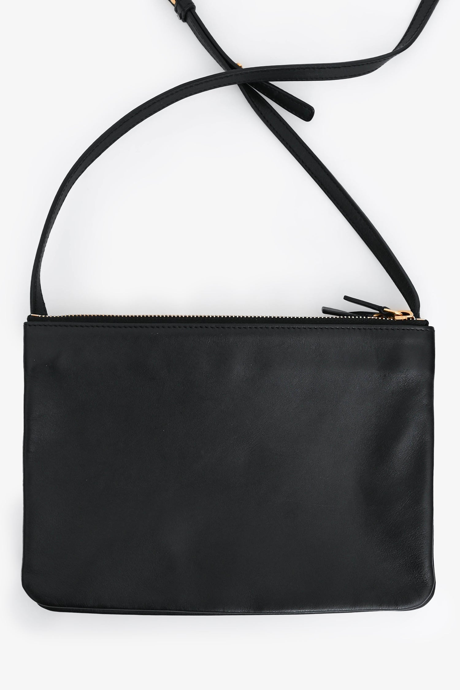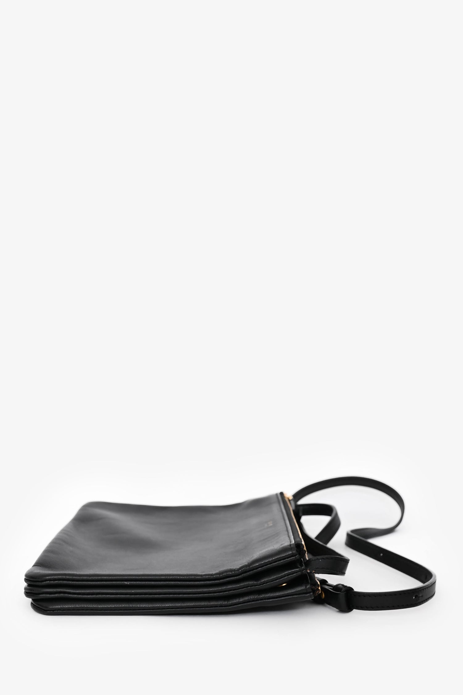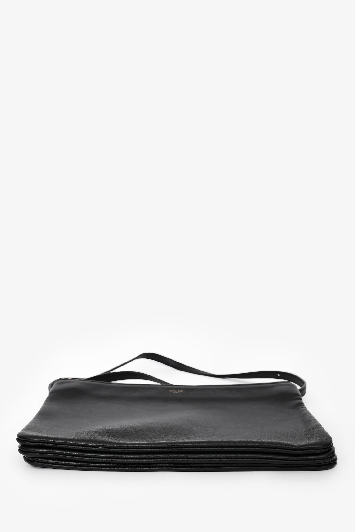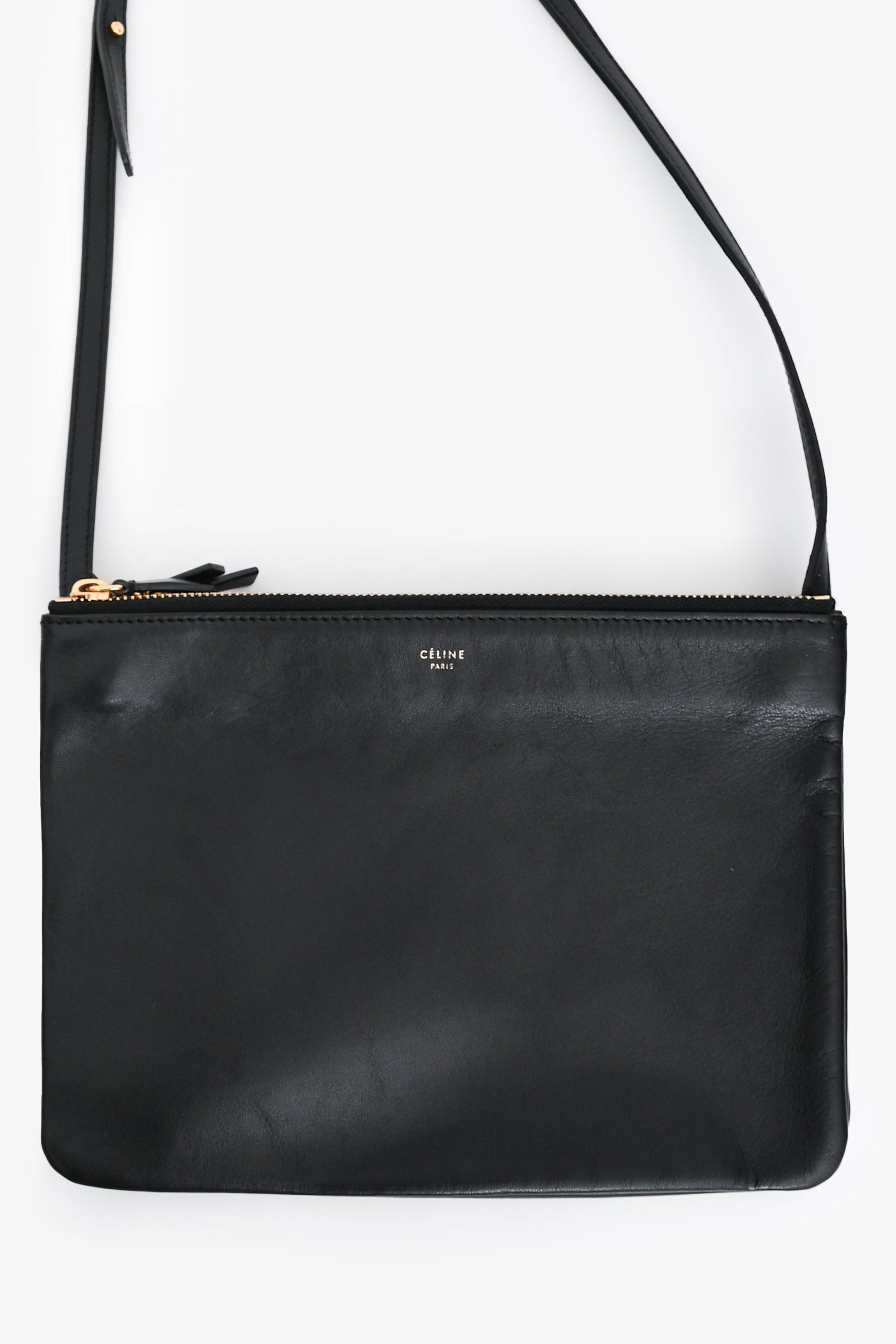 Refresh availabilityCeline 2014 Black Leather Medium Trio Crossbody. Top zip closures. Three detachable compartments with snap-button closures. Gold-tone hardware. Adjustable strap with push-tab closures. Open interior.