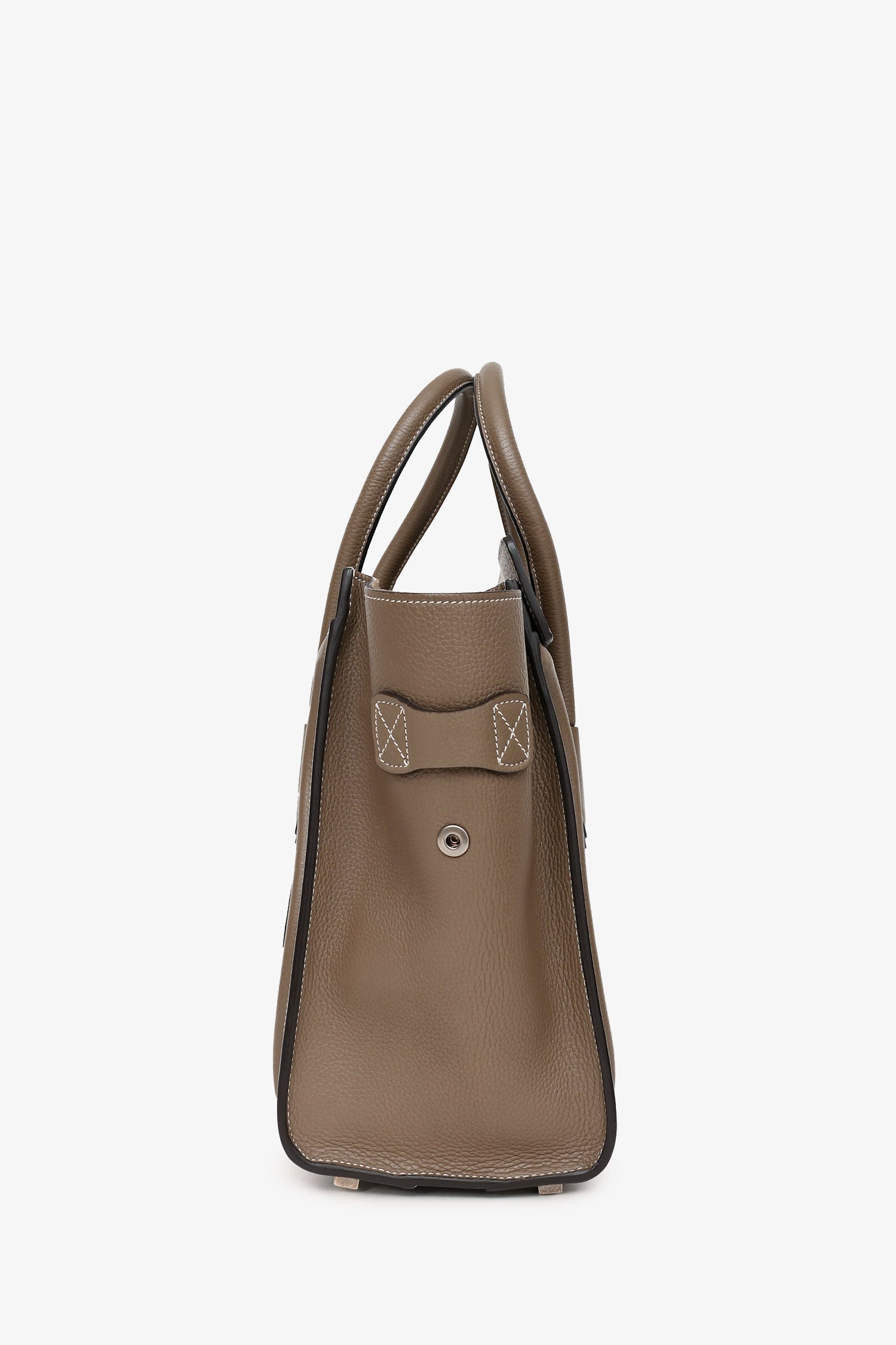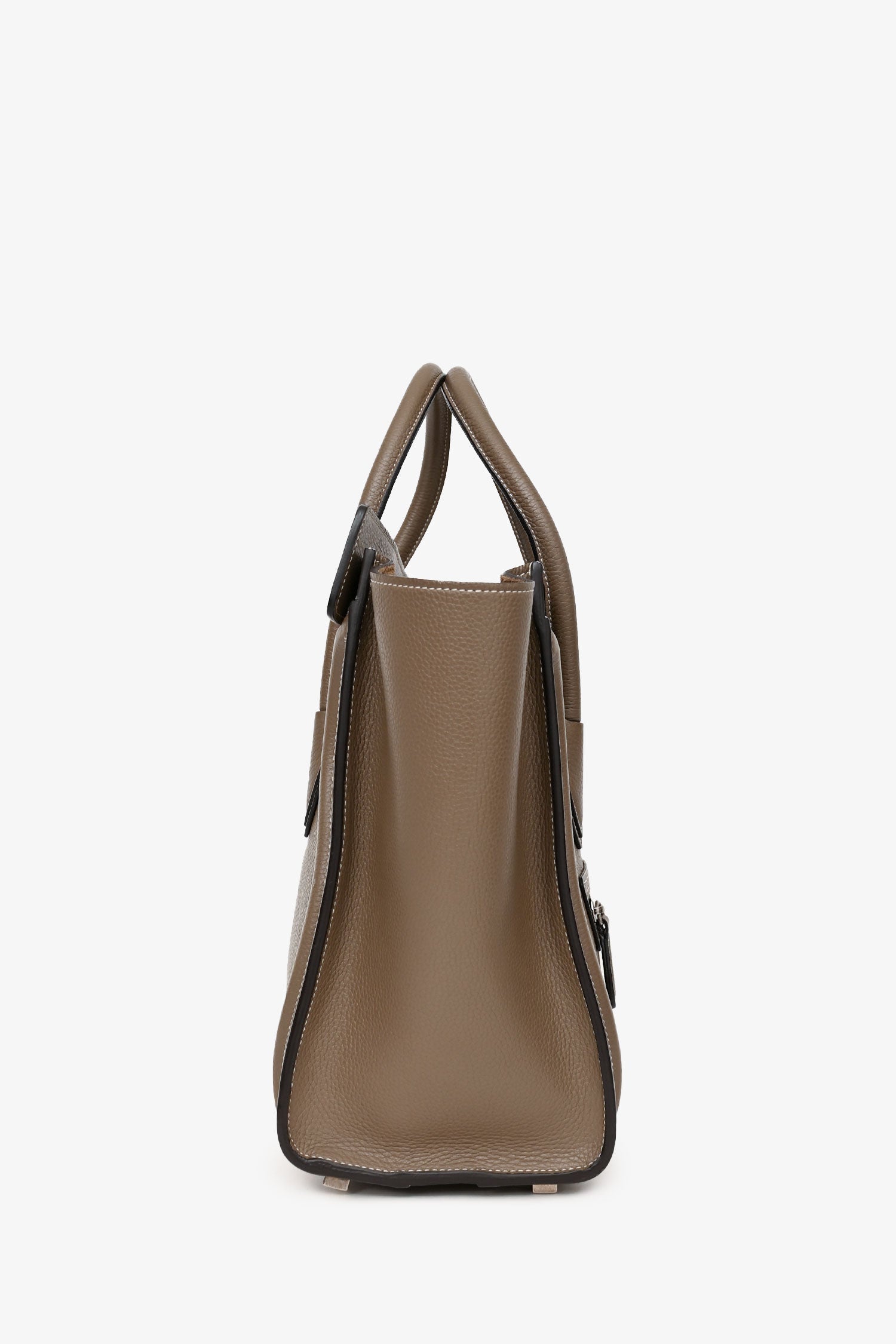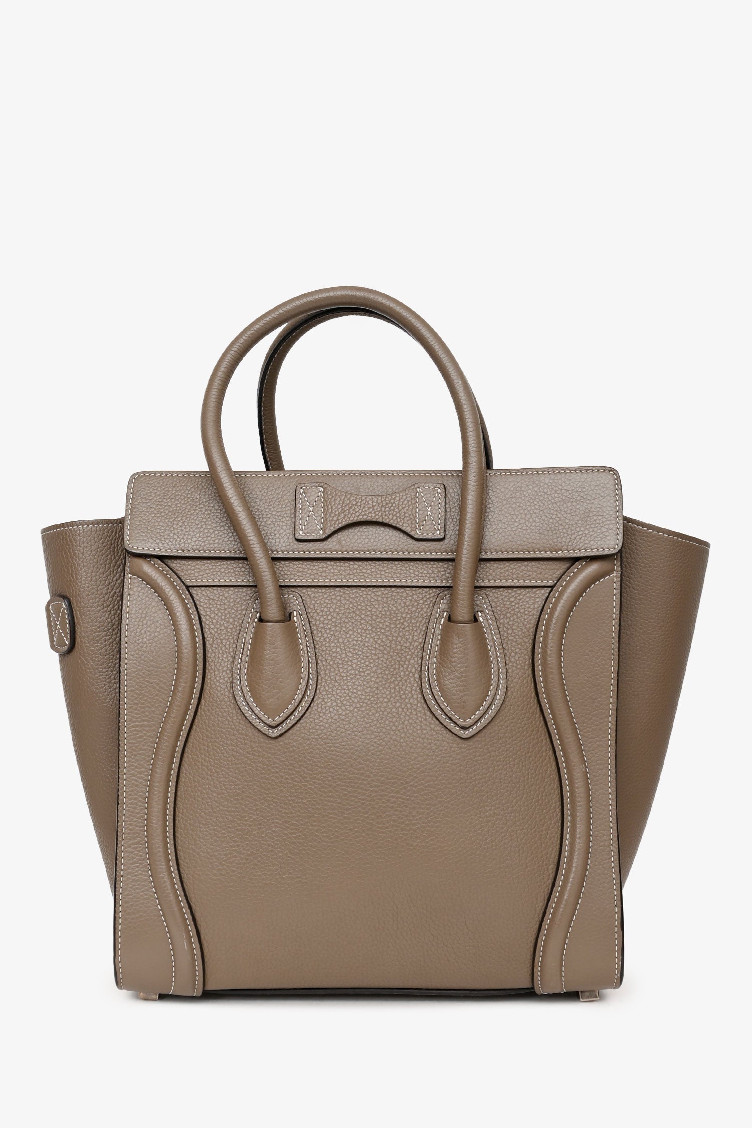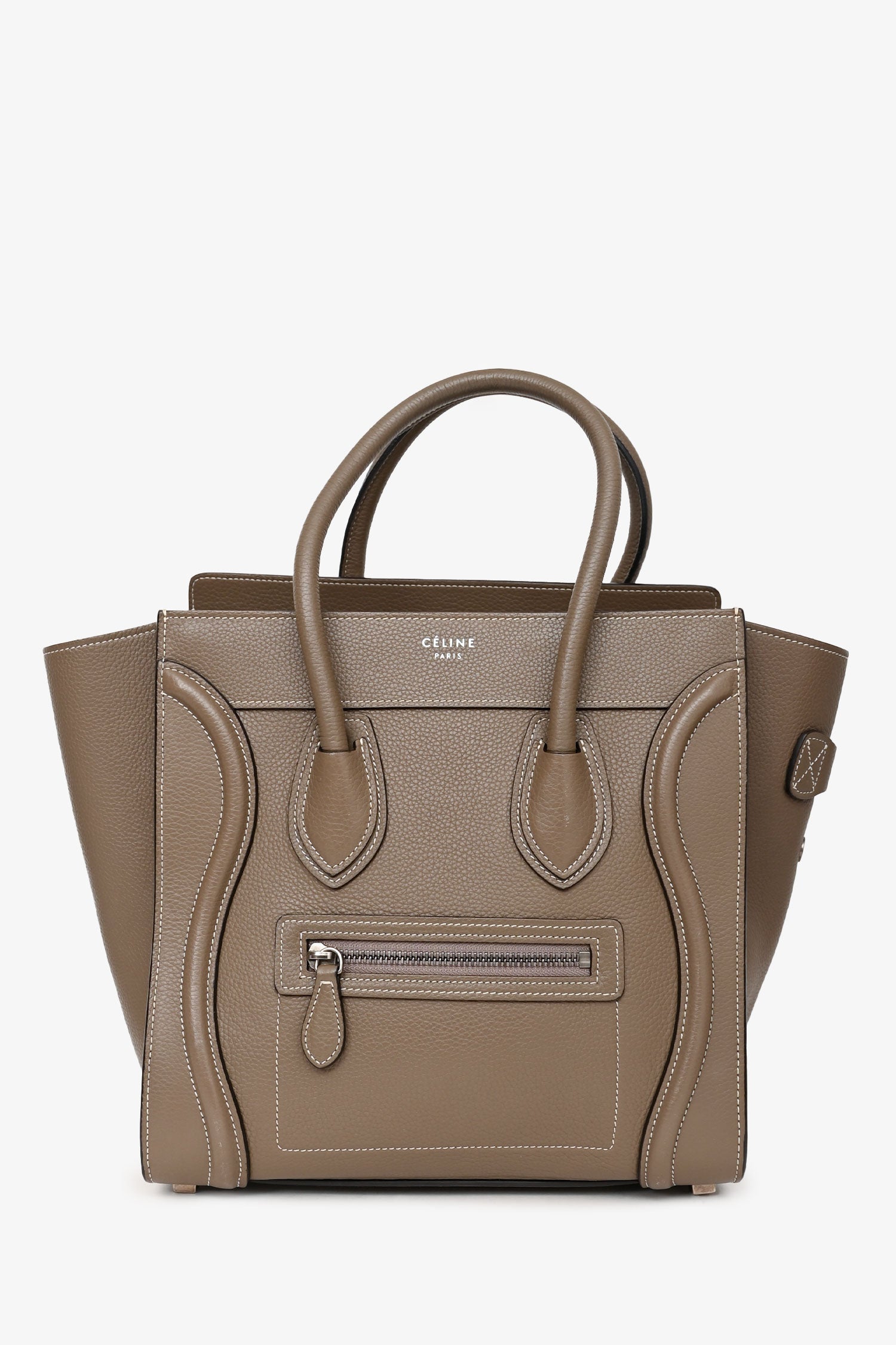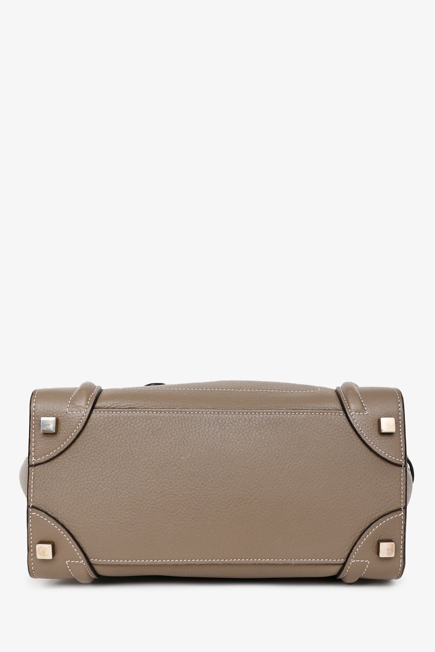 Refresh availabilityCeline 2014 Taupe Leather Mini Luggage Bag. 2 rolled top handles. Zipped top. Zipped exterior compartment. Lined suede interior with 2 pockets and a zipped compartment. Coated trim. Contrast stitching.