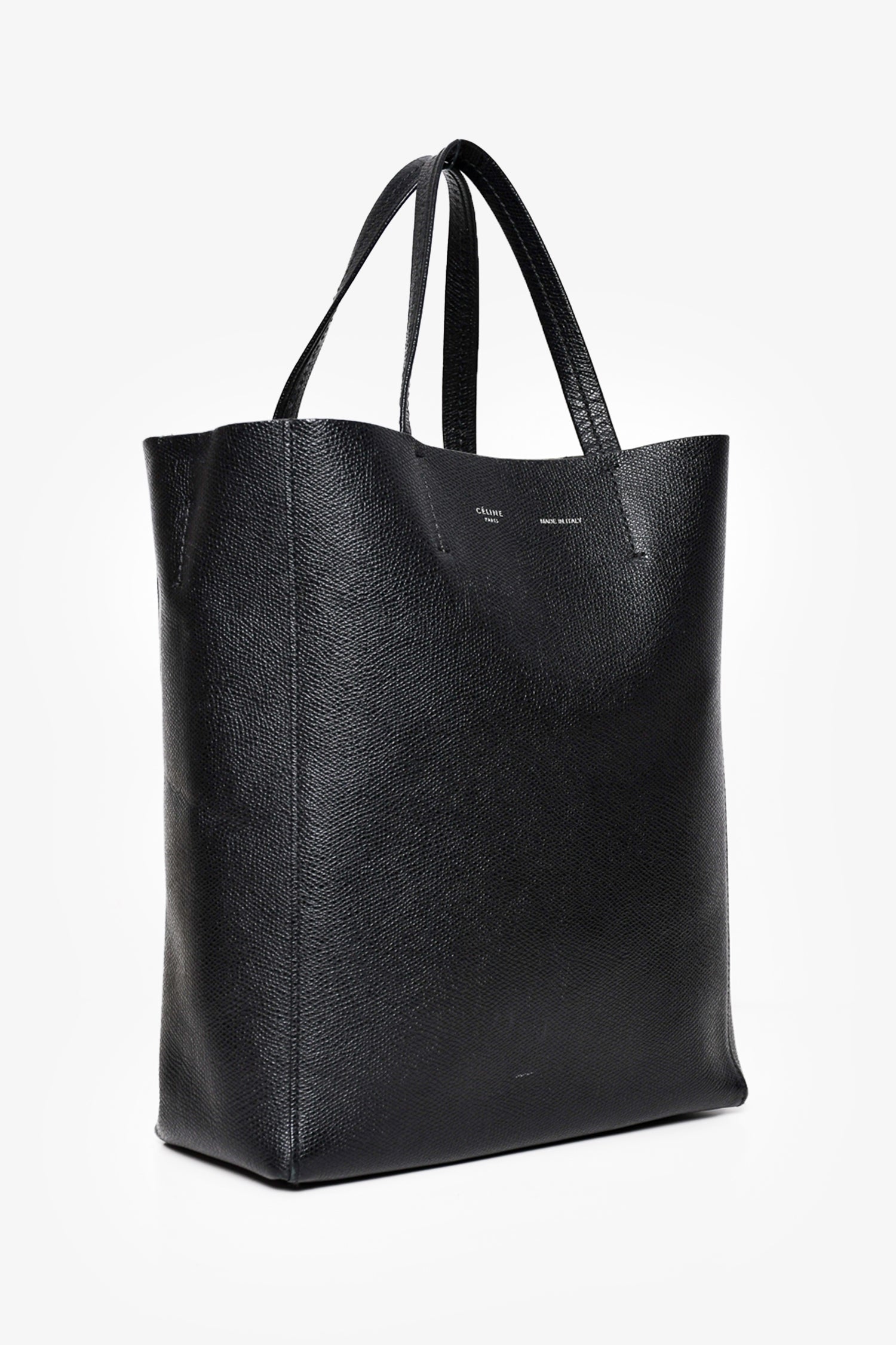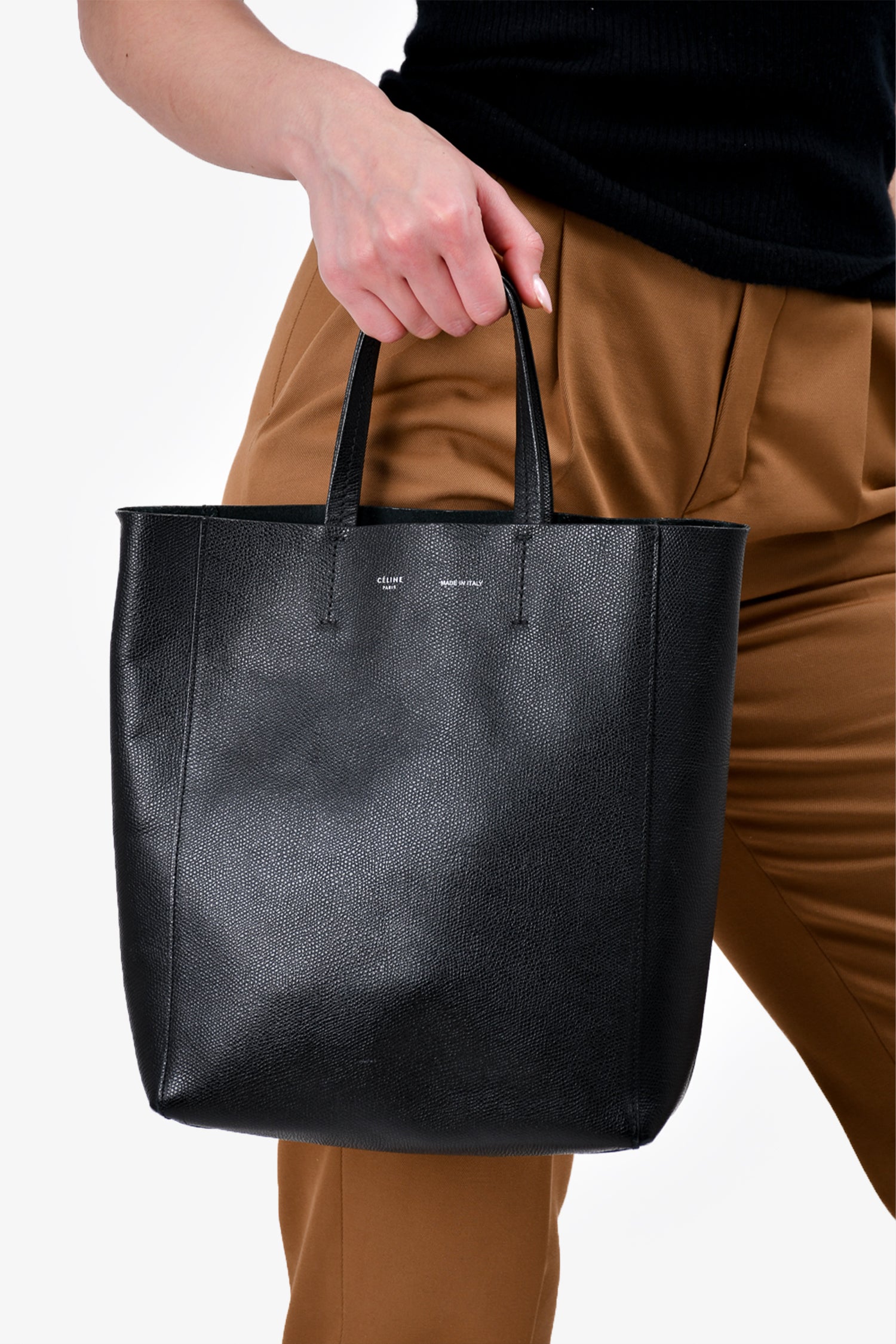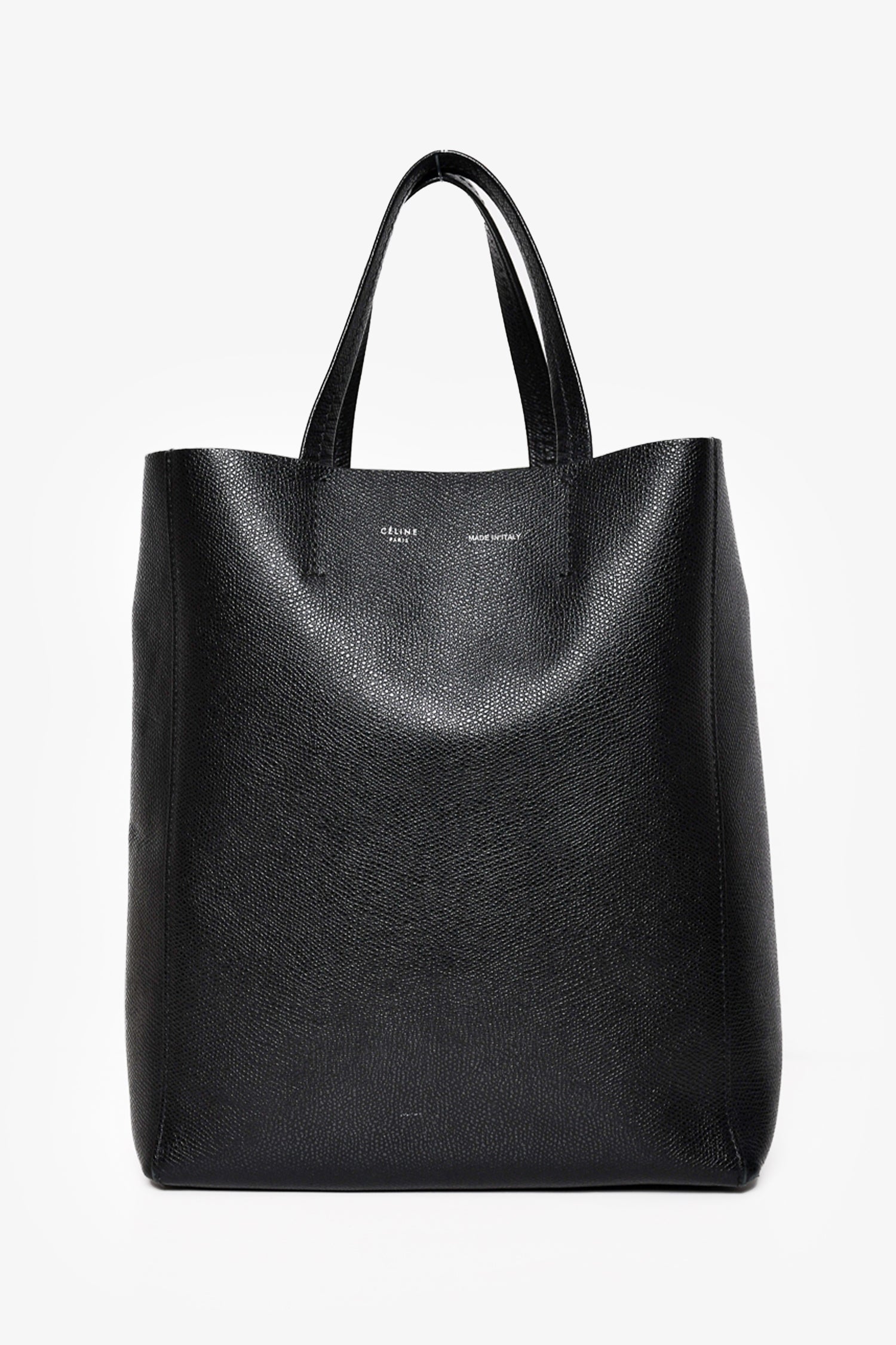 Refresh availabilityCeline 2015 Black Leather Small Vertical Cabas Bag with Strap. Dual handles. Interior wall zip pocket. Silver-tone hardware. Removable and adjustable strap.