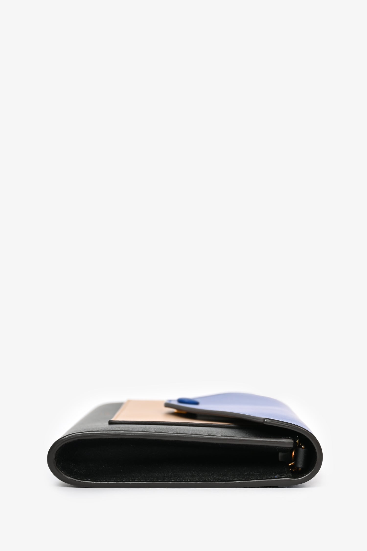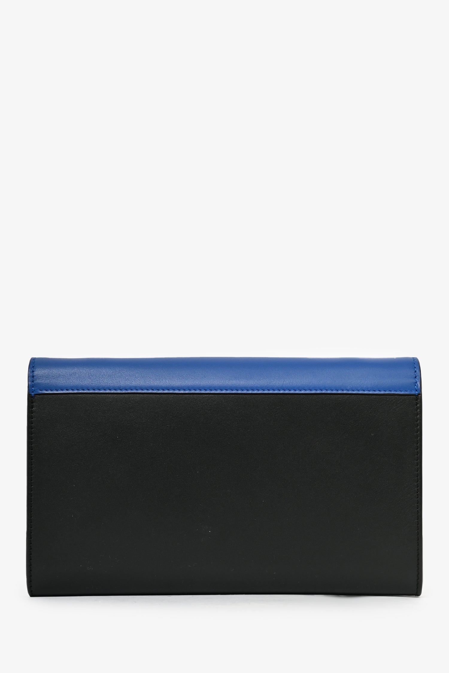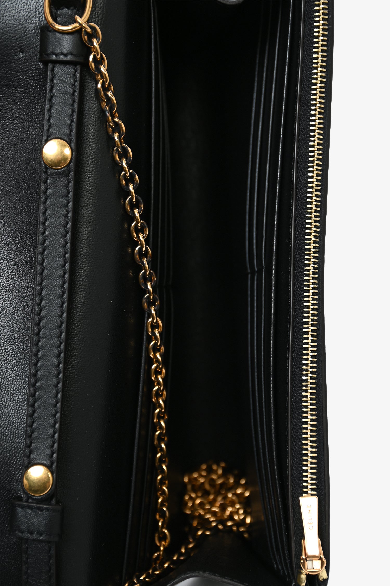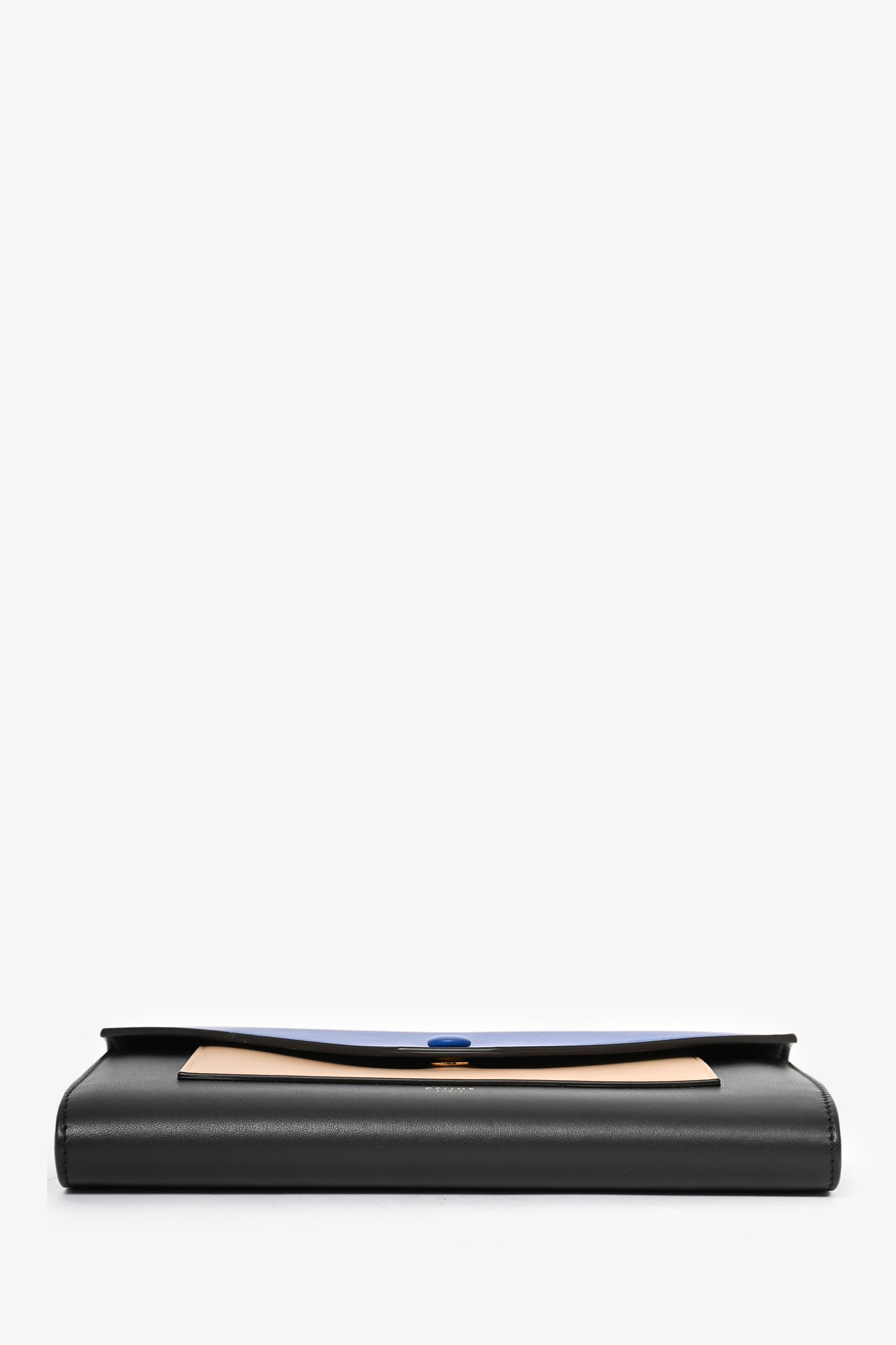 Refresh availabilityCeline 2015 Black Tricolor Leather Envelope Pocket Wallet on Chain. Front fold-over flap with snap-button closure. Front slip pocket. 2 wall billfold slip pockets. 12 card slots. Gold-tone hardware.