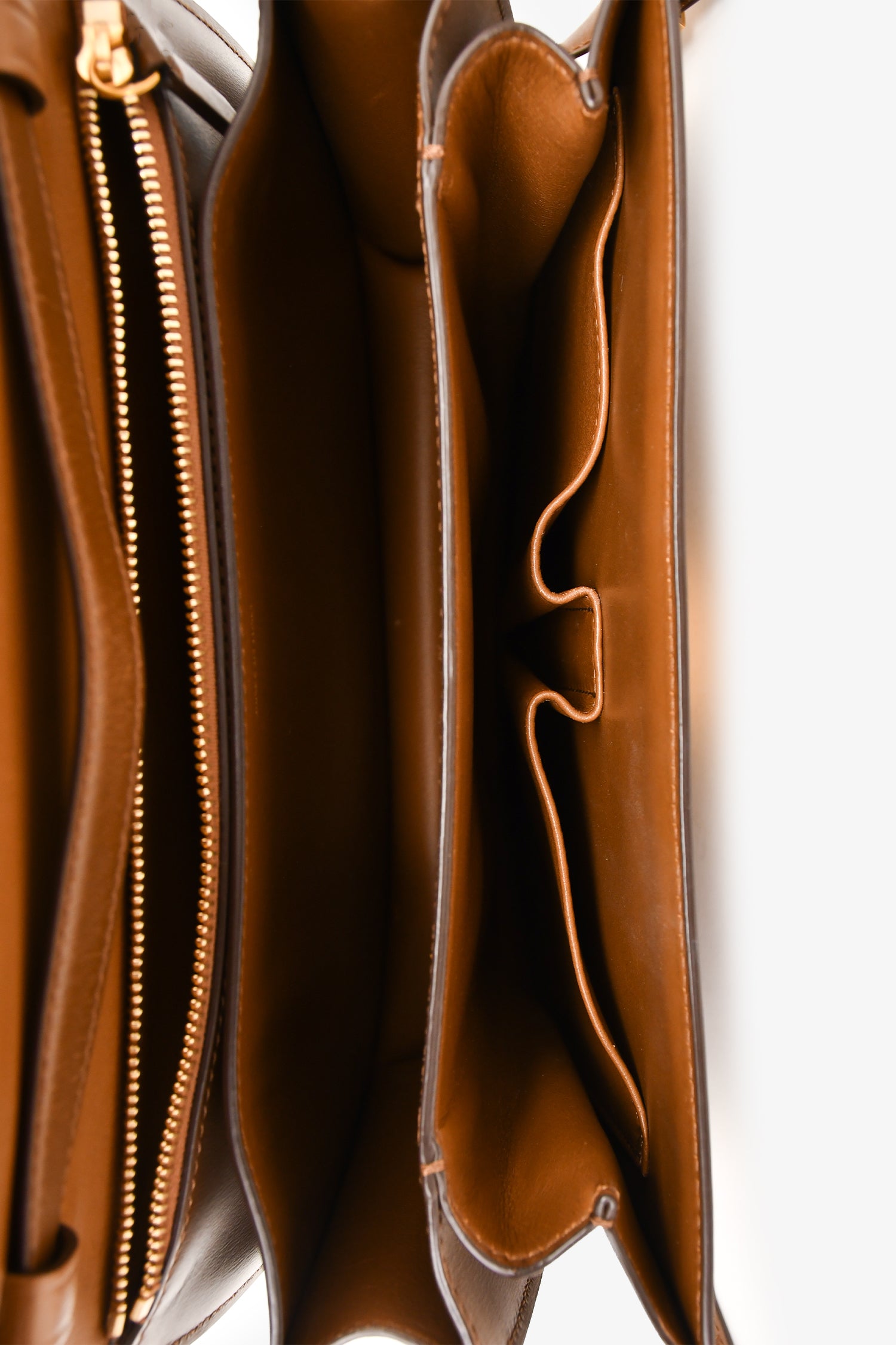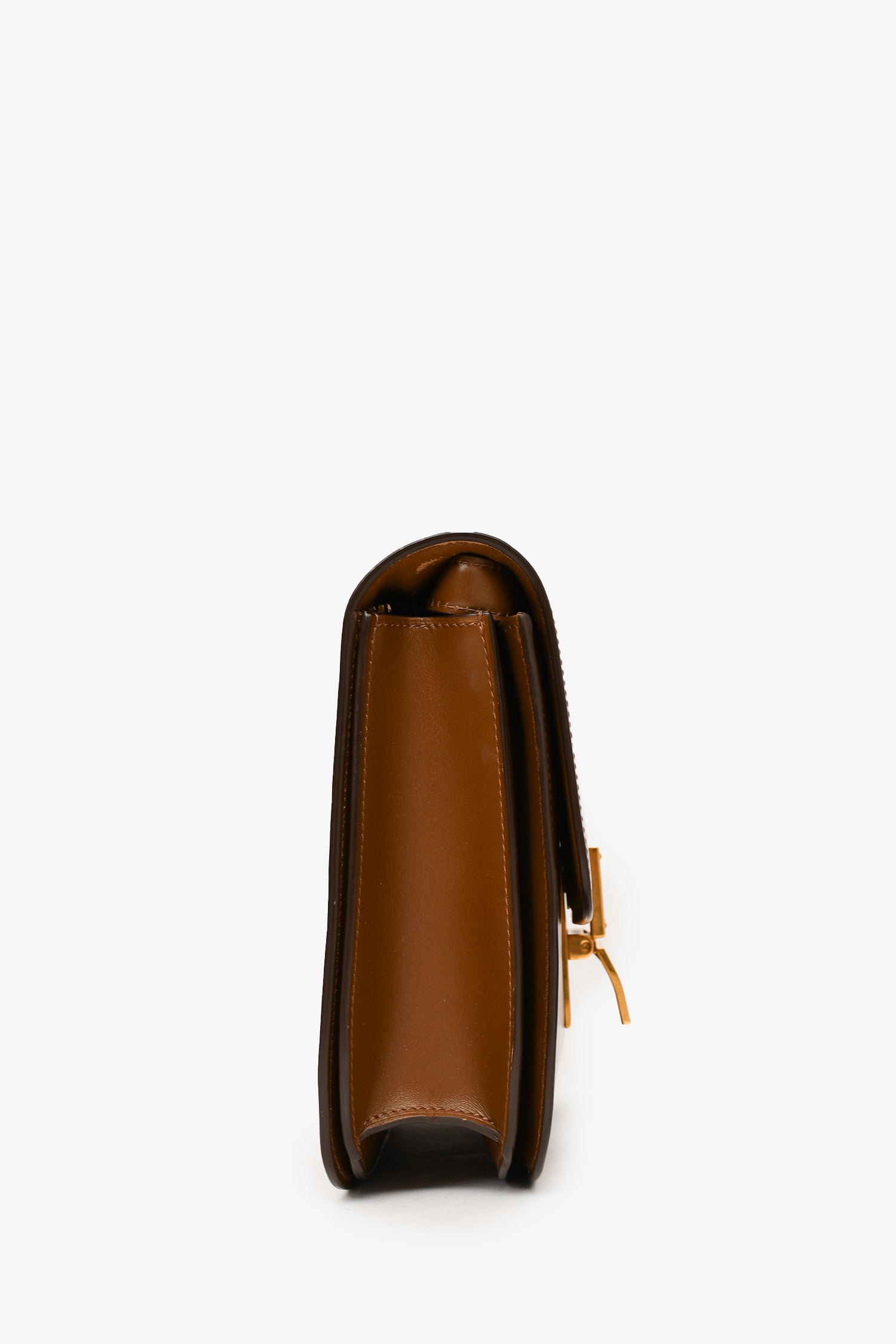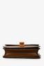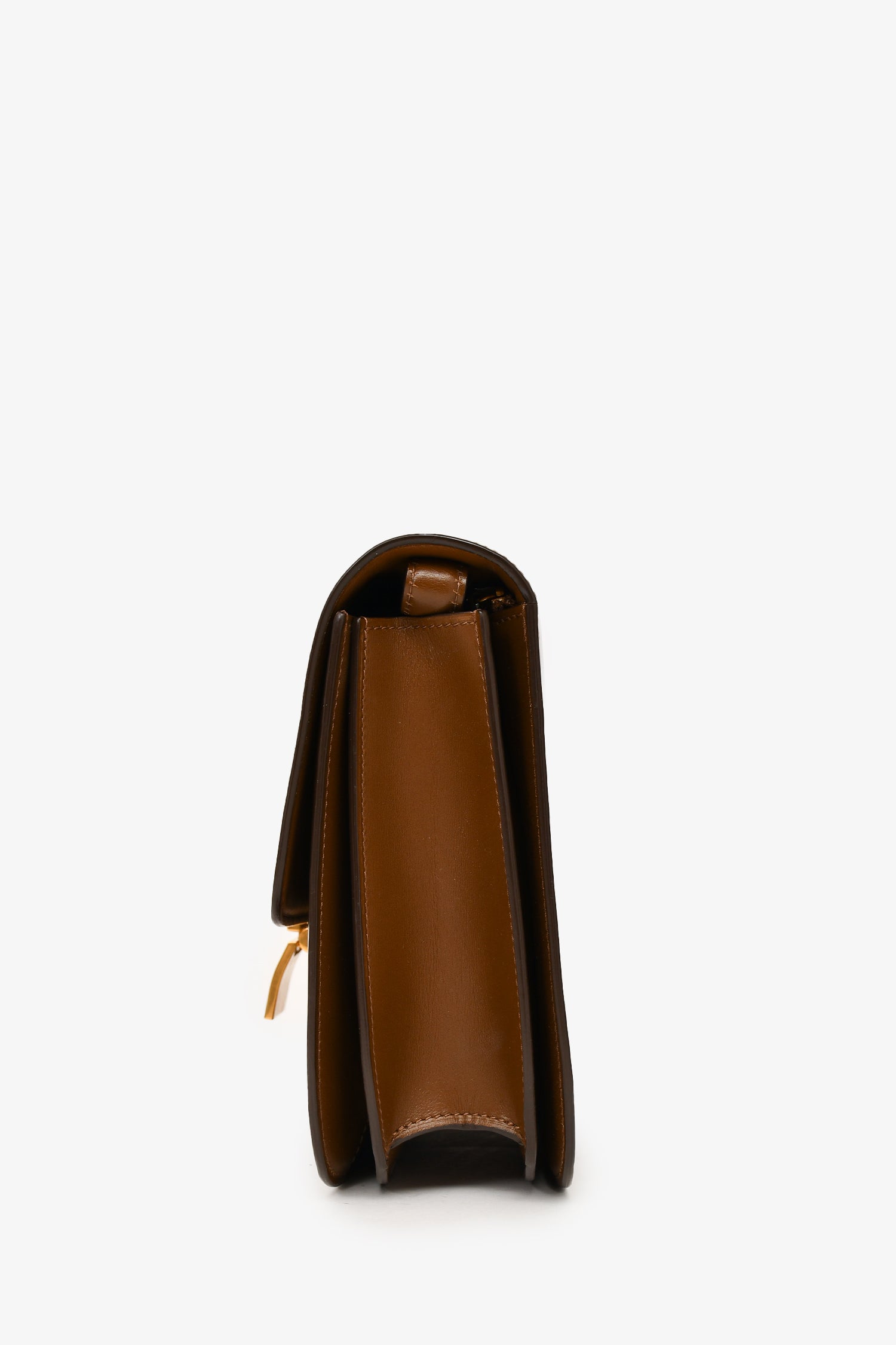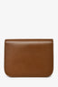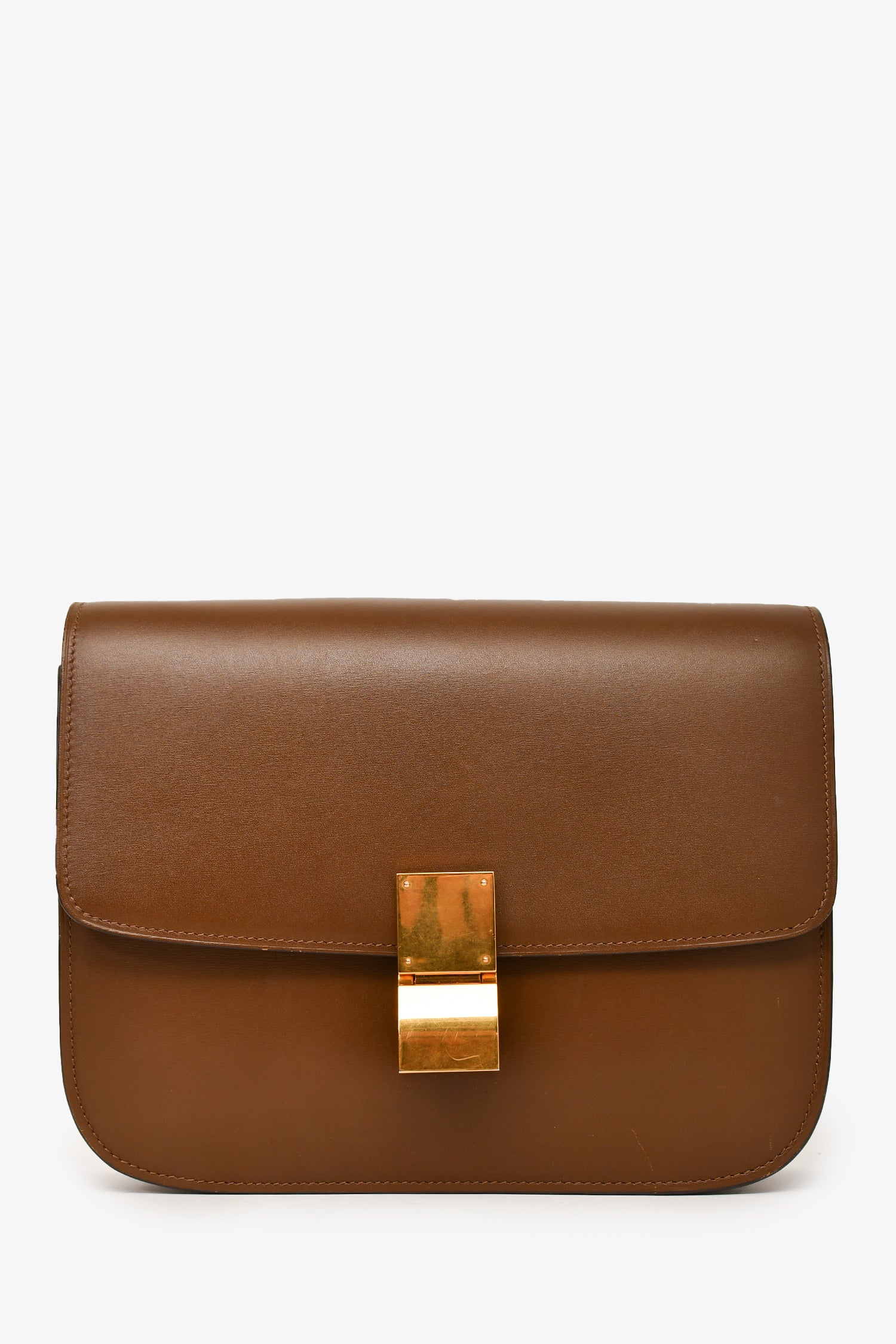 Celine 2016 Brown Leather Medium Box Crossbody. Top flap closure. Three interior compartments. Three interior pockets, one with zipper closure. Gold-tone hardware. Tonal stitching. Singular markings throughout the bag. (As Is)