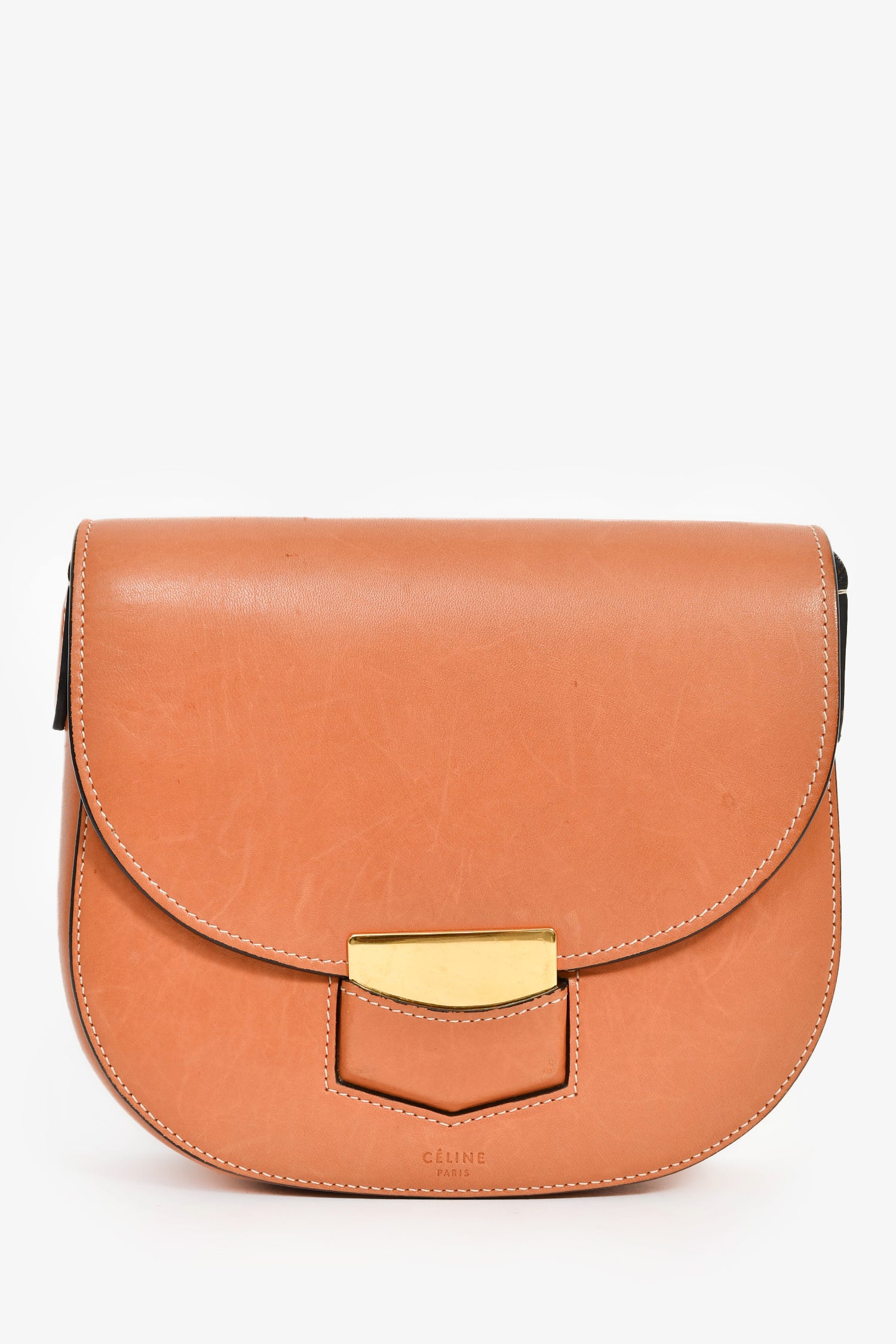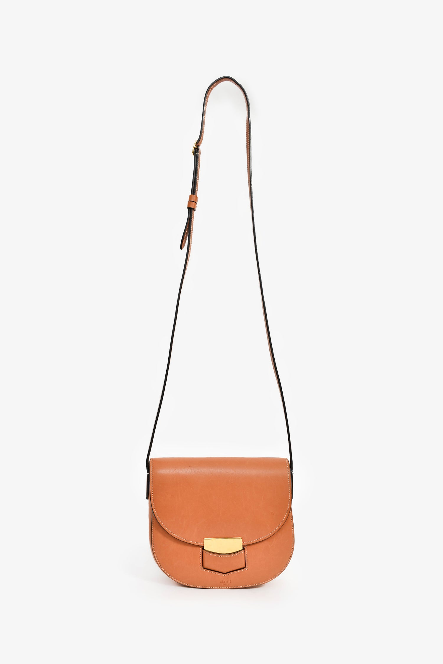 Refresh availabilityCeline 2016 Brown Leather Trotteur Crossbody. Front fold-over flap with a slip closure. Single crossbody strap. Exterior slip compartment. 1 interior slip compartment and 4 card slots. Gold-tone hardware. Contrast stitching.