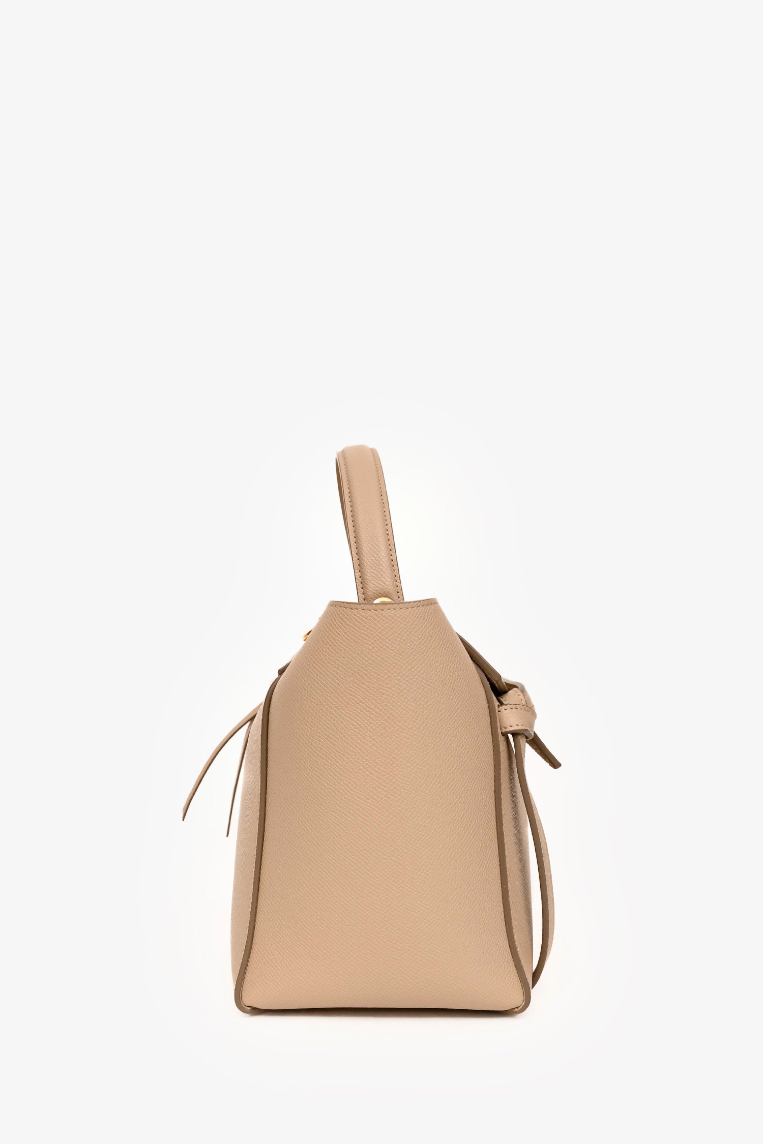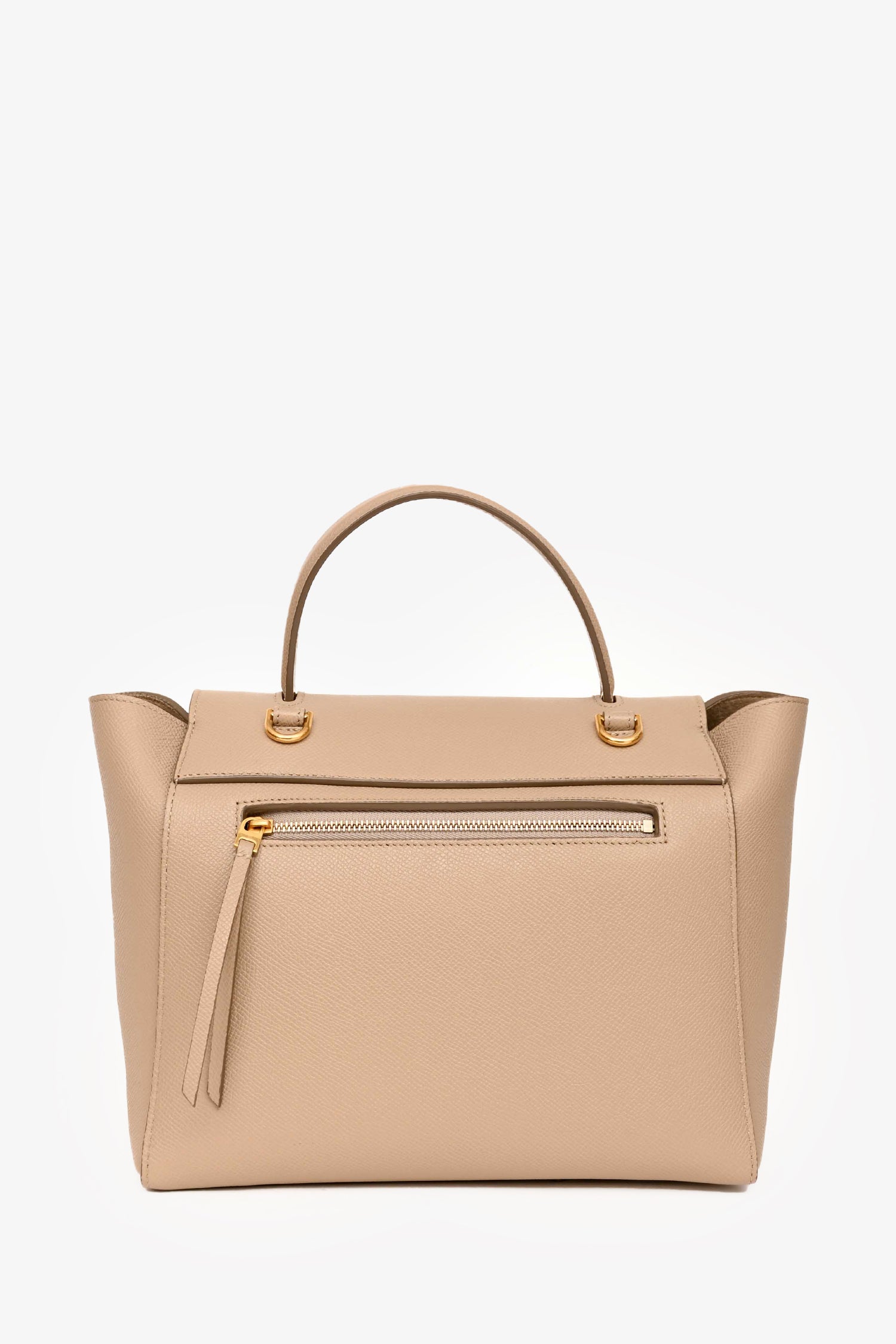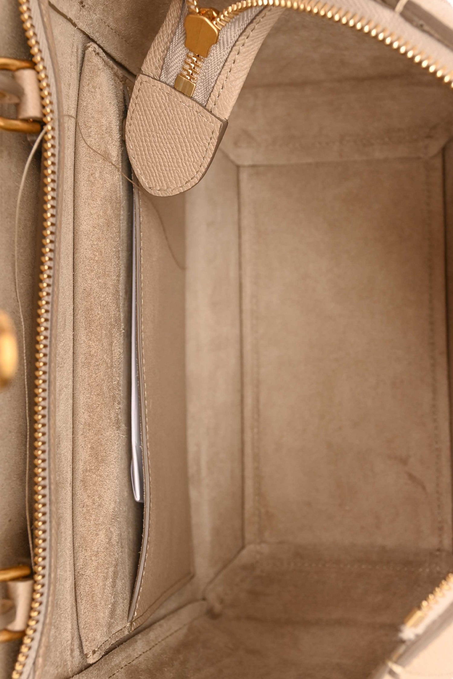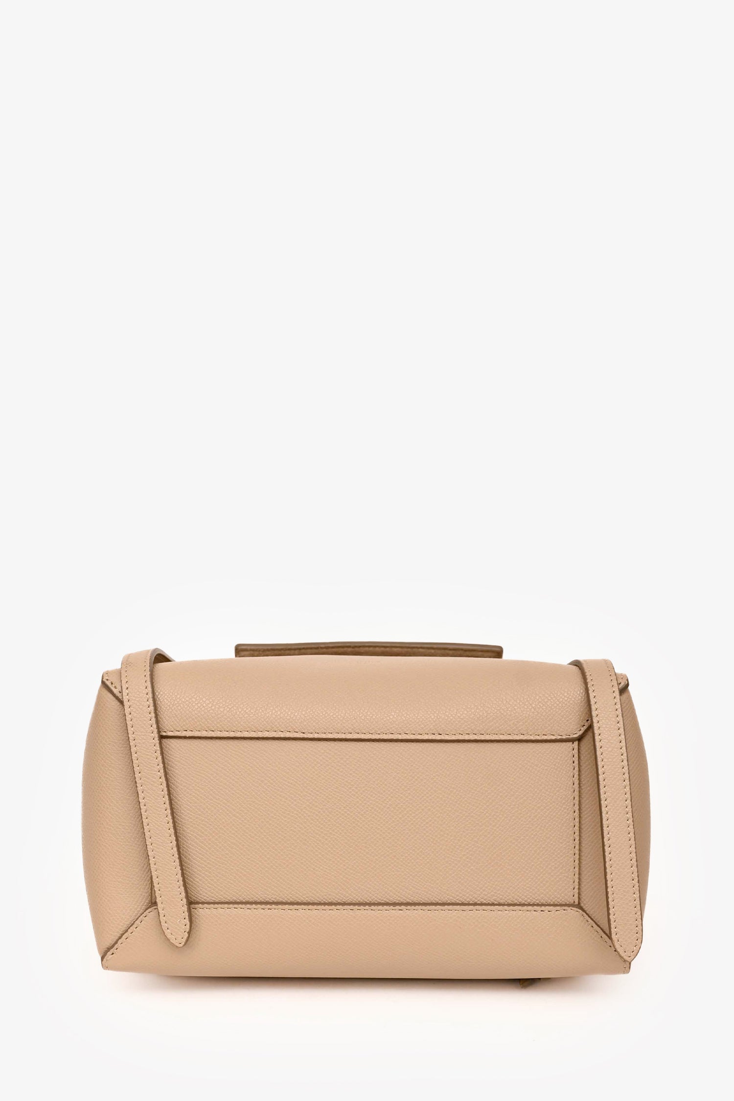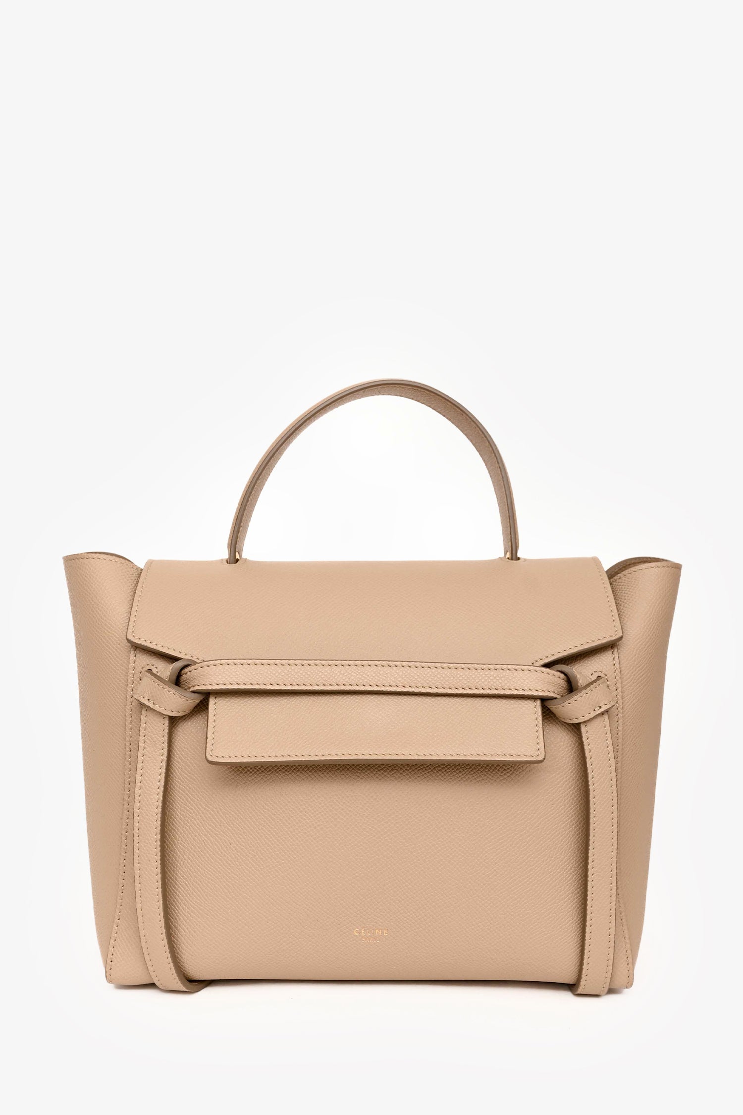 Refresh availabilityCeline 2018 Beige Leather Micro Belt Bag. Gold-tone hardware. Flat top handle. Fold-over flap. Suede-lined interior with a single compartment. Comes with a strap. Tonal stitching.