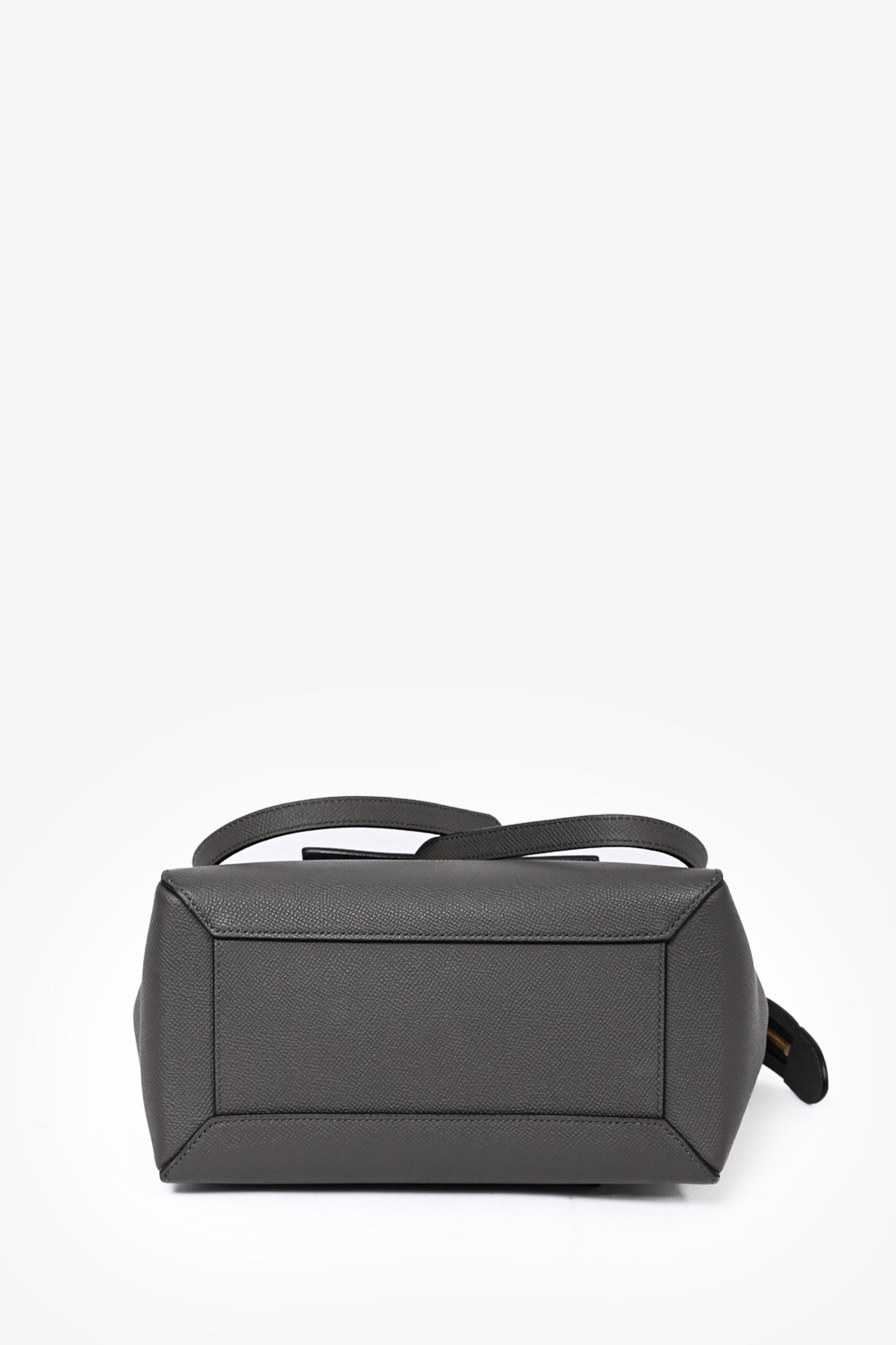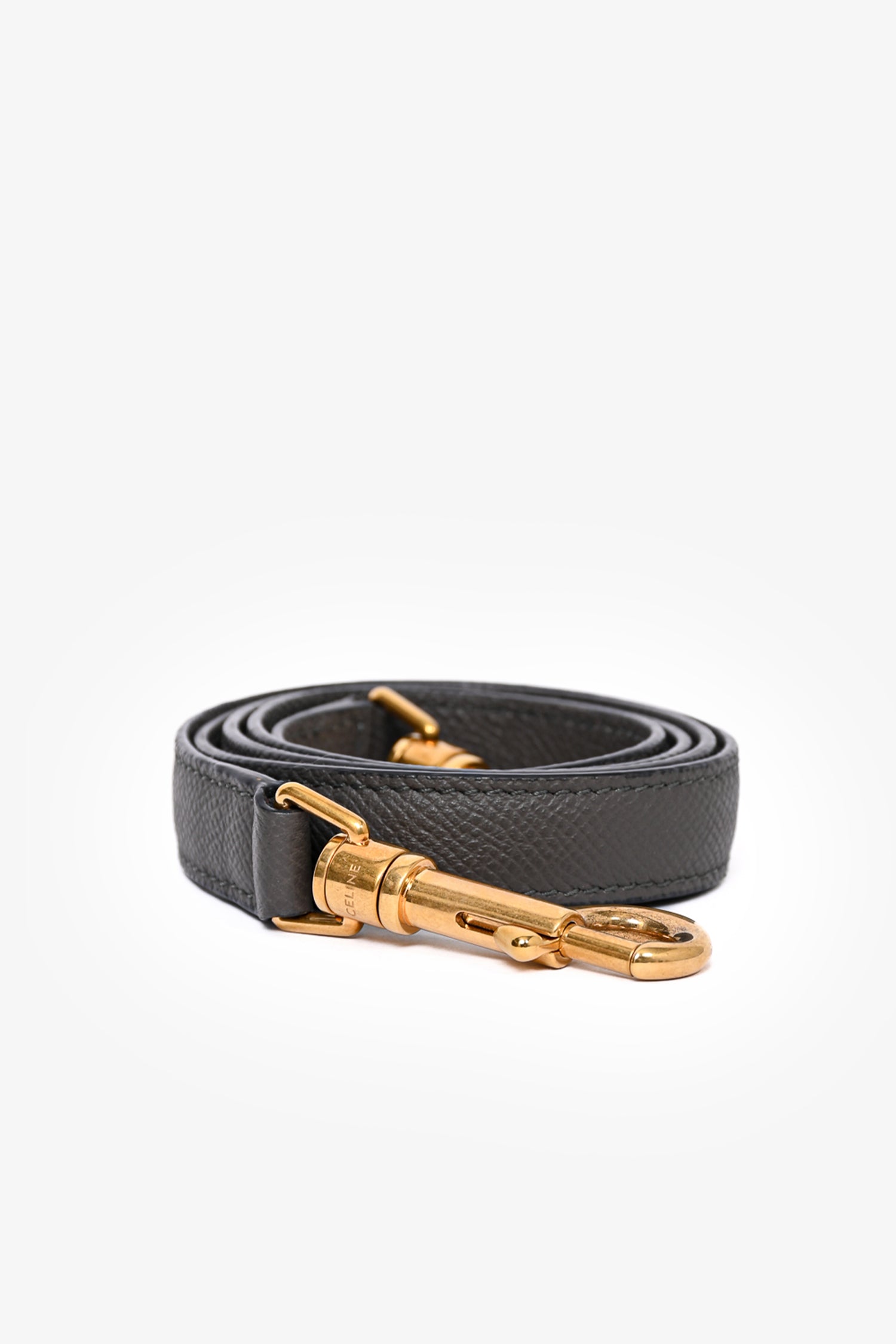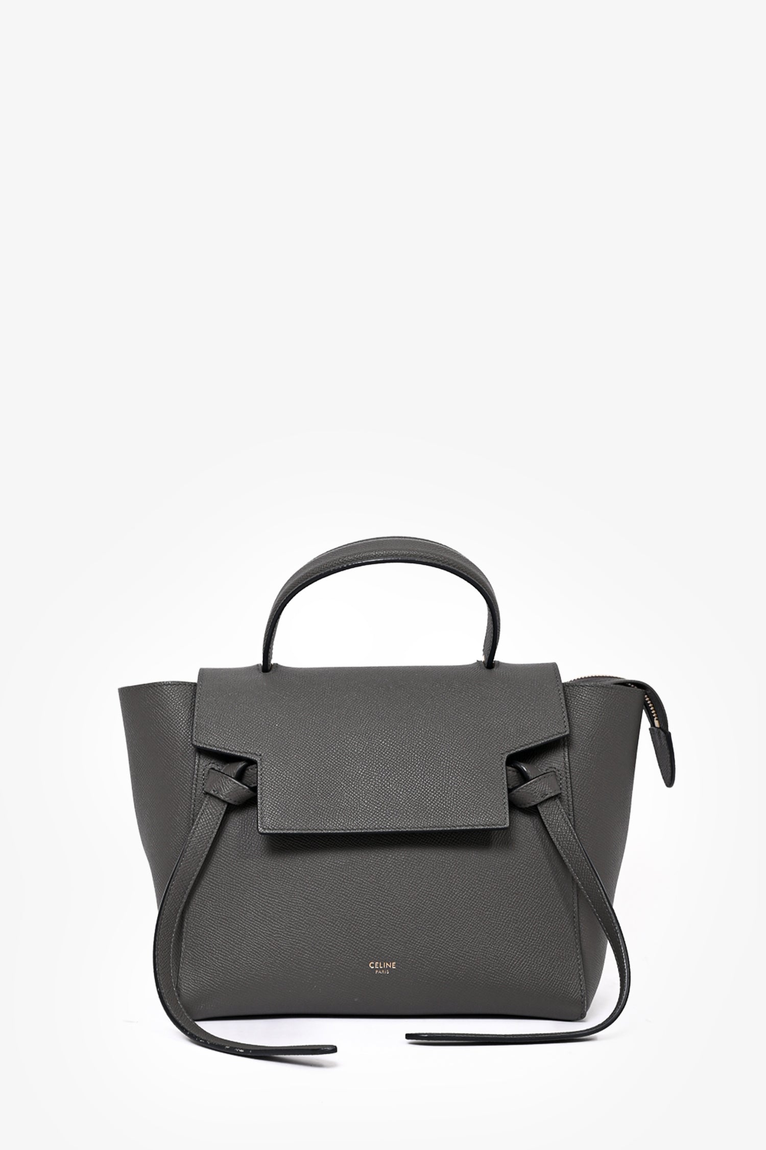Refresh availabilityCeline 2018 Dark Grey Leather Micro Belt Bag with Strap. Fold-over flap with push-lock closure. 1 interior slip pocket. Gold-tone hardware. 1 exterior zip pocket on backside. Removable crossbody strap. Tonal stitching.