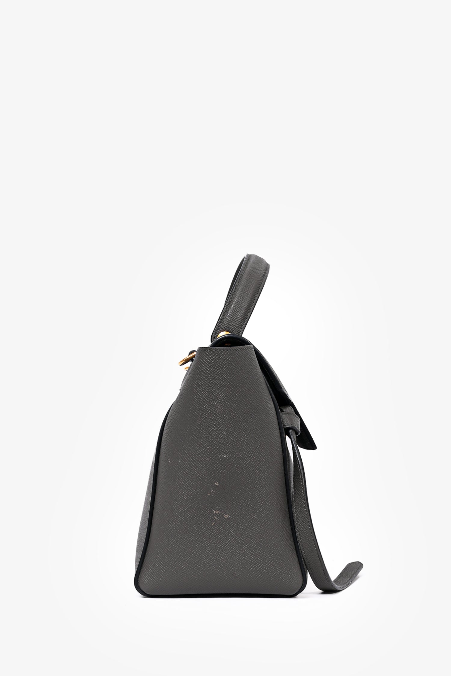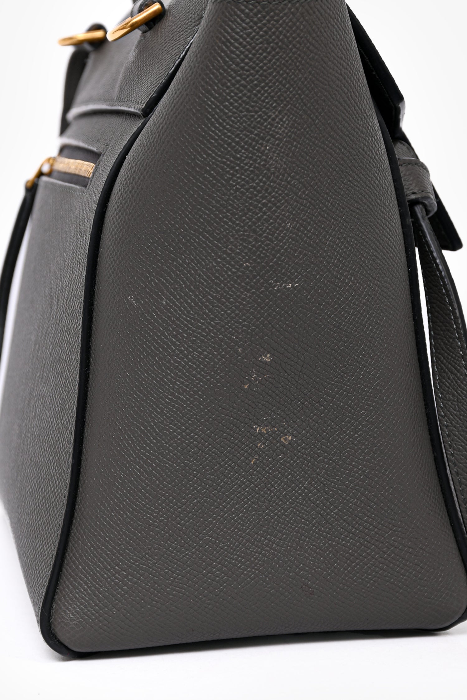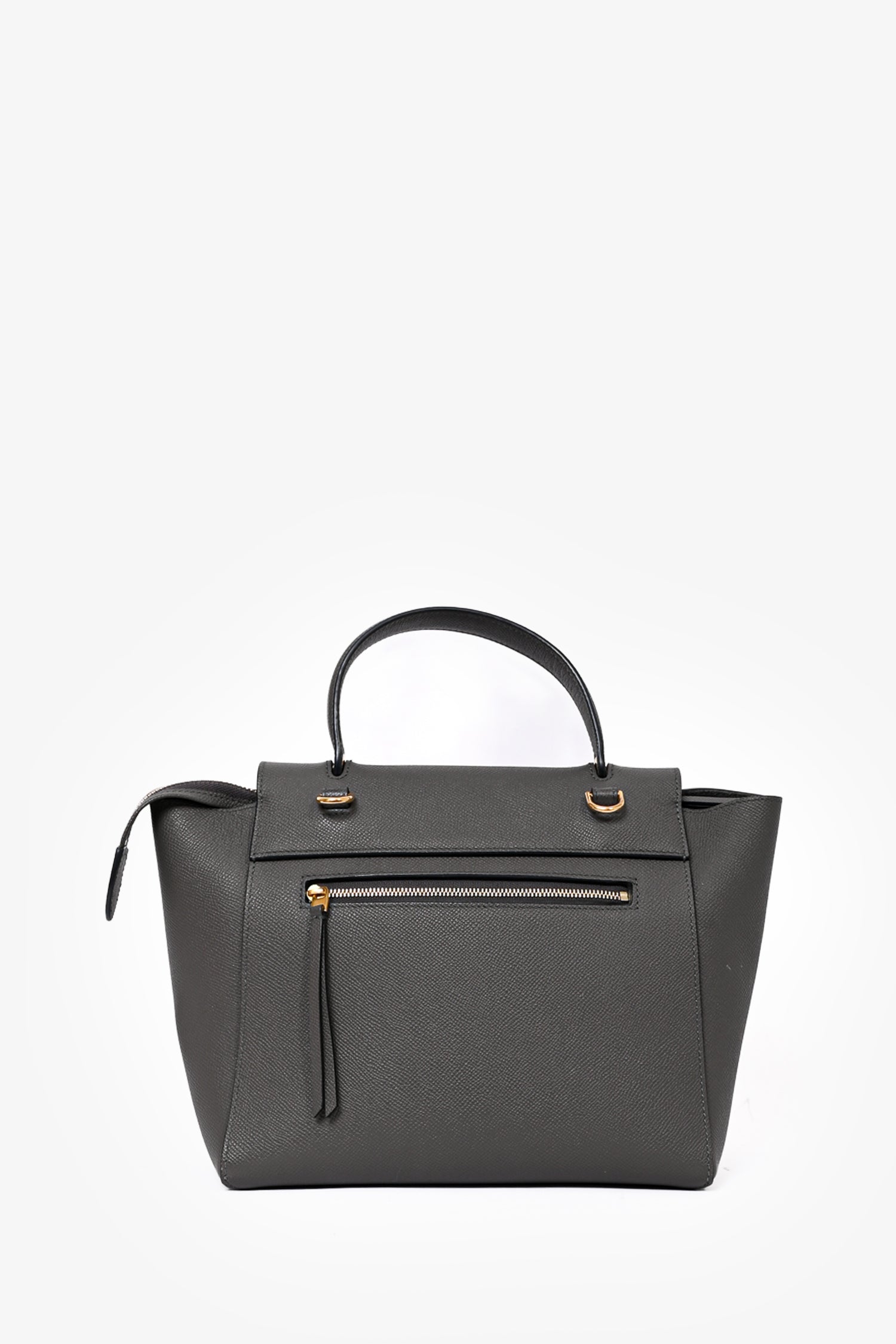 Refresh availabilityCeline 2018 Dark Grey Leather Micro Belt Bag with Strap. Fold-over flap with push-lock closure. 1 interior slip pocket. Gold-tone hardware. 1 exterior zip pocket on backside. Removable crossbody strap. Tonal stitching.
