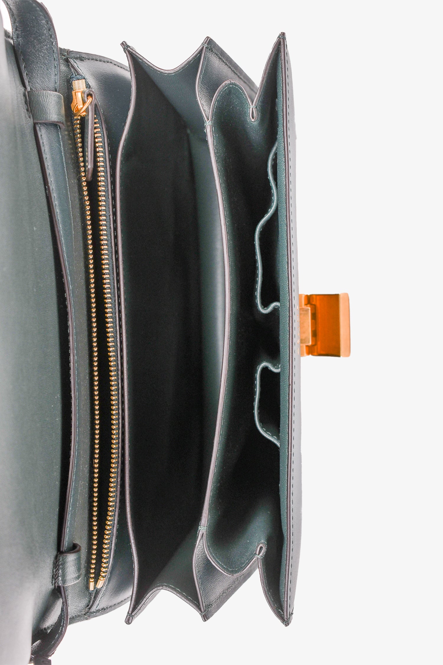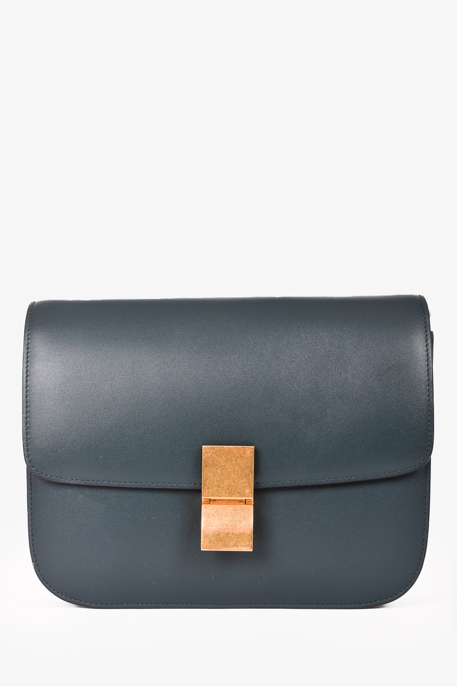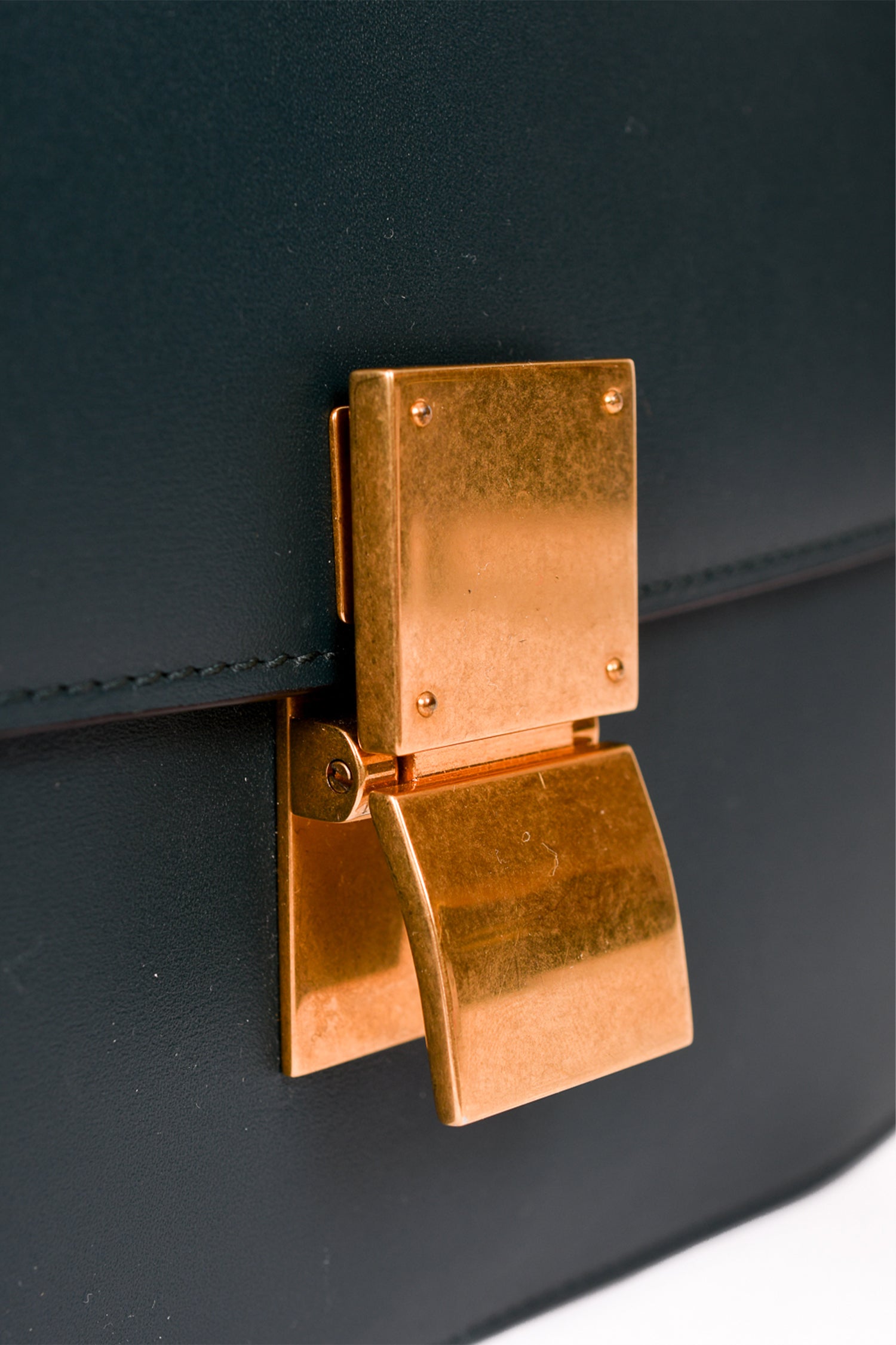 Refresh availabilityCeline 2018 Green Leather Medium Classic Box Crossbody Bag. Front fold-over flap with push-lock closure. 3 interior compartments; 2 open and 1 with zip closure, separated by dividers. 2 interior wall slip pockets. Adjustable strap. Gold-tone hardware. Tonal stitching.