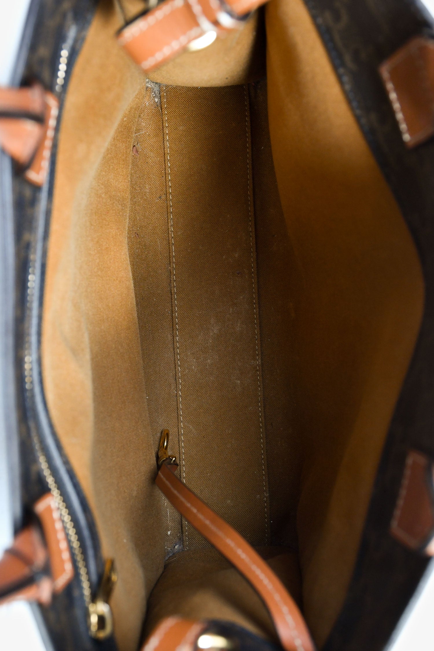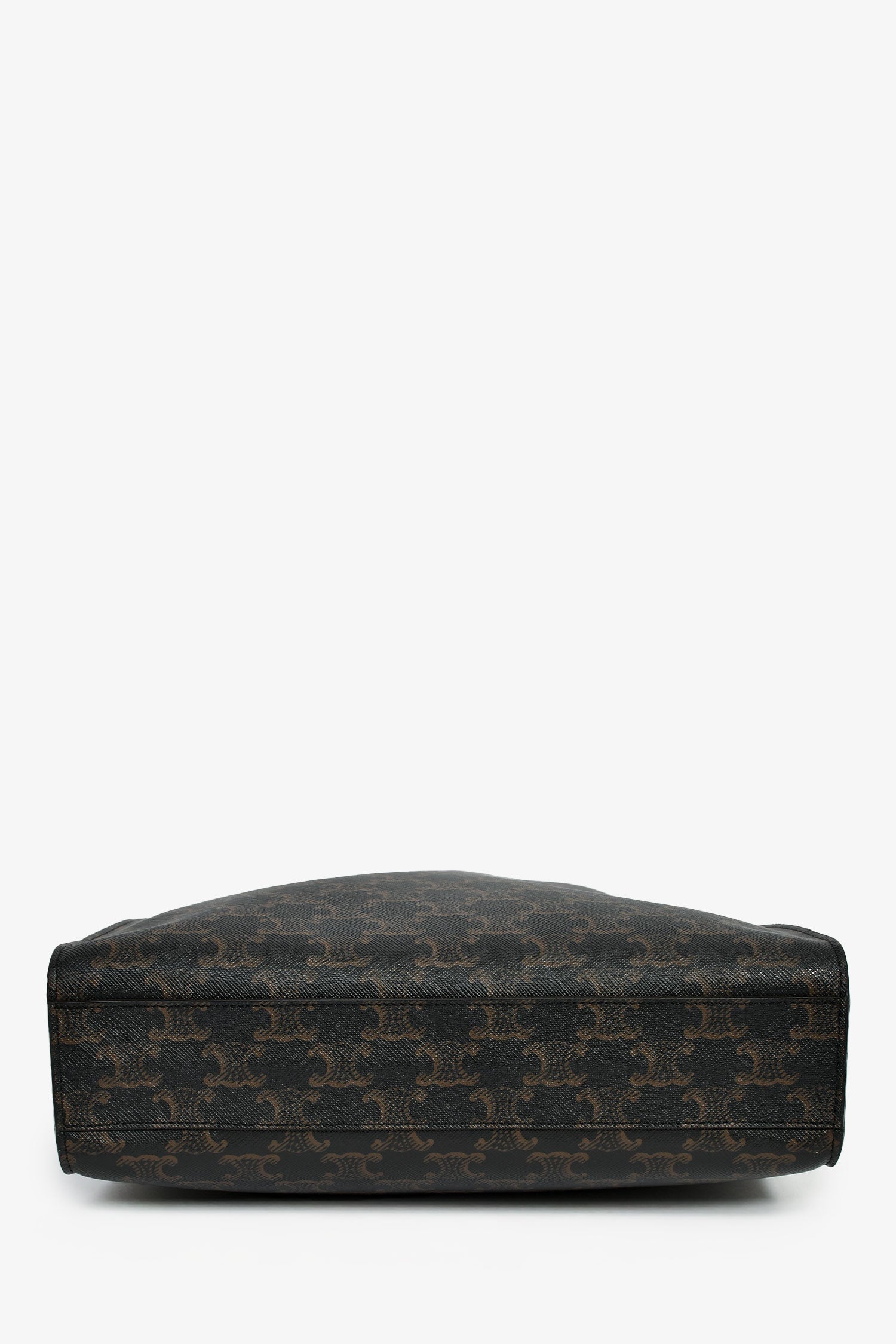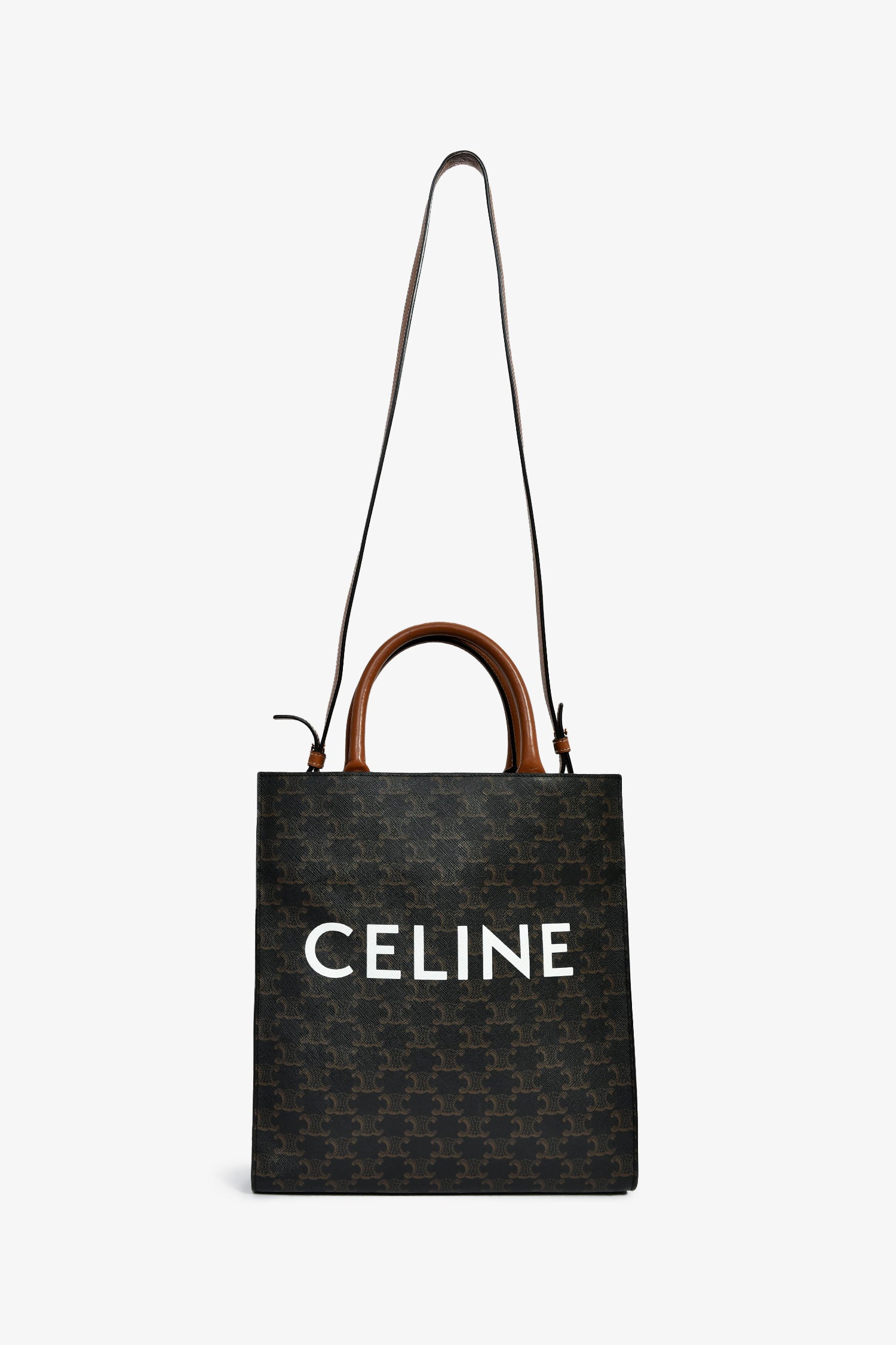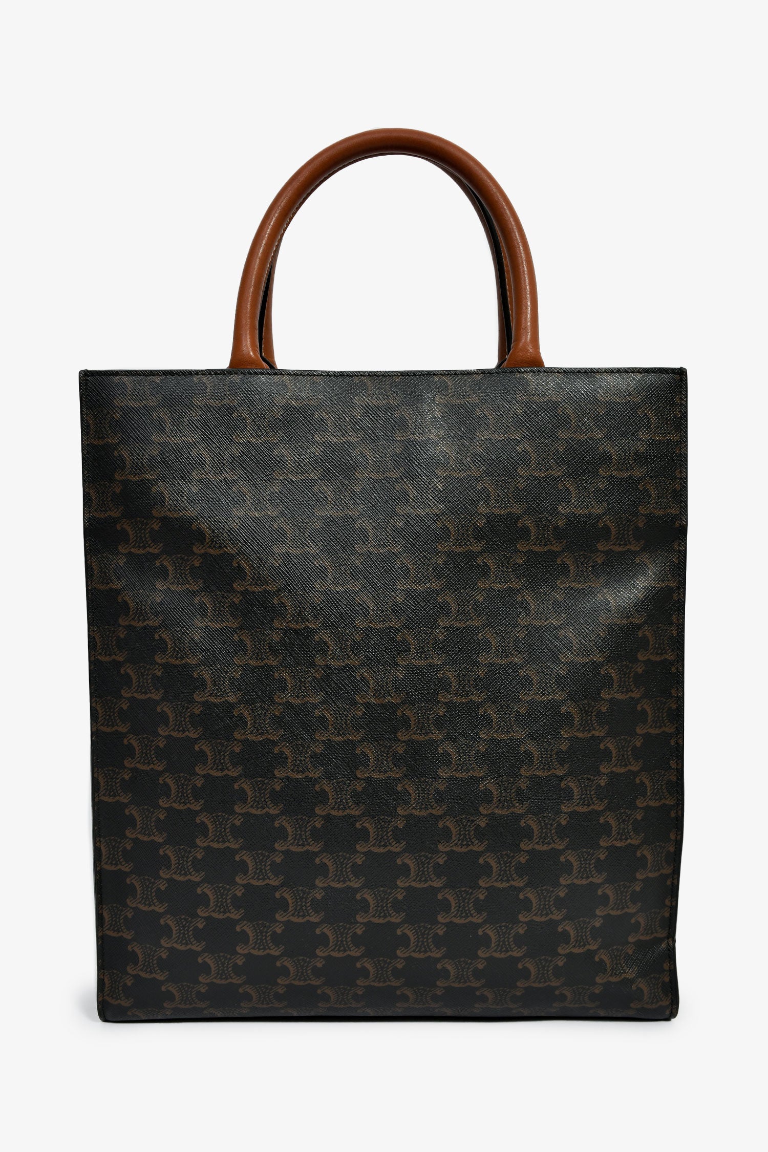 Refresh availabilityCeline 2019 Black/Brown Coated Canvas Small Triomphe Vertical Cabas Tote. Open top. Rolled top handles and an adjustable shoulder strap. Lined canvas interior with a zipped compartment. Gold-tone hardware. Contrast stitching.