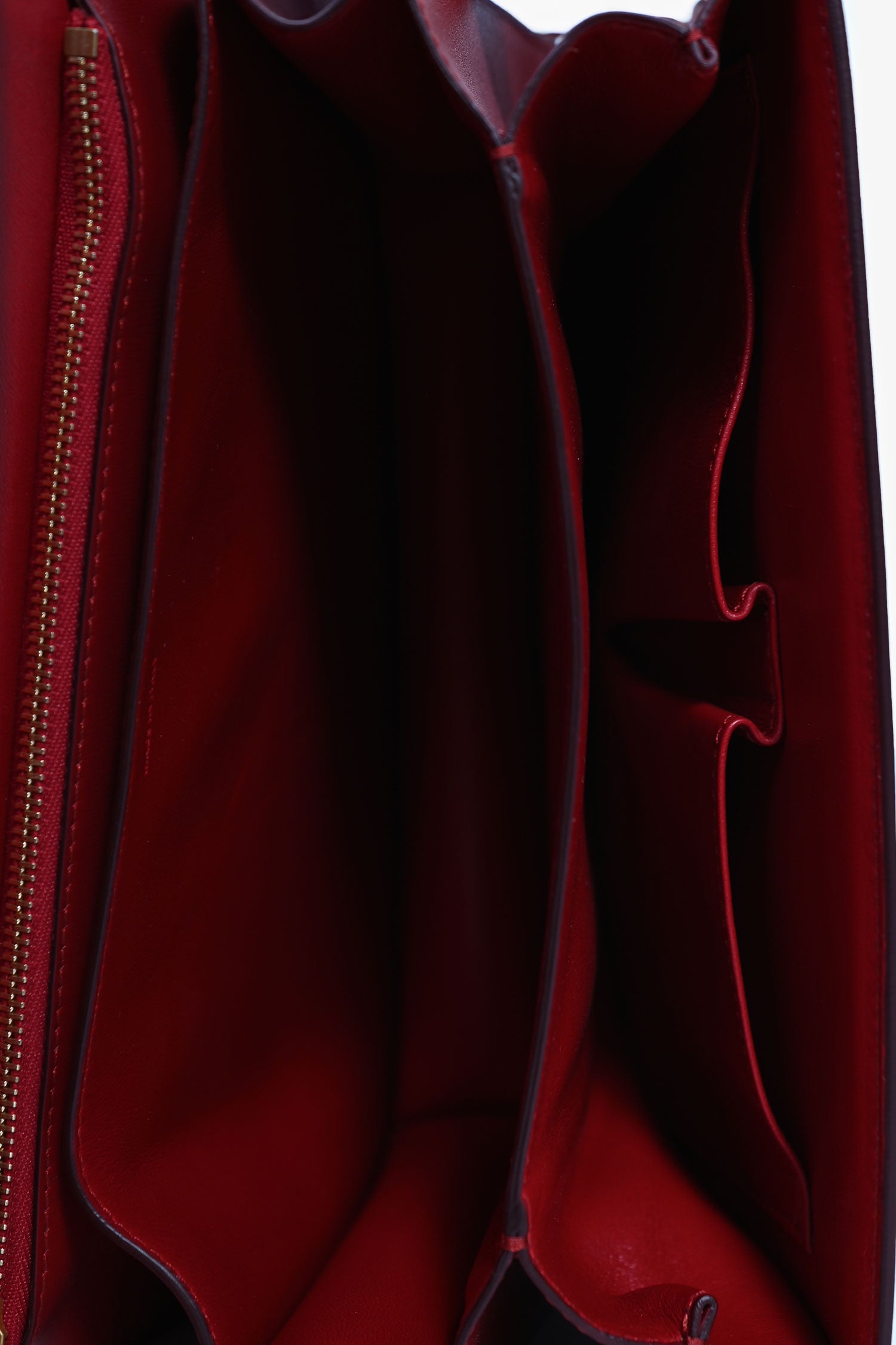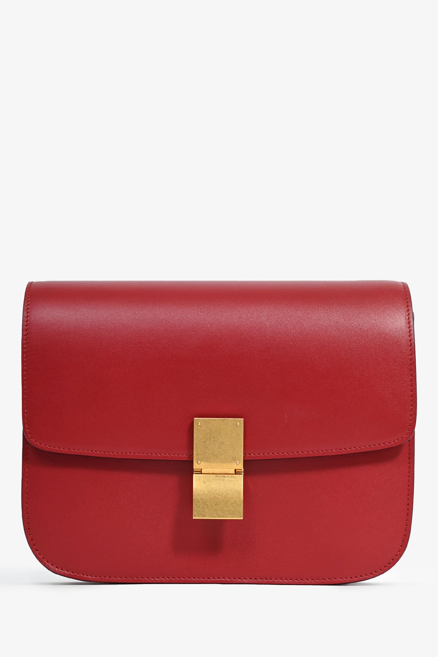 Refresh availabilityCeline 2019 Red Smooth Leather Medium Box Bag. Front fold-over flap with push-lock closure. 2 interior compartments with 2 slip pockets. Single interior zipped compartment. Removable and adjustable straps. Gold-tone hardware. Tonal stitching.