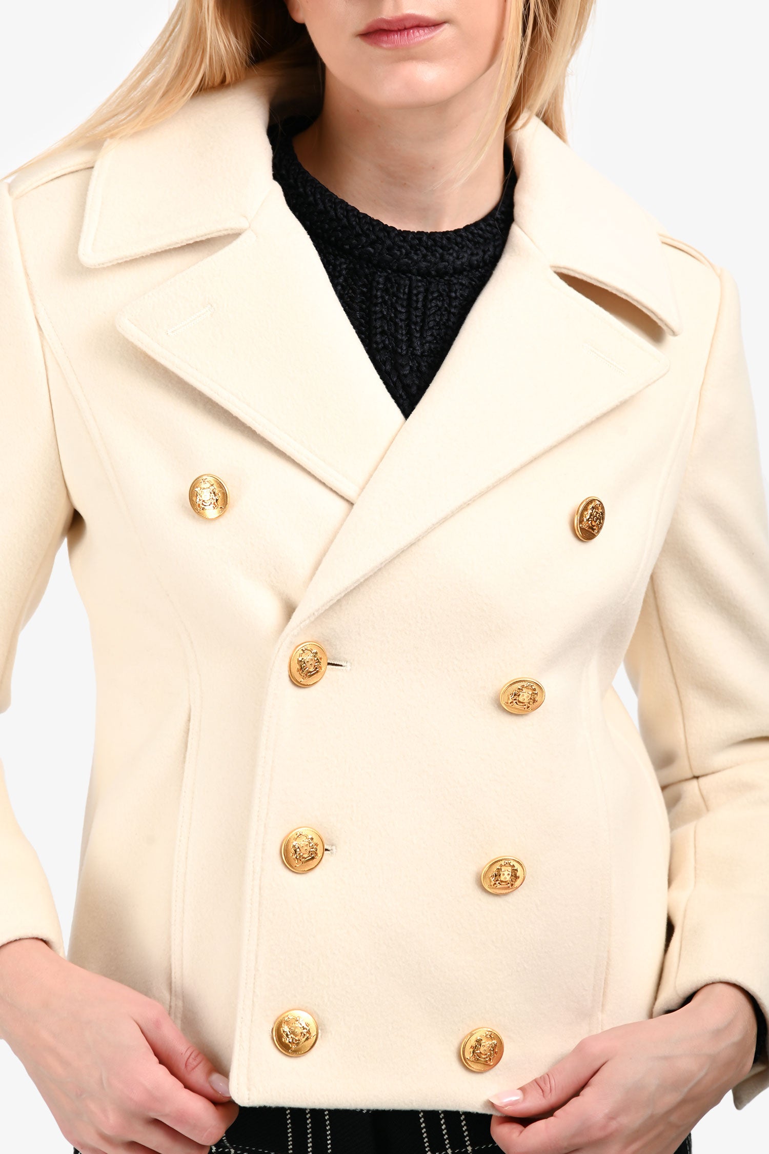Refresh availabilityCeline Cream Cashmere Gold Triomphe Button Jacket. Notched lapel neckline. Double-breasted front button closure. Shoulders with strap and button closures. Cuffs with button-up closures. 2 exterior slip pockets. Fully lined interior. Gold-tone hardware. Tonal stitching.