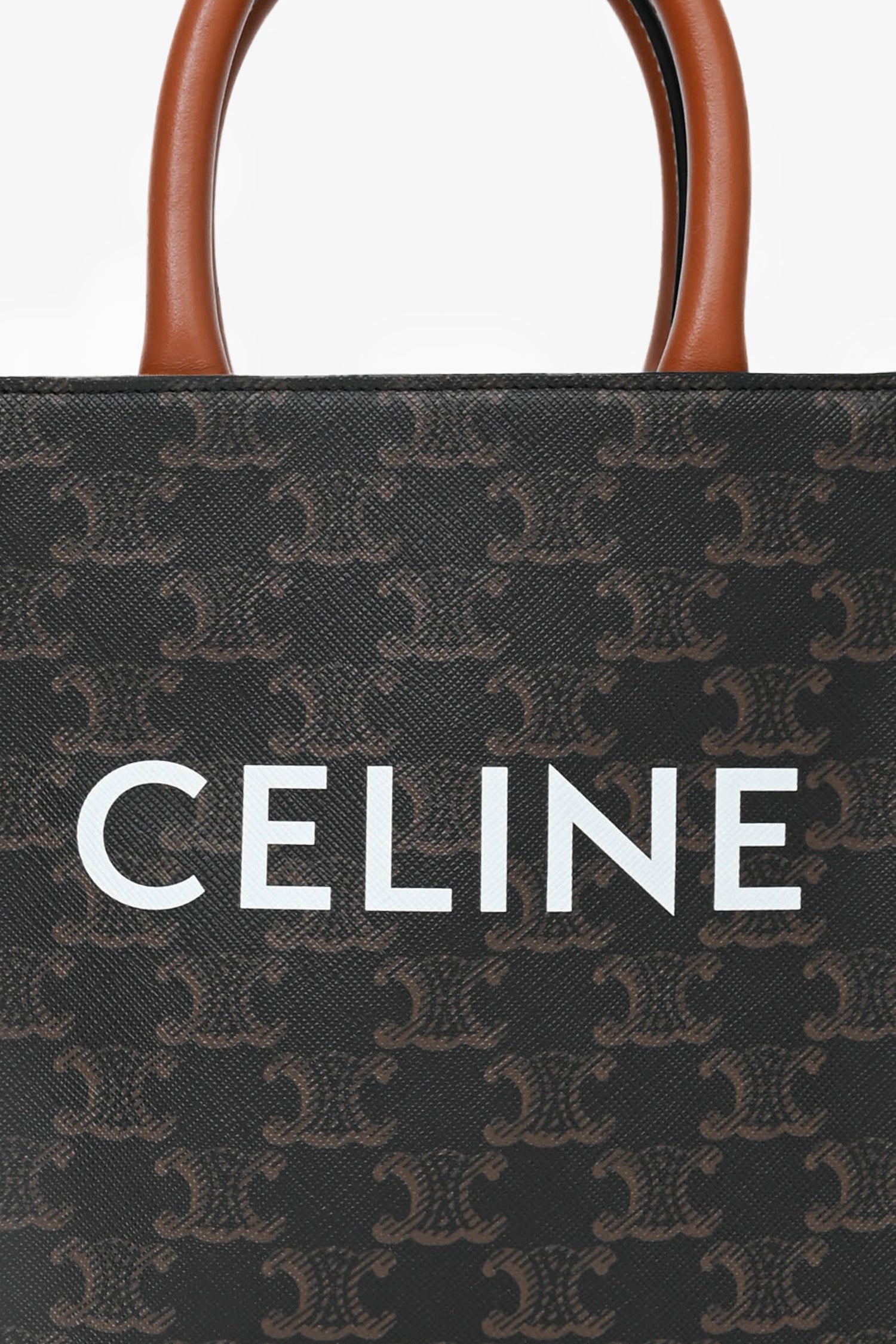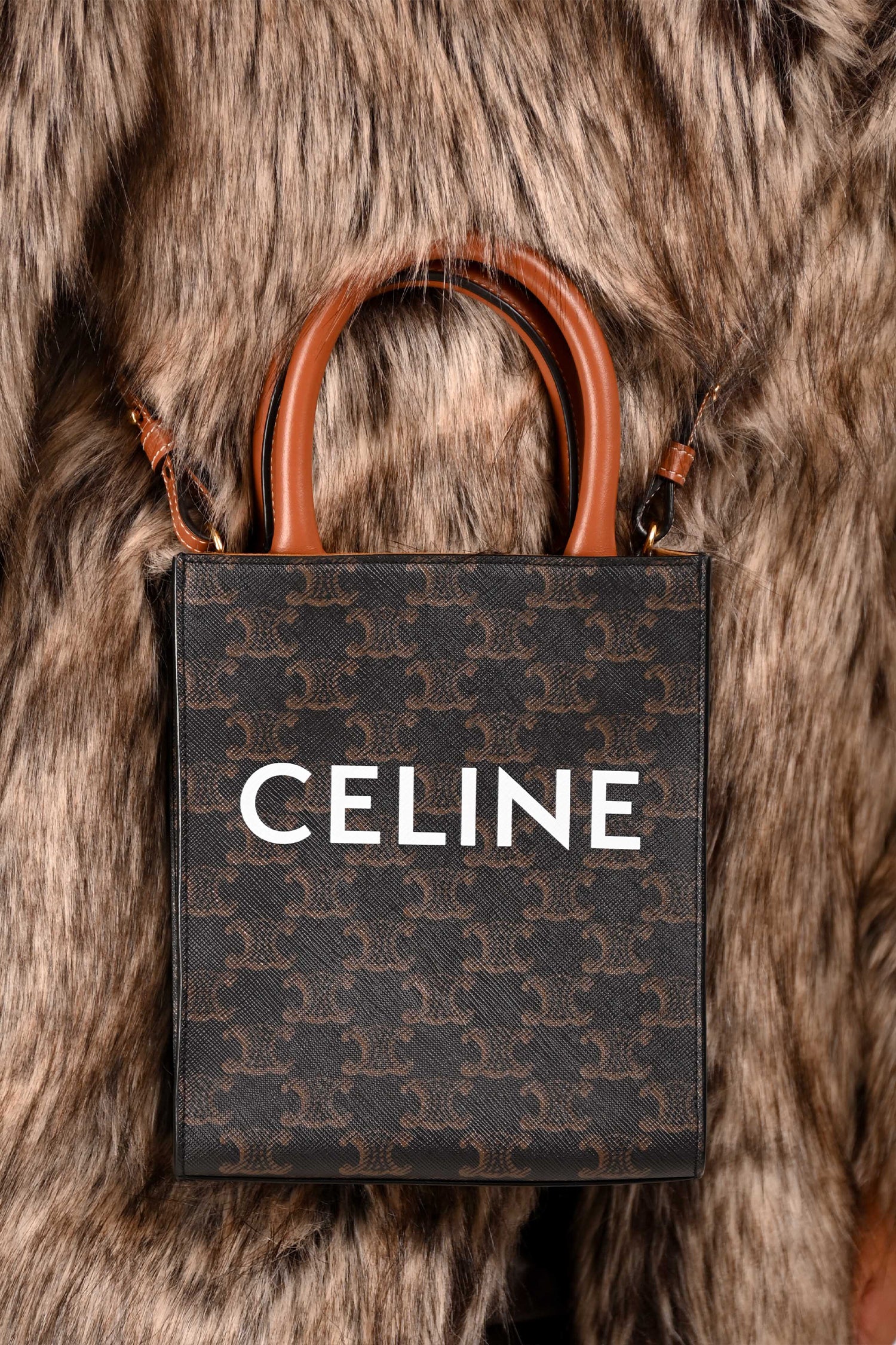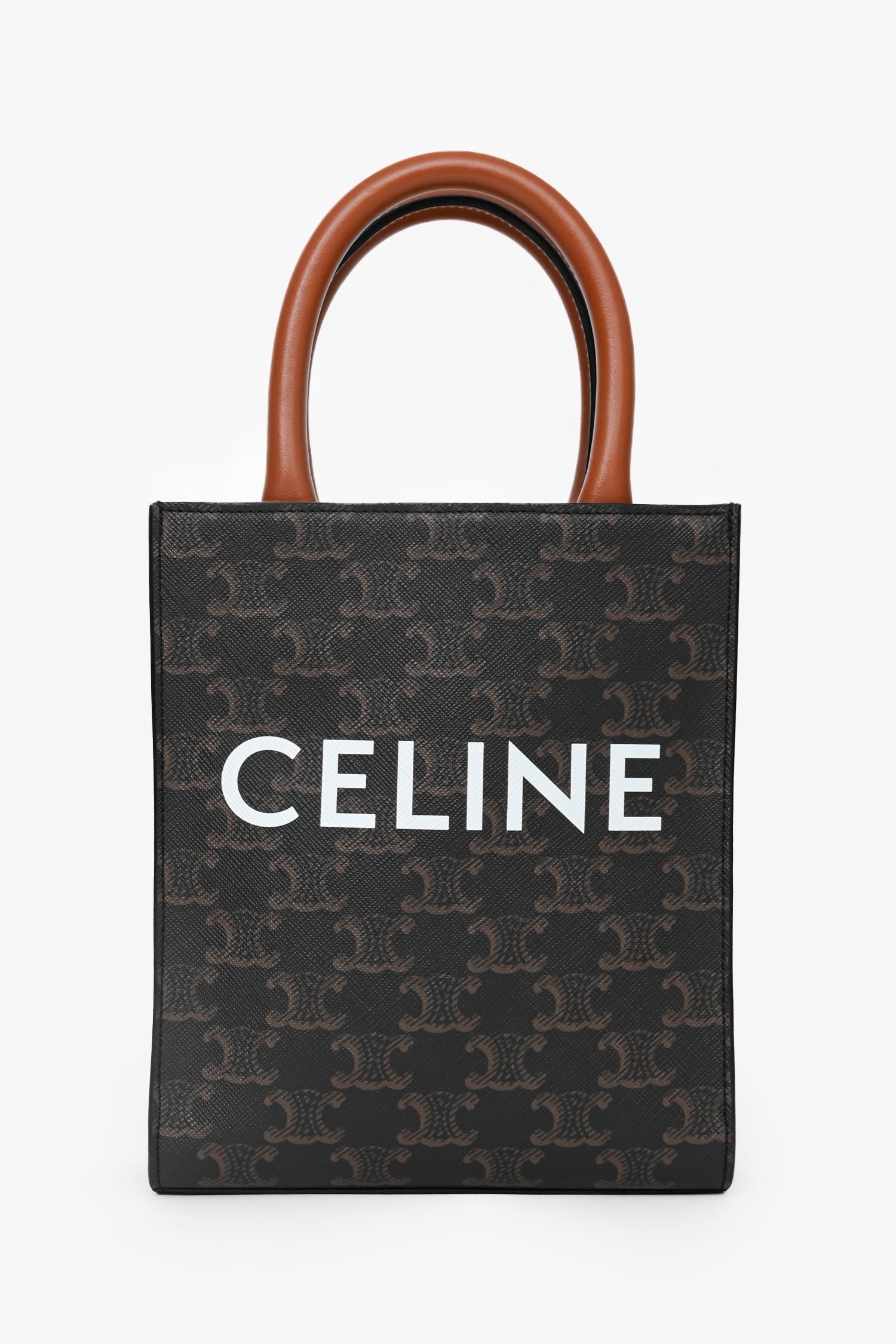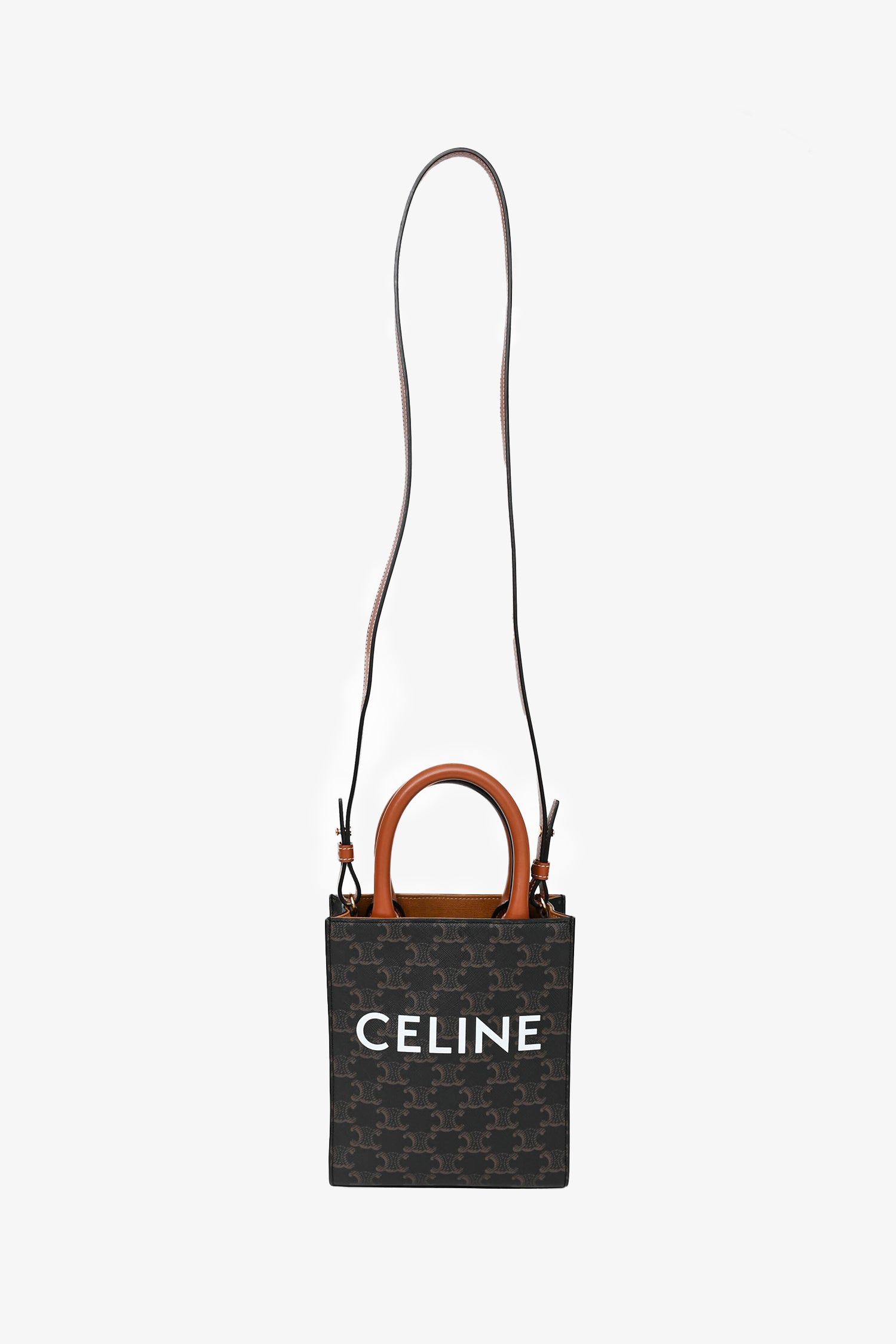 Refresh availabilityCeline 2021 Brown Canvas/Leather Mini Triomphe Vertical Cabas Tote with Strap. Dual rolled handles. Brown textile interior lining. Open interior. Removable and adjustable strap. Gold-tone hardware.