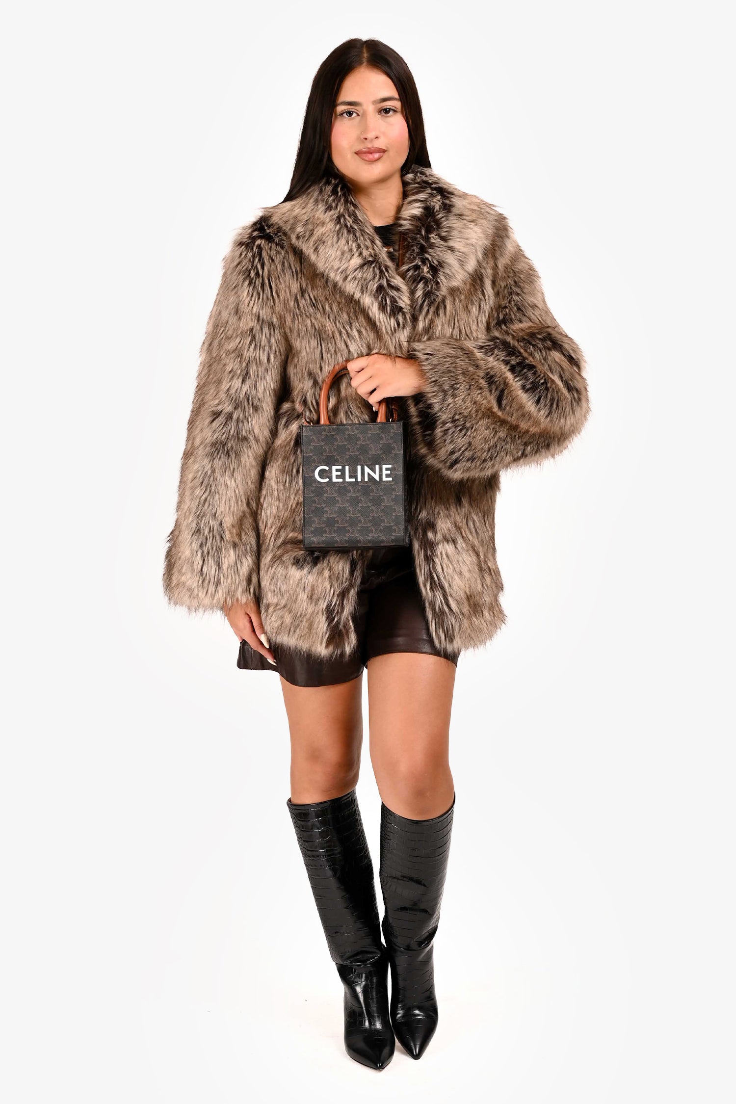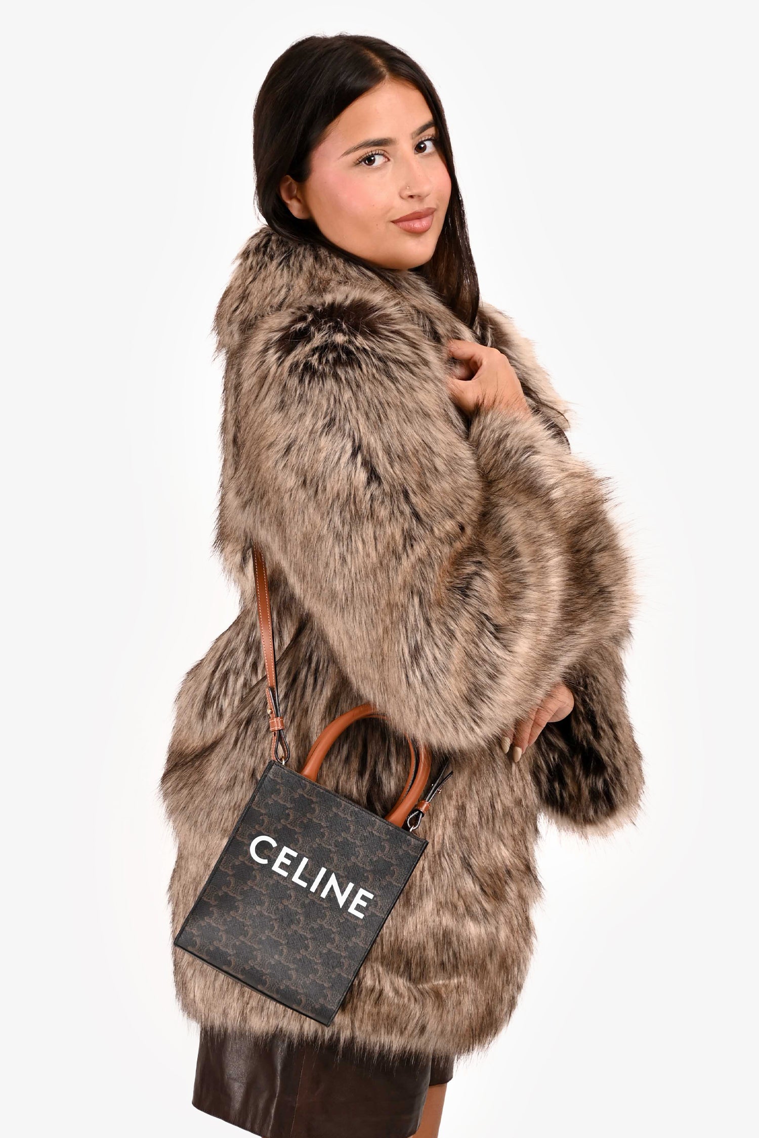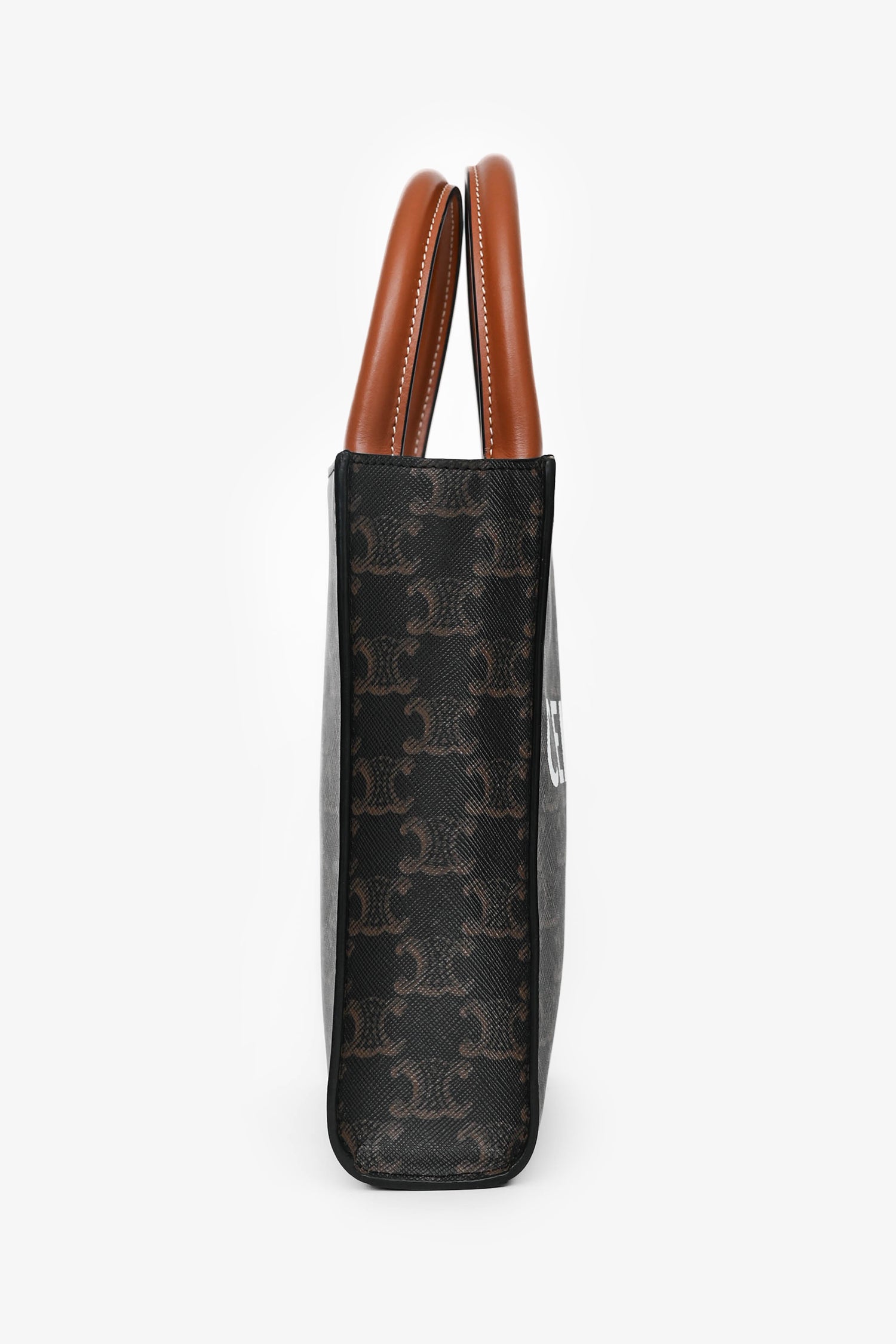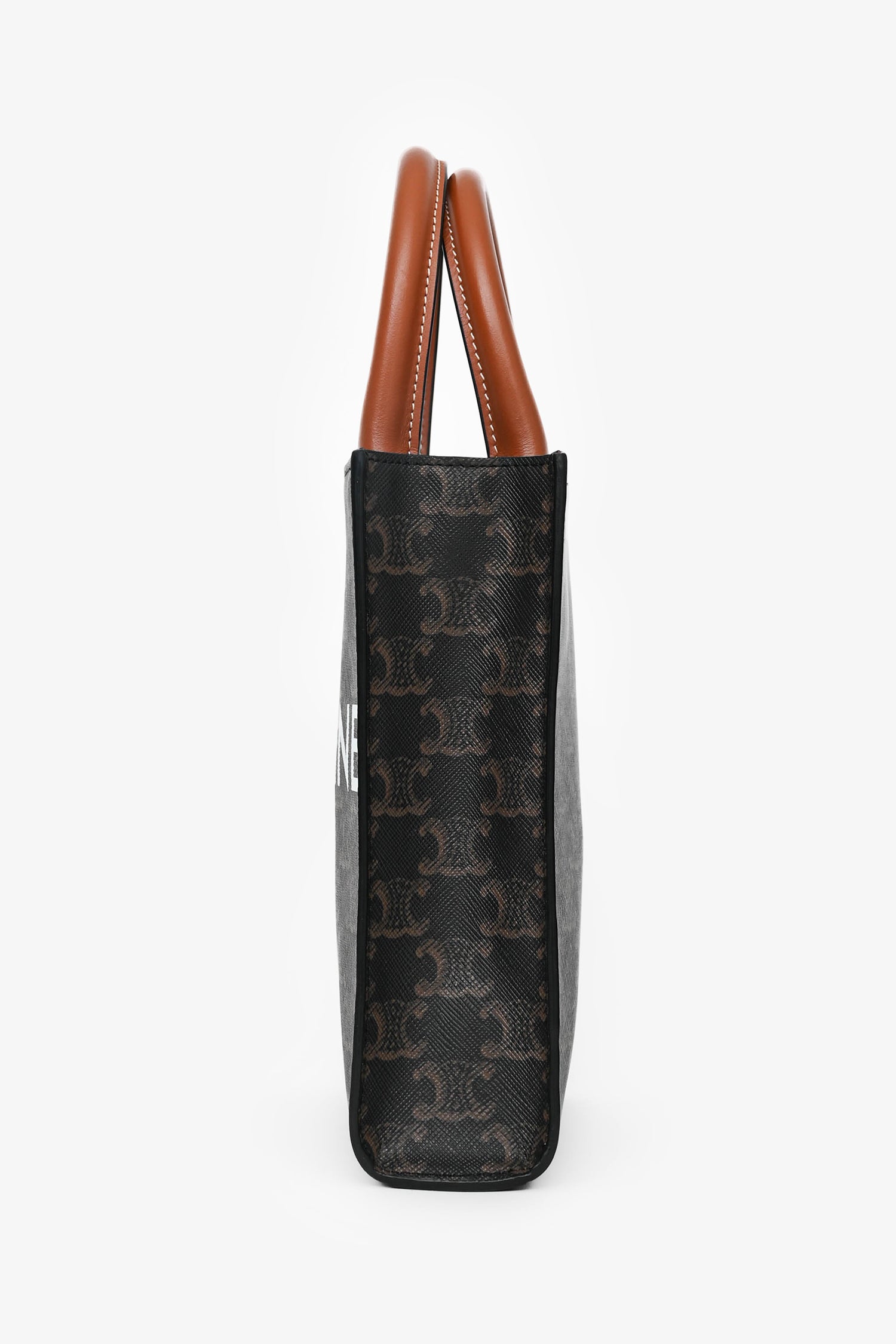 Refresh availabilityCeline 2021 Brown Canvas/Leather Mini Triomphe Vertical Cabas Tote with Strap. Dual rolled handles. Brown textile interior lining. Open interior. Removable and adjustable strap. Gold-tone hardware.