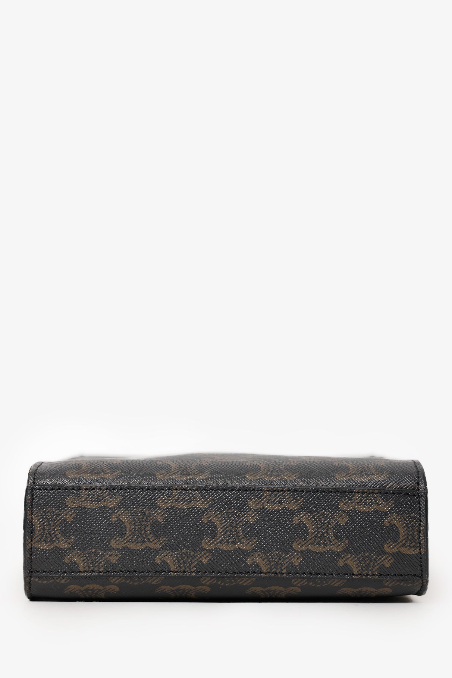 Refresh availabilityCeline 2021 Brown Canvas/Leather Mini Triomphe Vertical Cabas Tote With Strap. Top open. Twin top handles. Removable shoulder strap with adjustable pull-through push-pin closure. Canvas-lined interior. Gold-tone hardware. Contrast stitching.