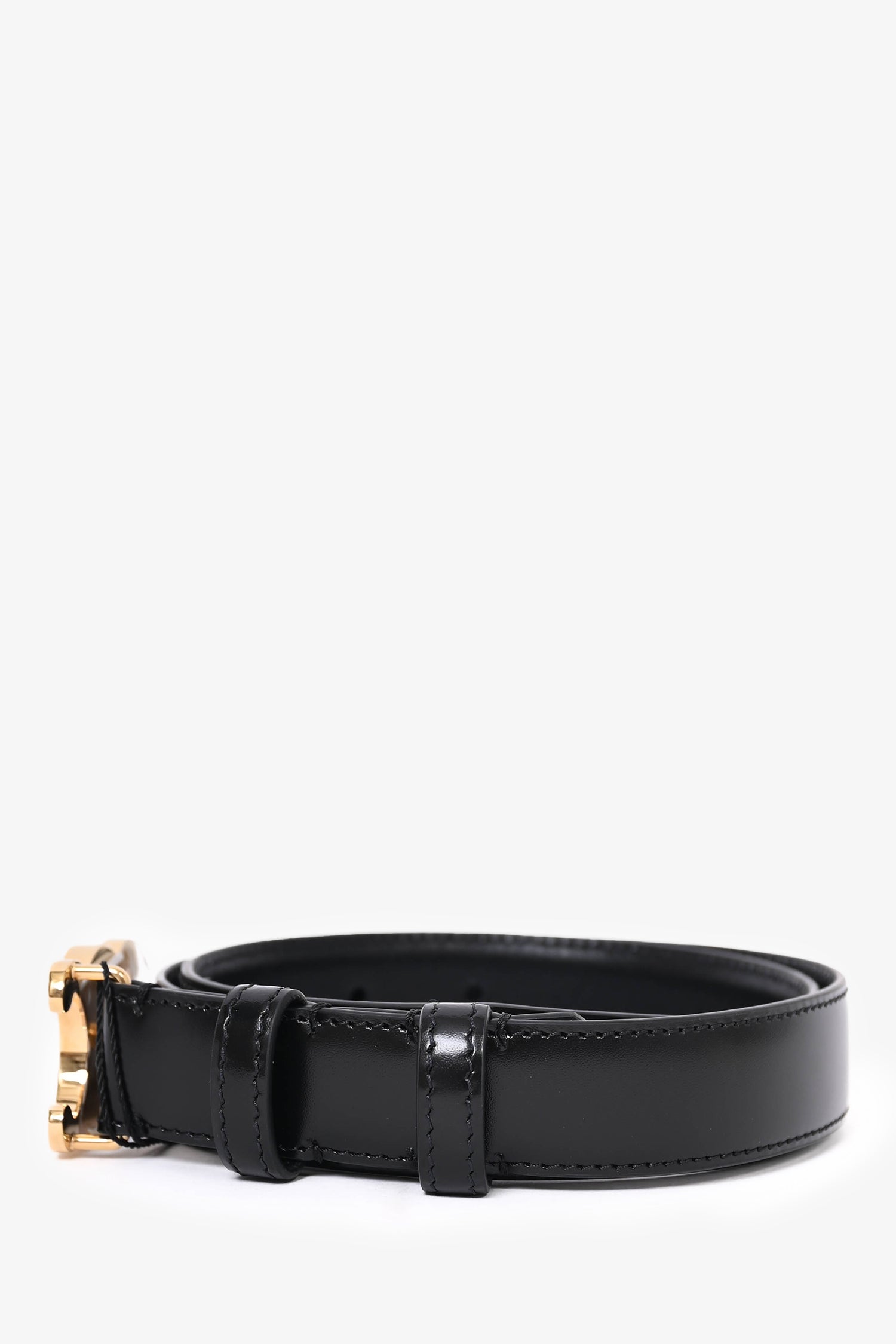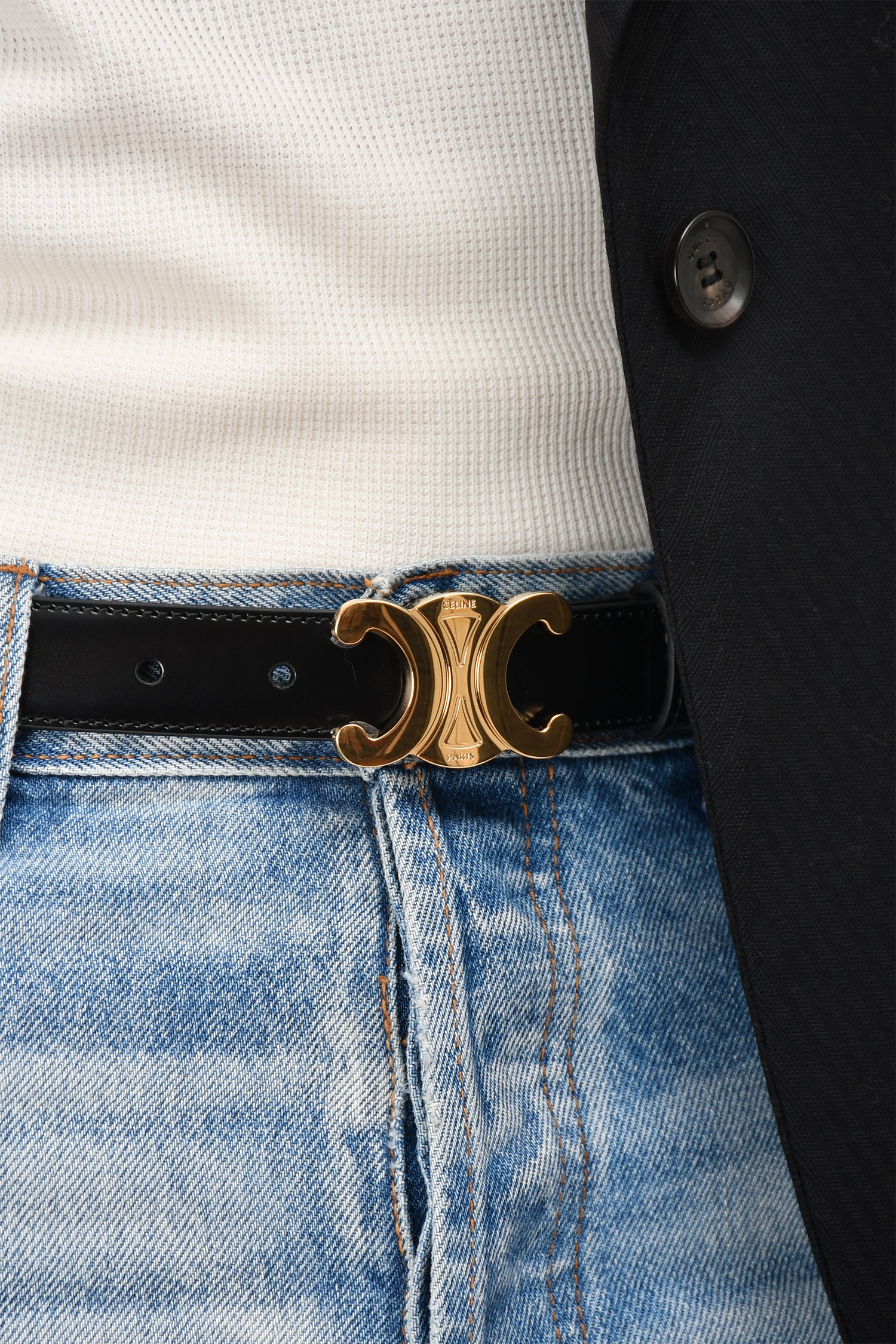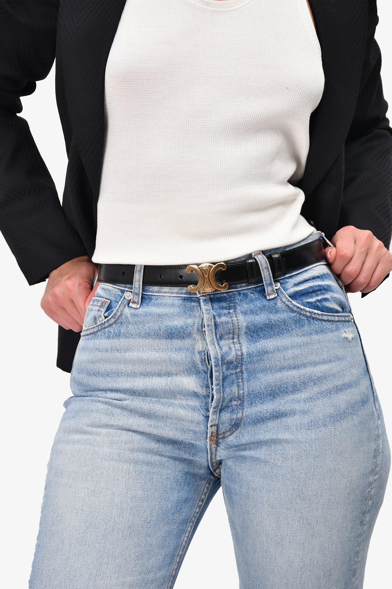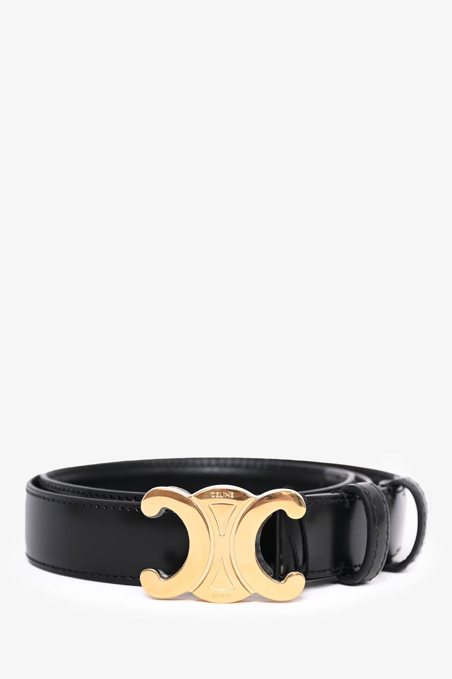 Refresh availabilityCeline 2022 Black Brushed Leather Triomphe Belt. Push-tab buckle closure. Gold-tone hardware.