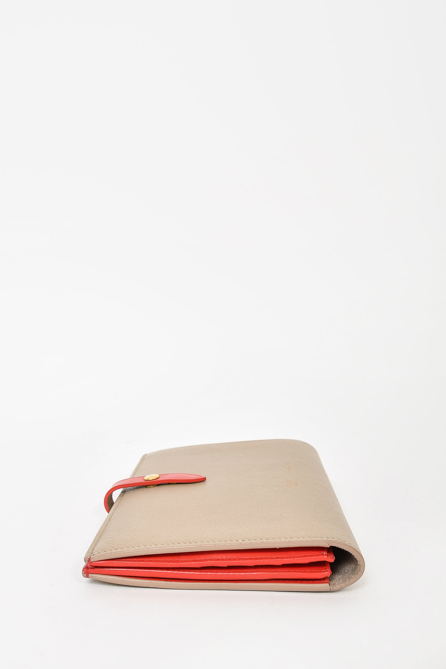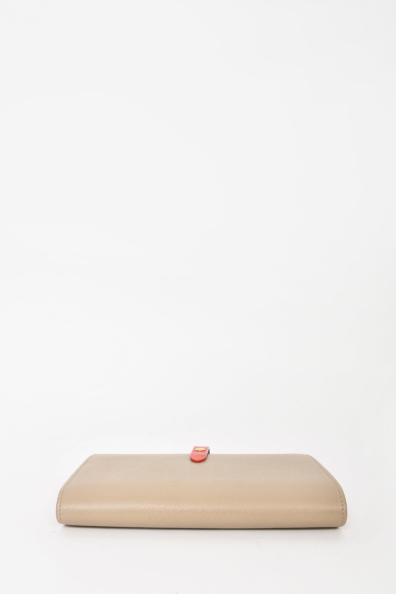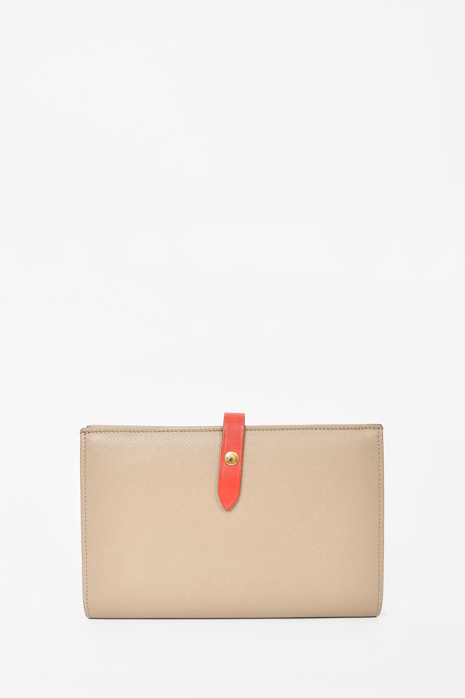 Refresh availabilityCeline Beige/Coral Leather Large Strap Wallet. Front foldover strap with snap-button closure. 10 card slots. 3 billfold compartments. 1 zippered compartment. Gold-tone hardware. Tonal stitching.