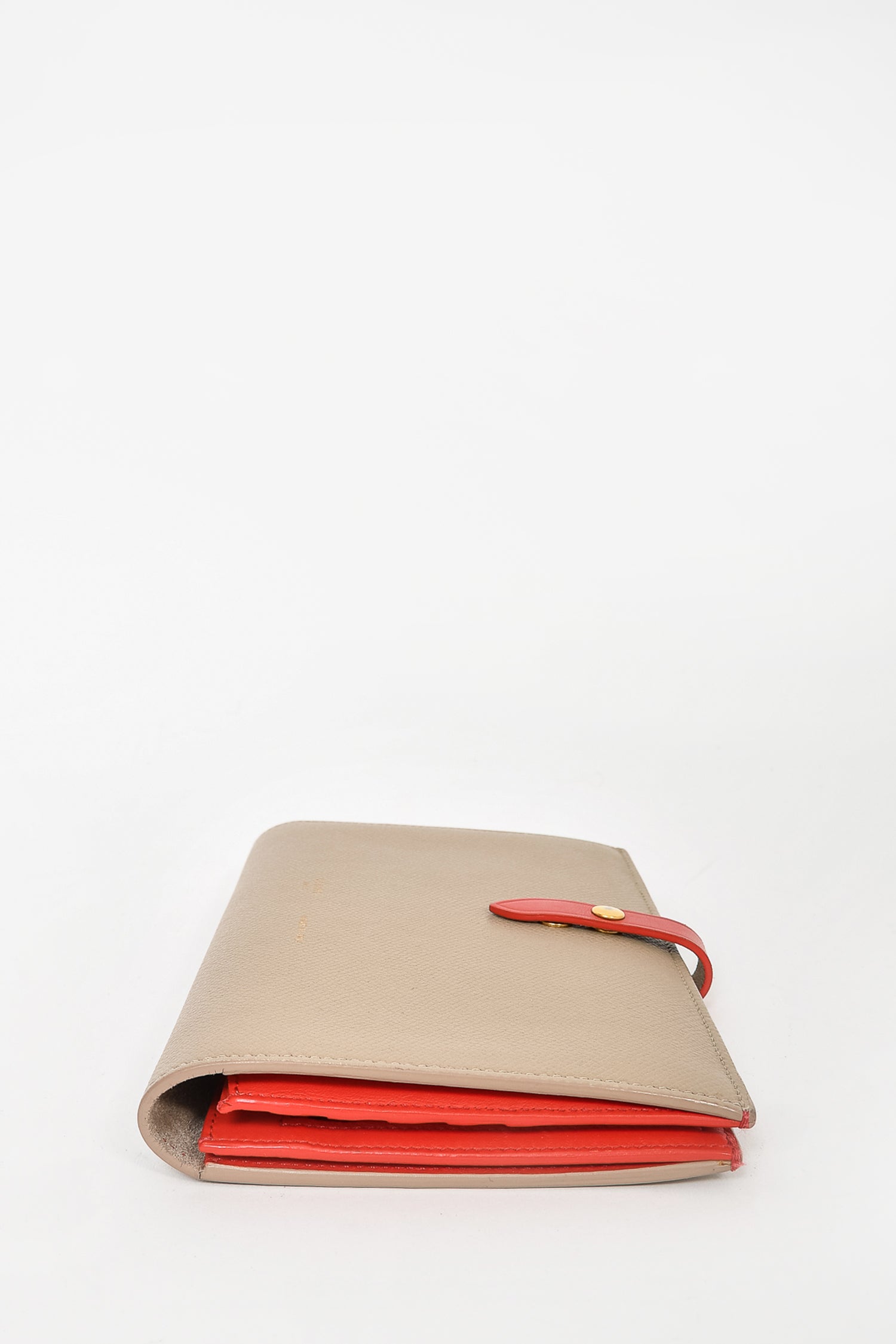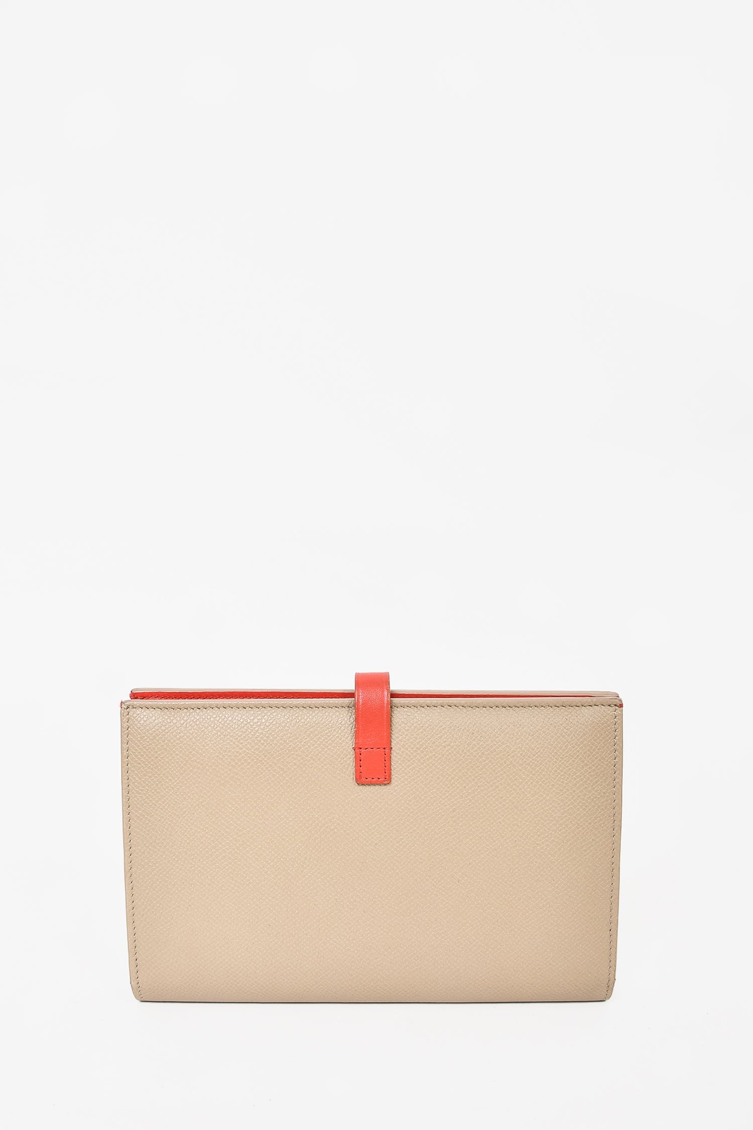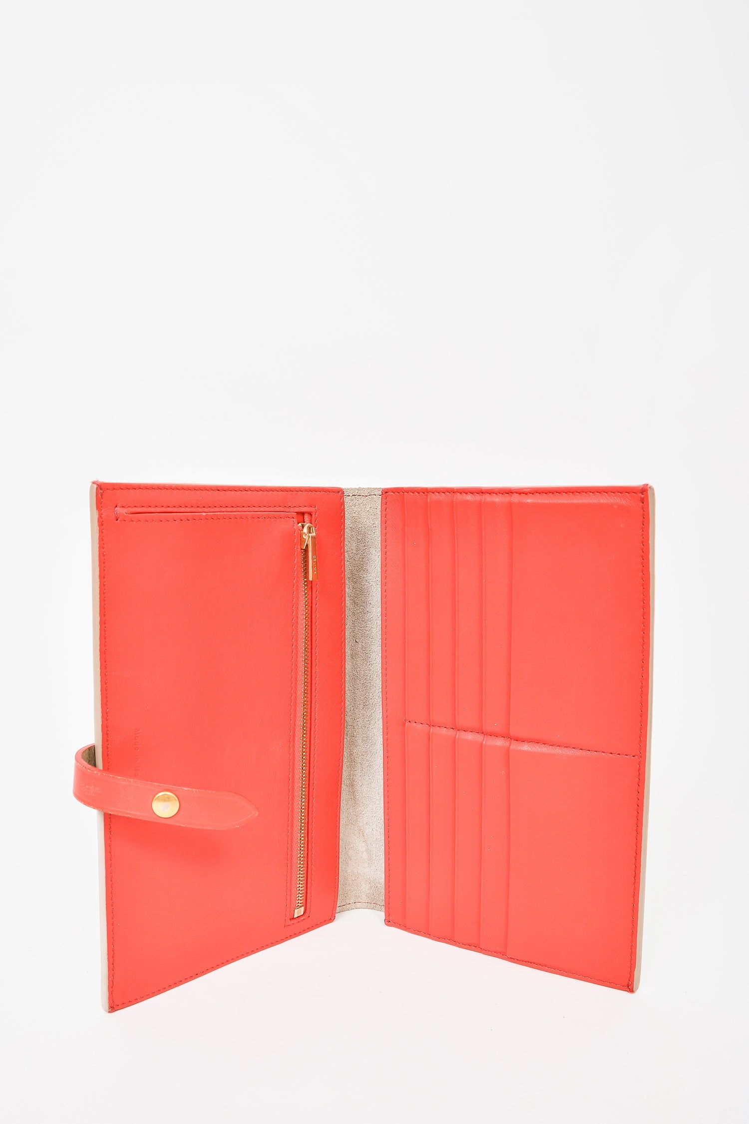Refresh availabilityCeline Beige/Coral Leather Large Strap Wallet. Front foldover strap with snap-button closure. 10 card slots. 3 billfold compartments. 1 zippered compartment. Gold-tone hardware. Tonal stitching.