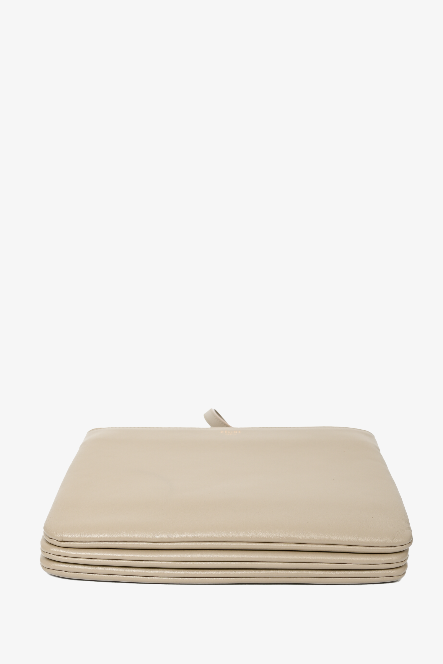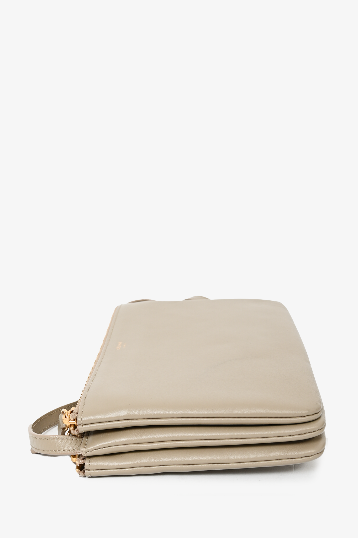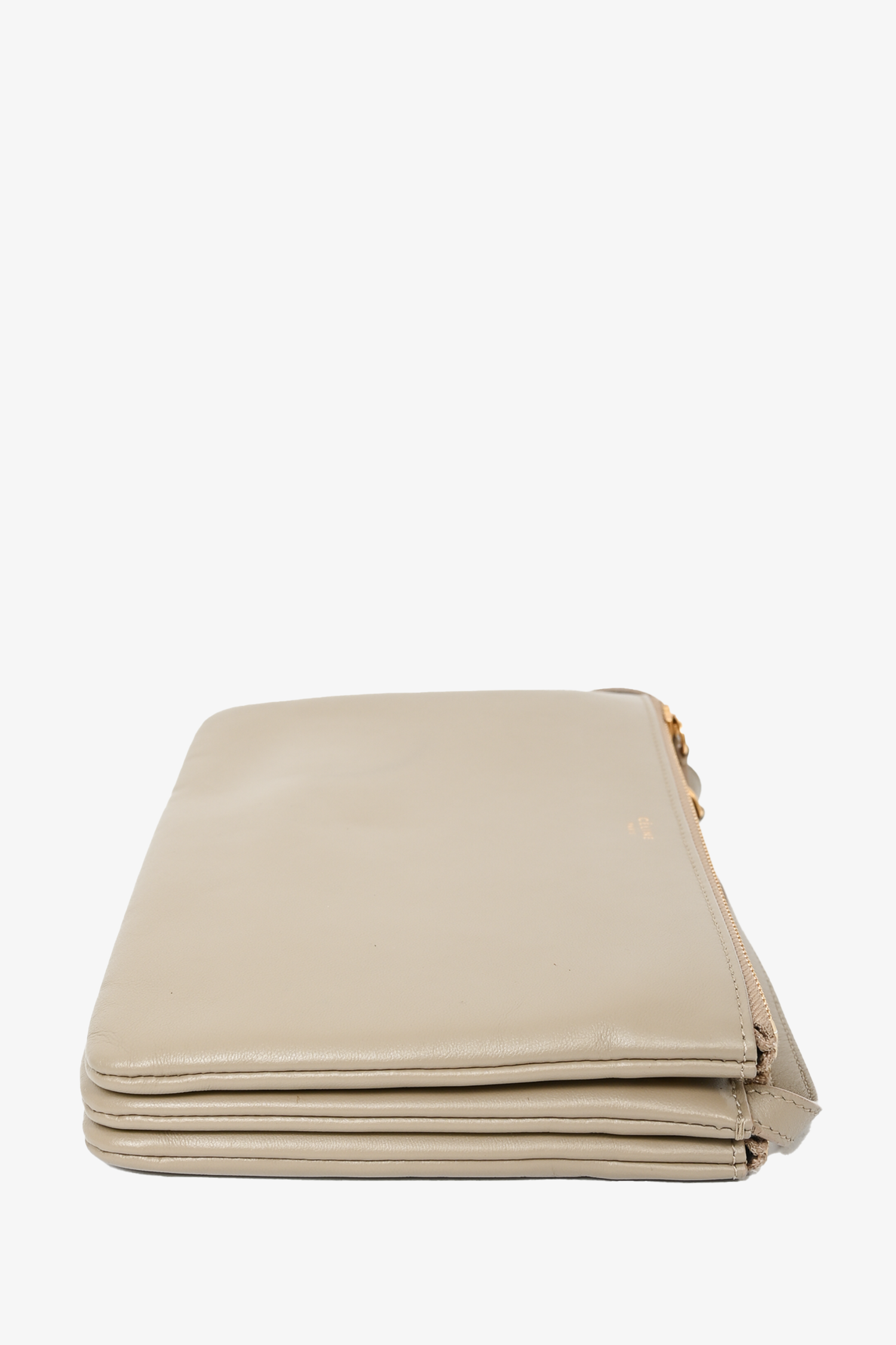 Refresh availabilityCeline Beige Leather Small Trio Crossbody Bag. Top zip closures. Open interior. Adjustable strap. Gold-tone hardware. Tonal stitching.