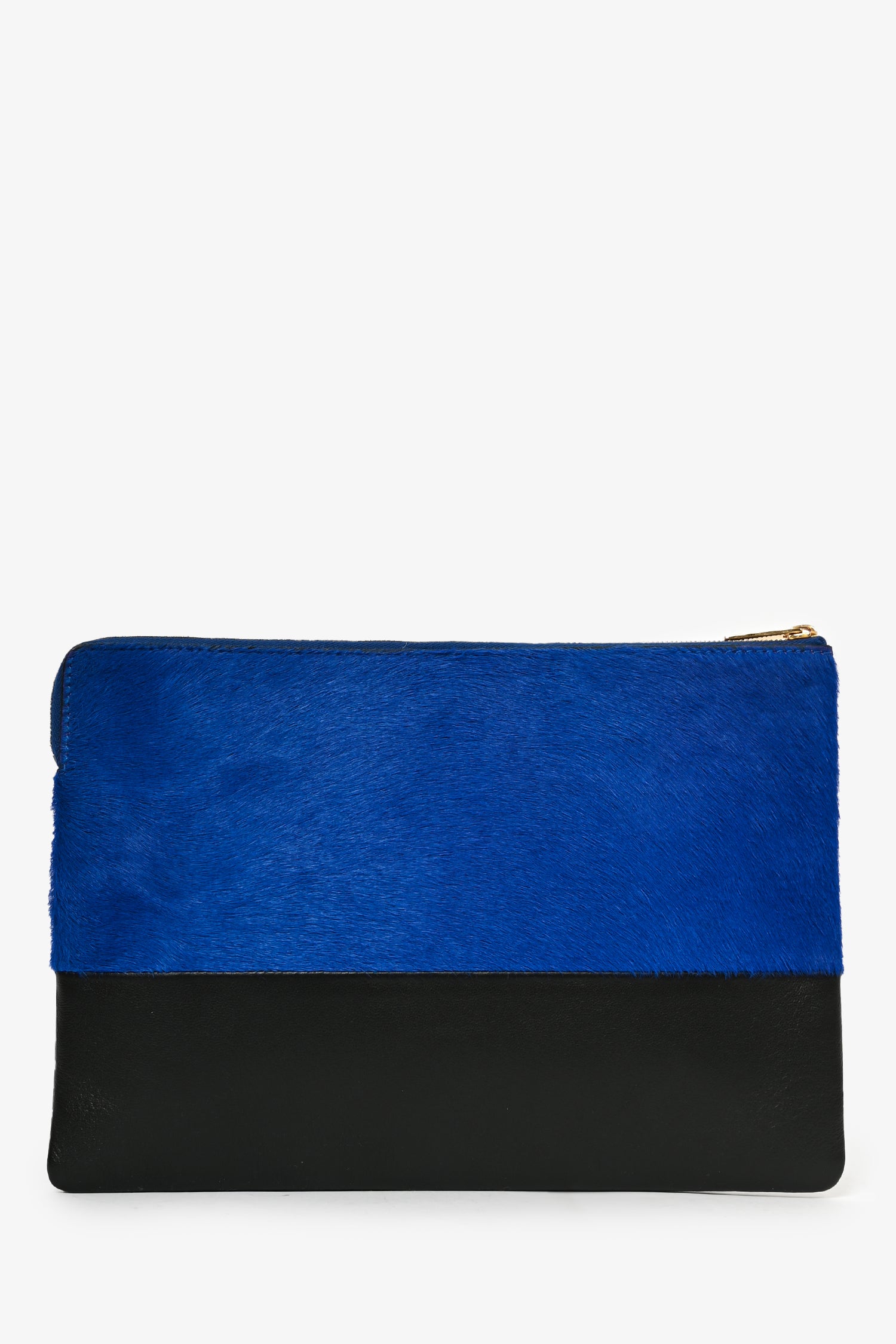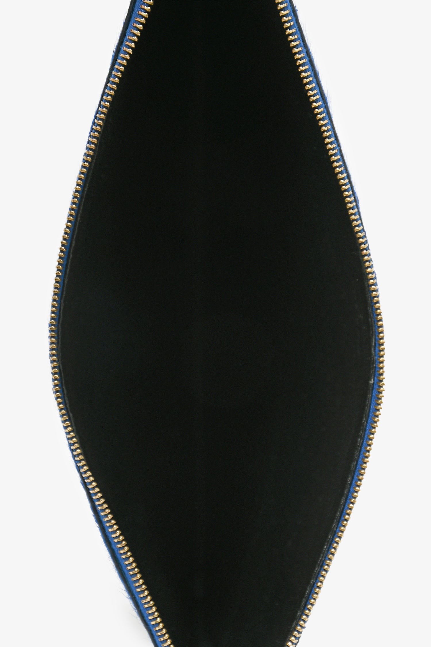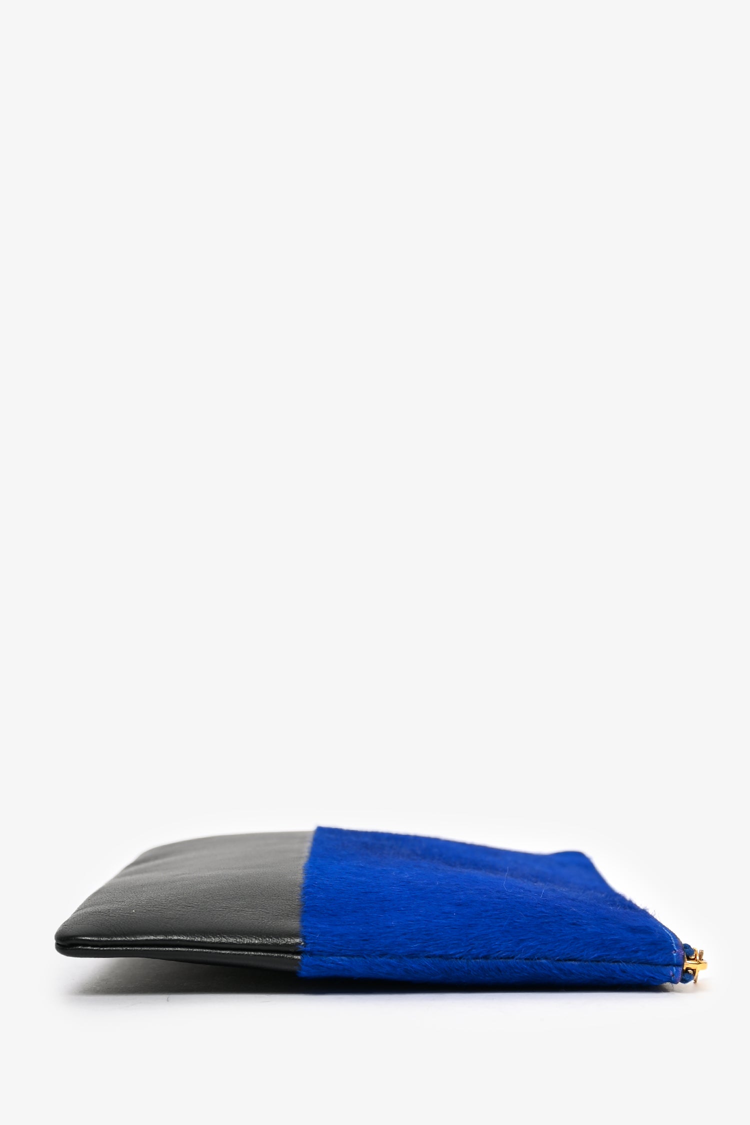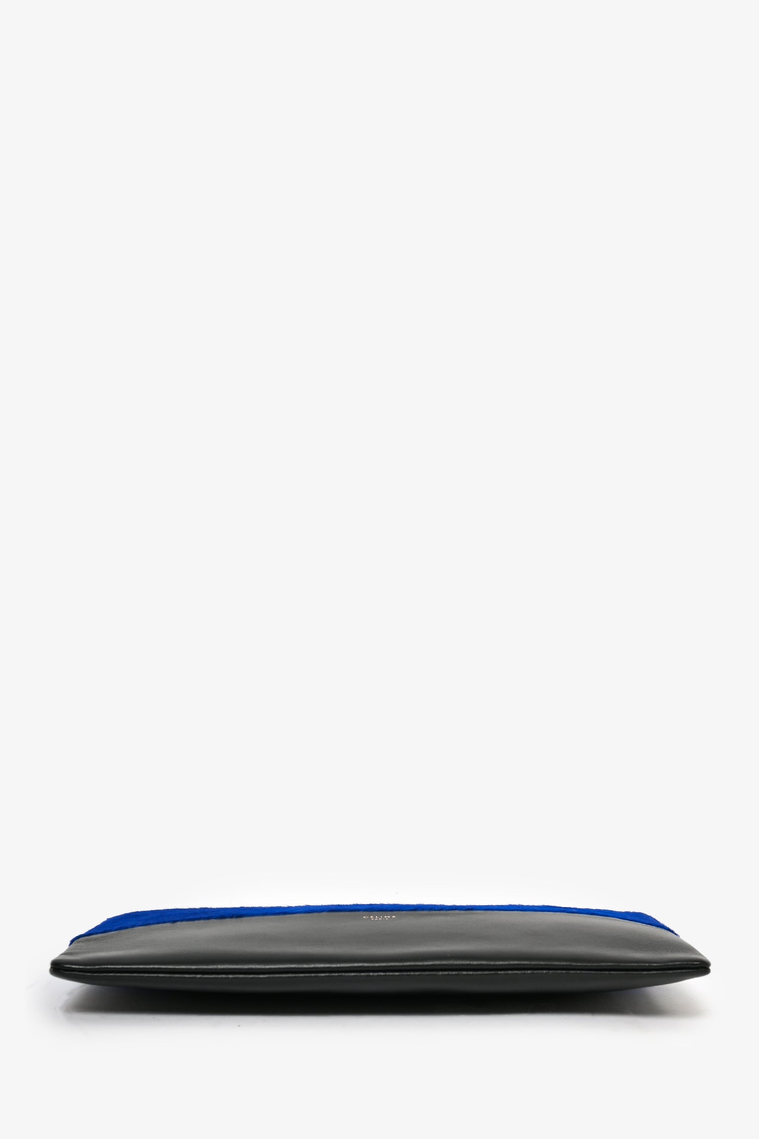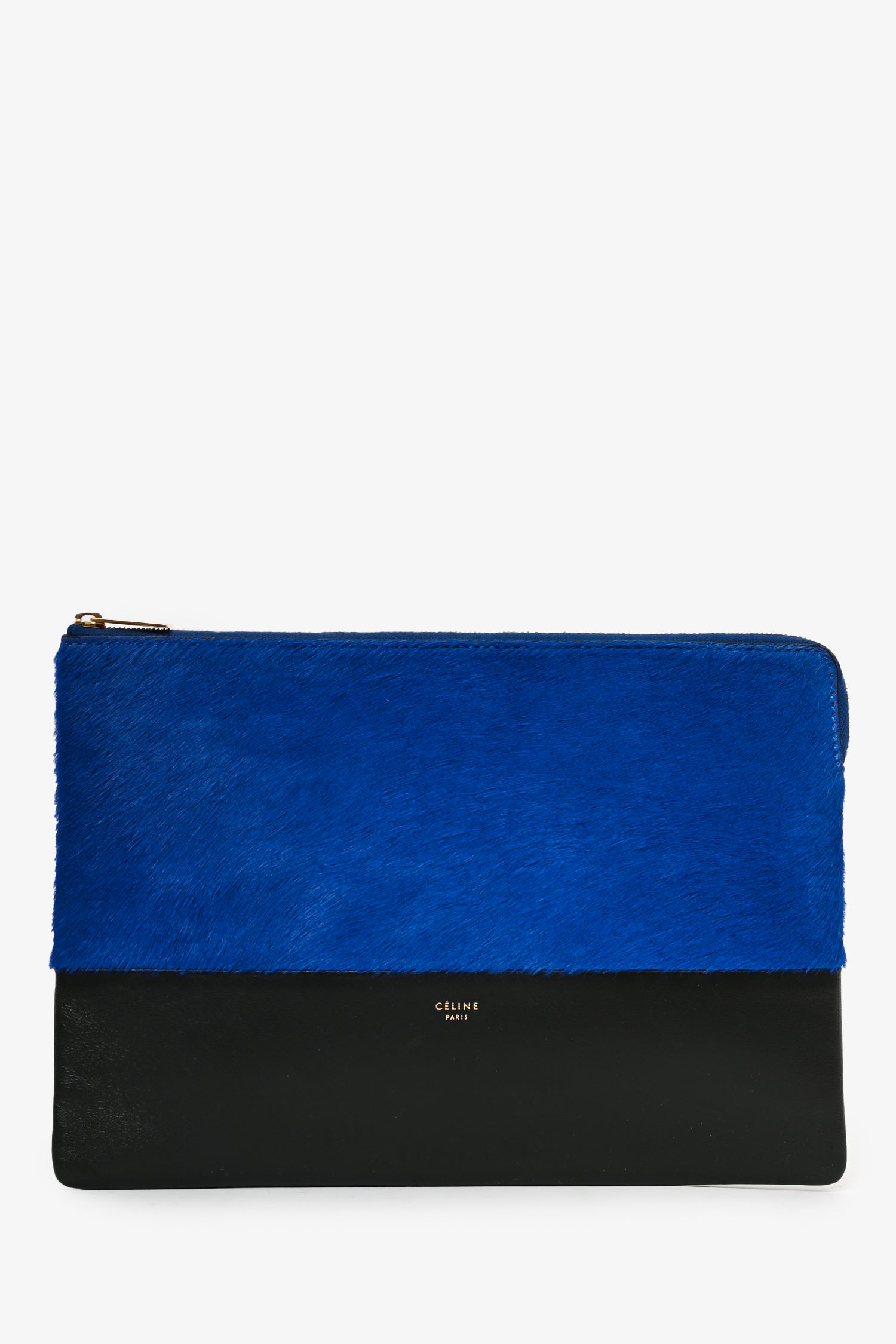 Refresh availabilityCeline Black/Blue Leather/Pony Hair Zip Clutch. Top zipper closure. Open compartment. Unlined. Tonal stitching.