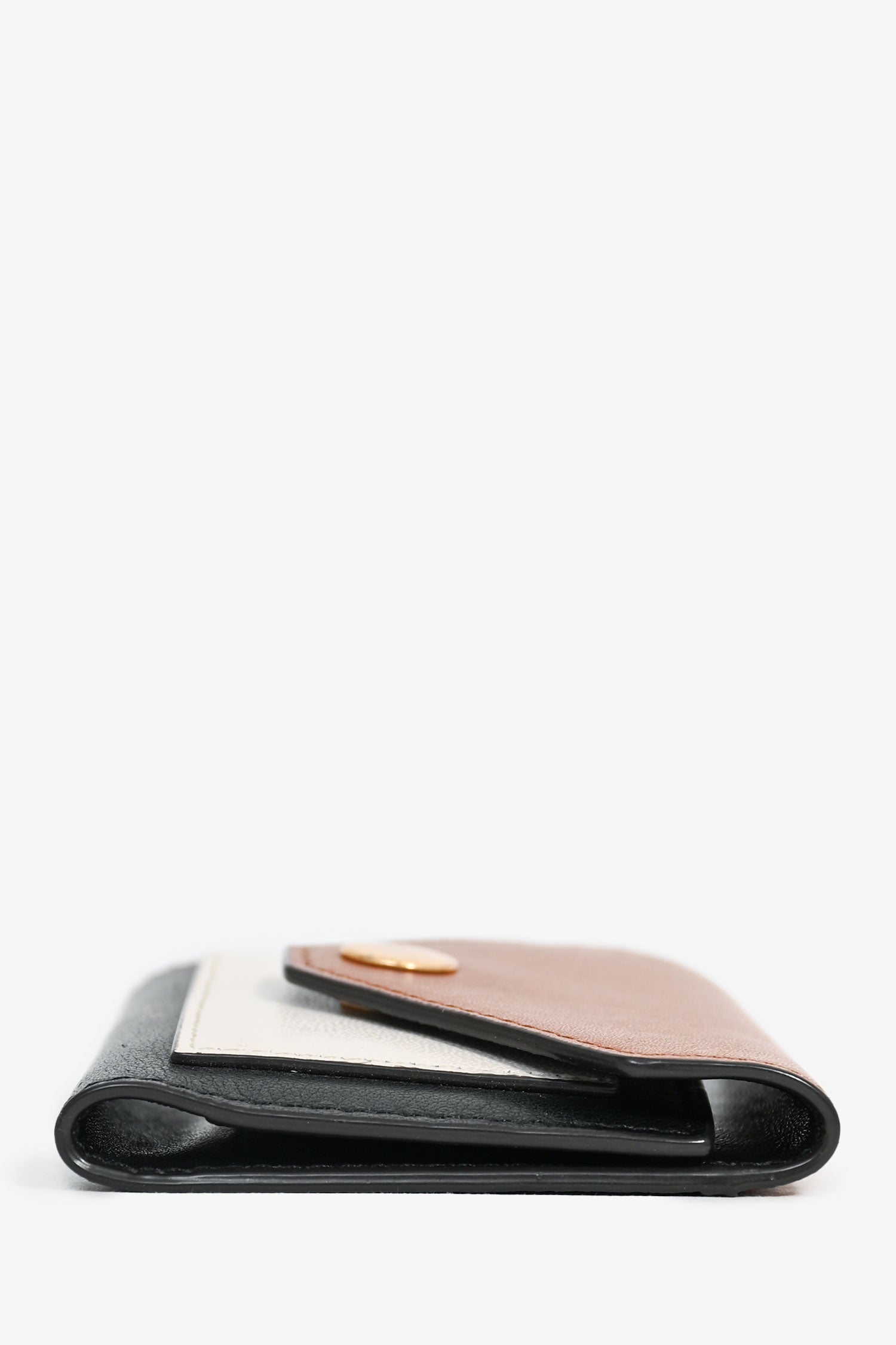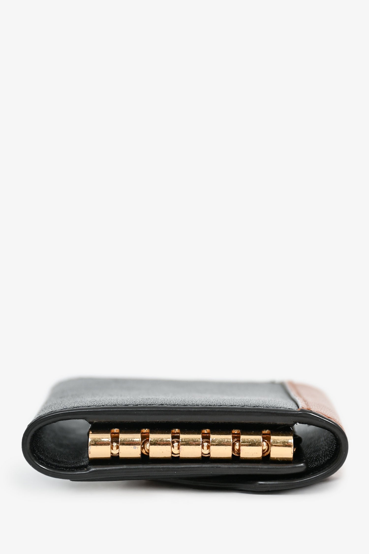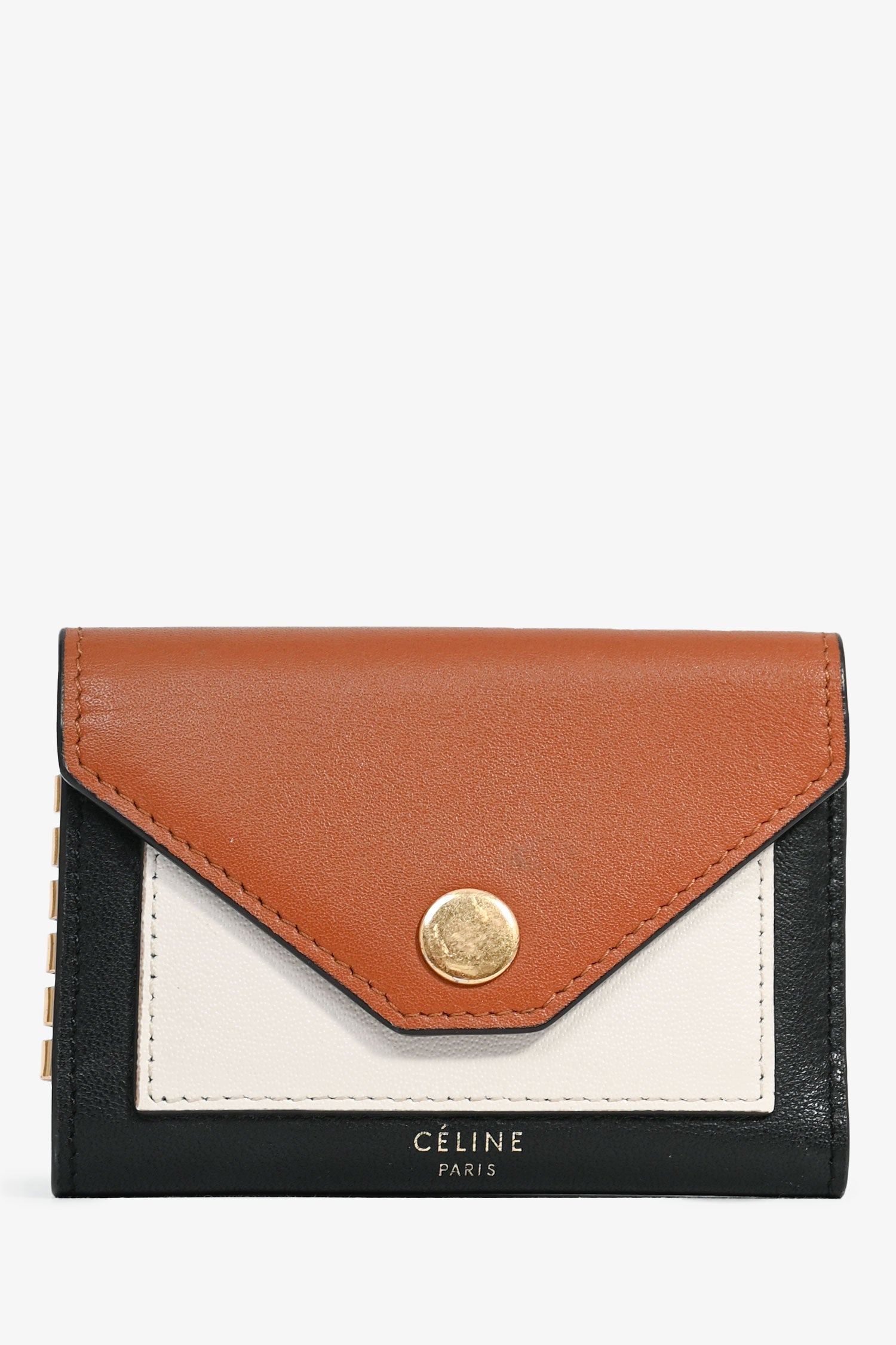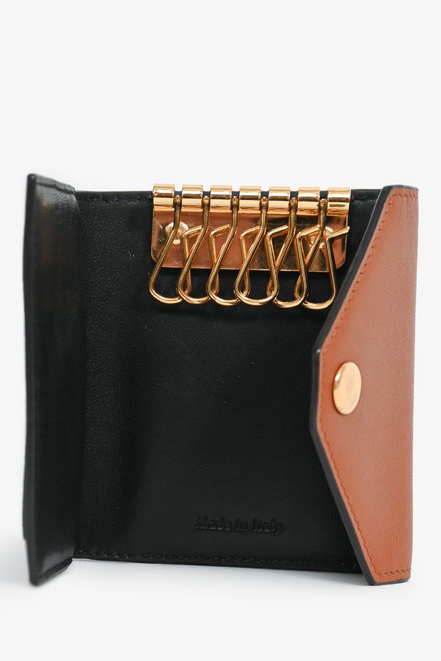 Refresh availabilityCeline Black/Brown Leather Key Holder. Front fold-over flap with snap button. Bi-fold with an interior slip pocket. Front exterior slip pocket. Six interior key holder. Gold-tone hardware. Tonal stitching.