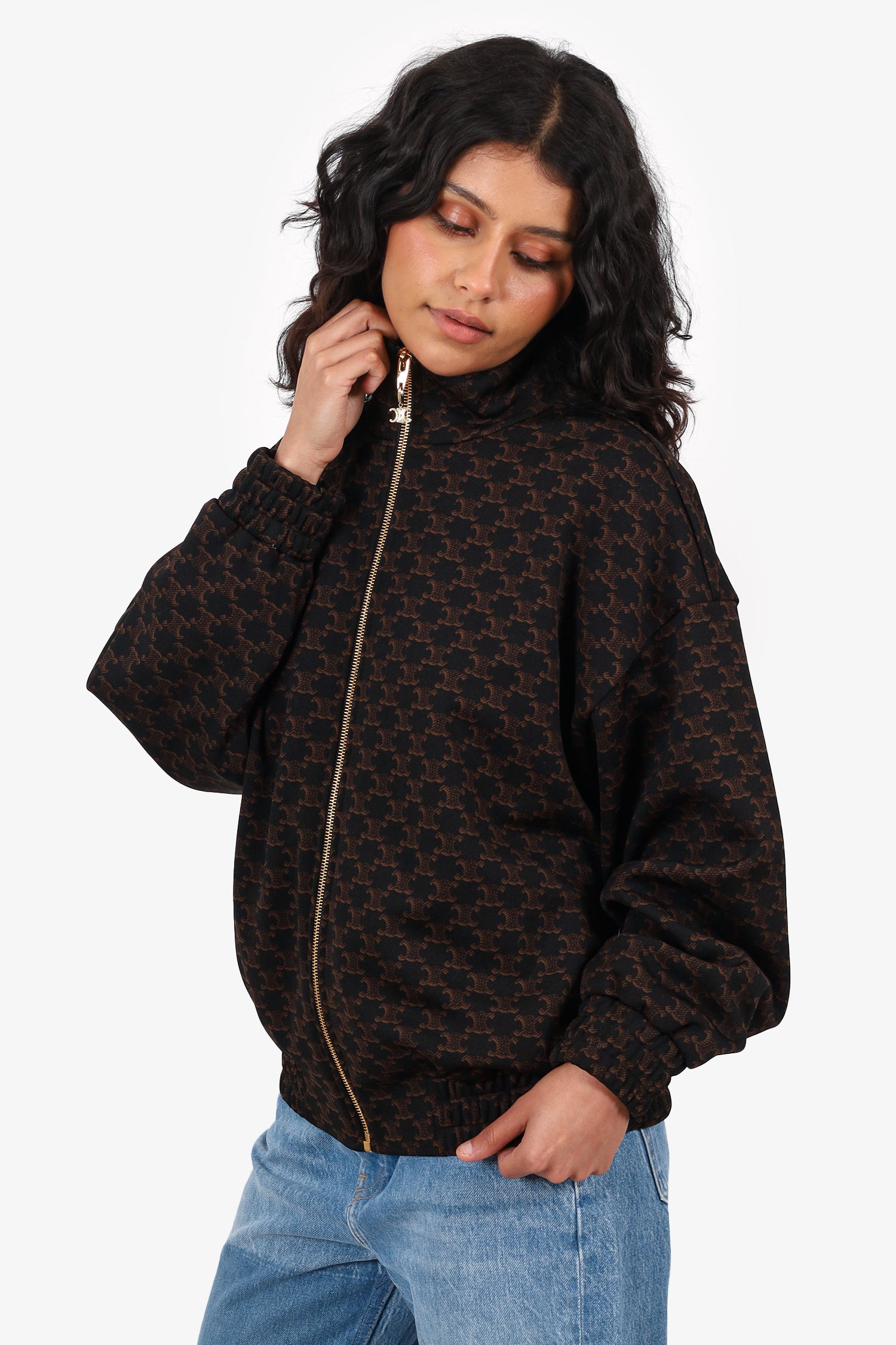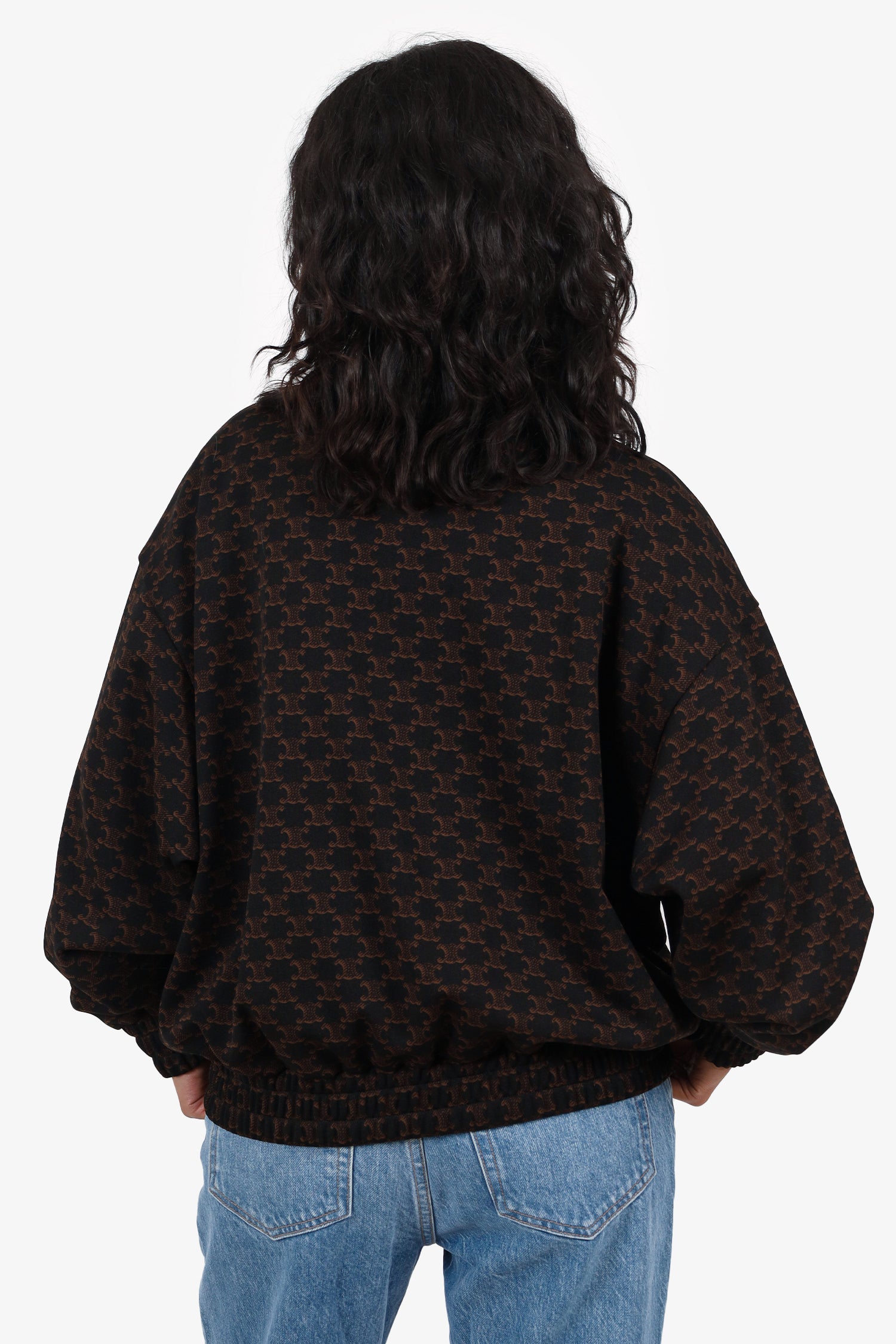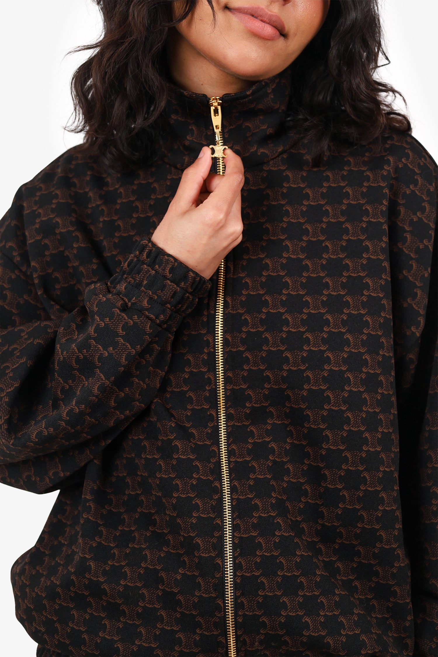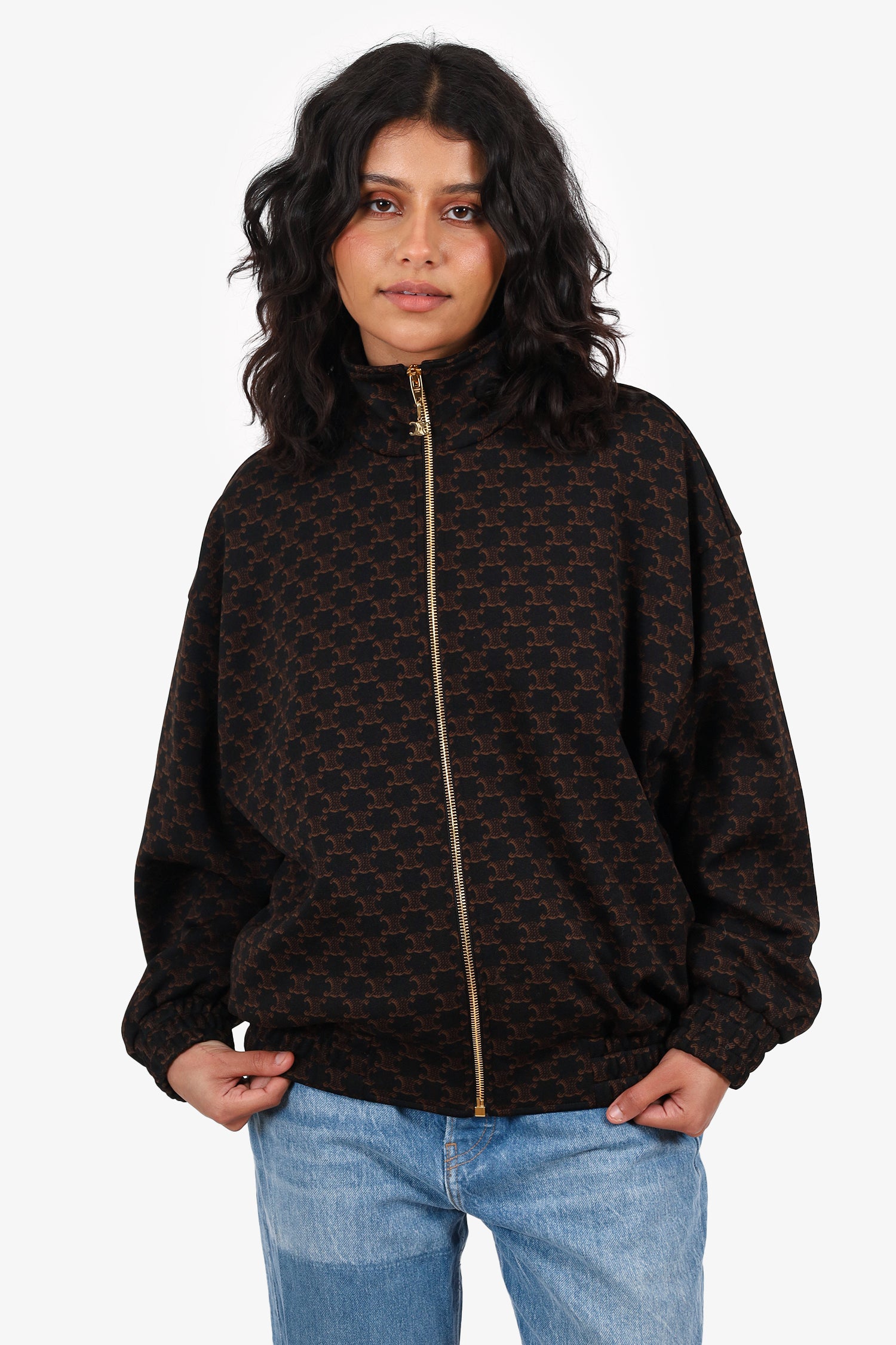Refresh availabilityCeline Black/Brown Triomphe Logo Bomber Jacket. Pull-on. Front zip closure. Elasticated sleeve cuffs and waistband. 2 exterior slip pockets. Lined interior. Gold-tone hardware. Tonal stitching.