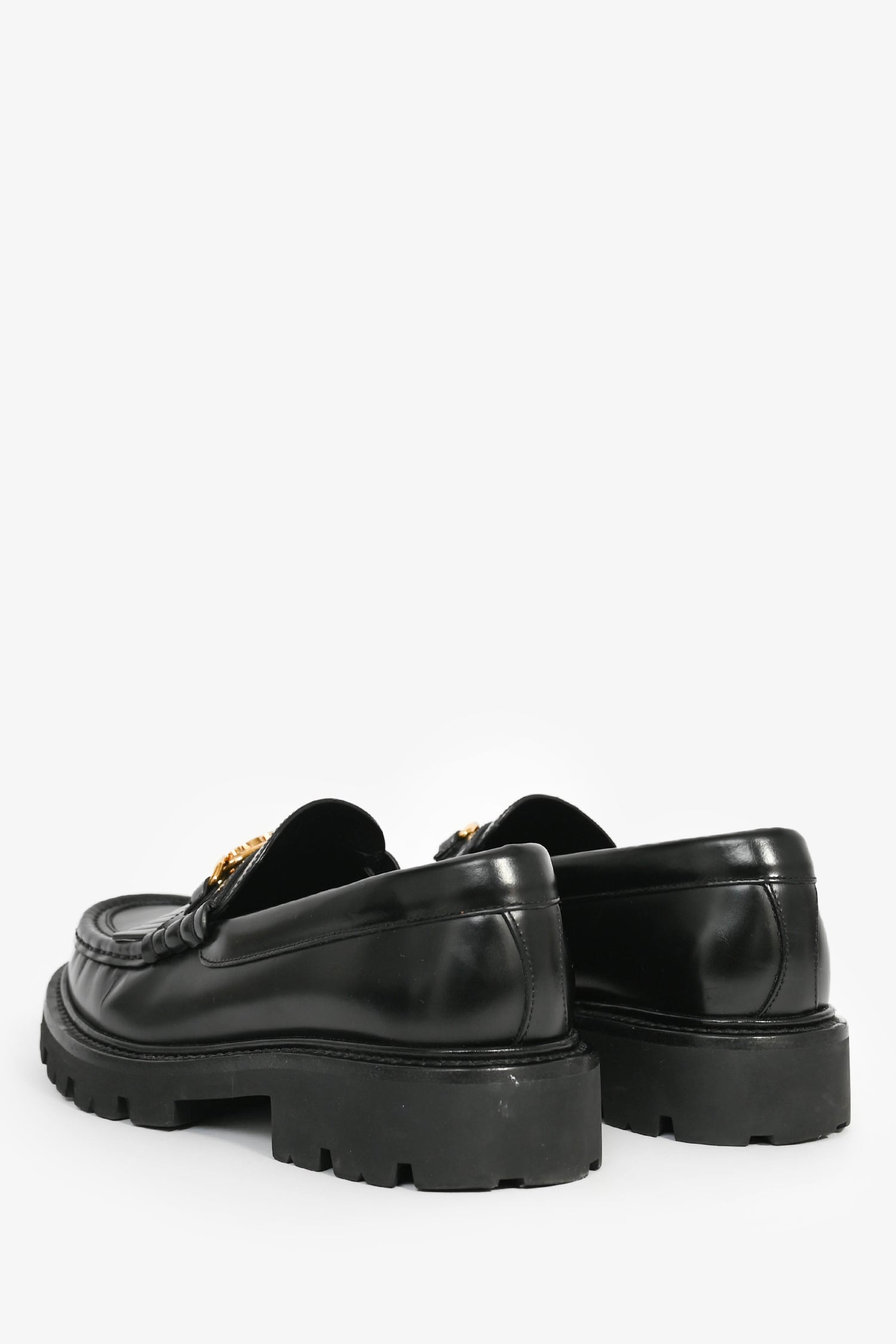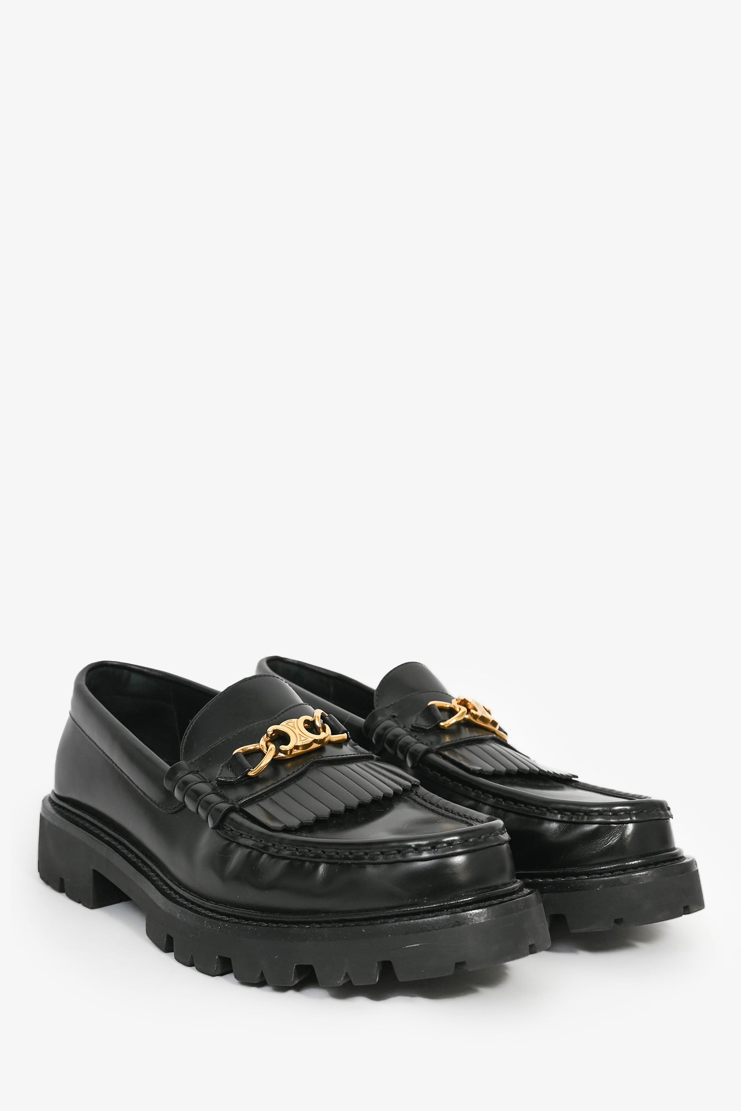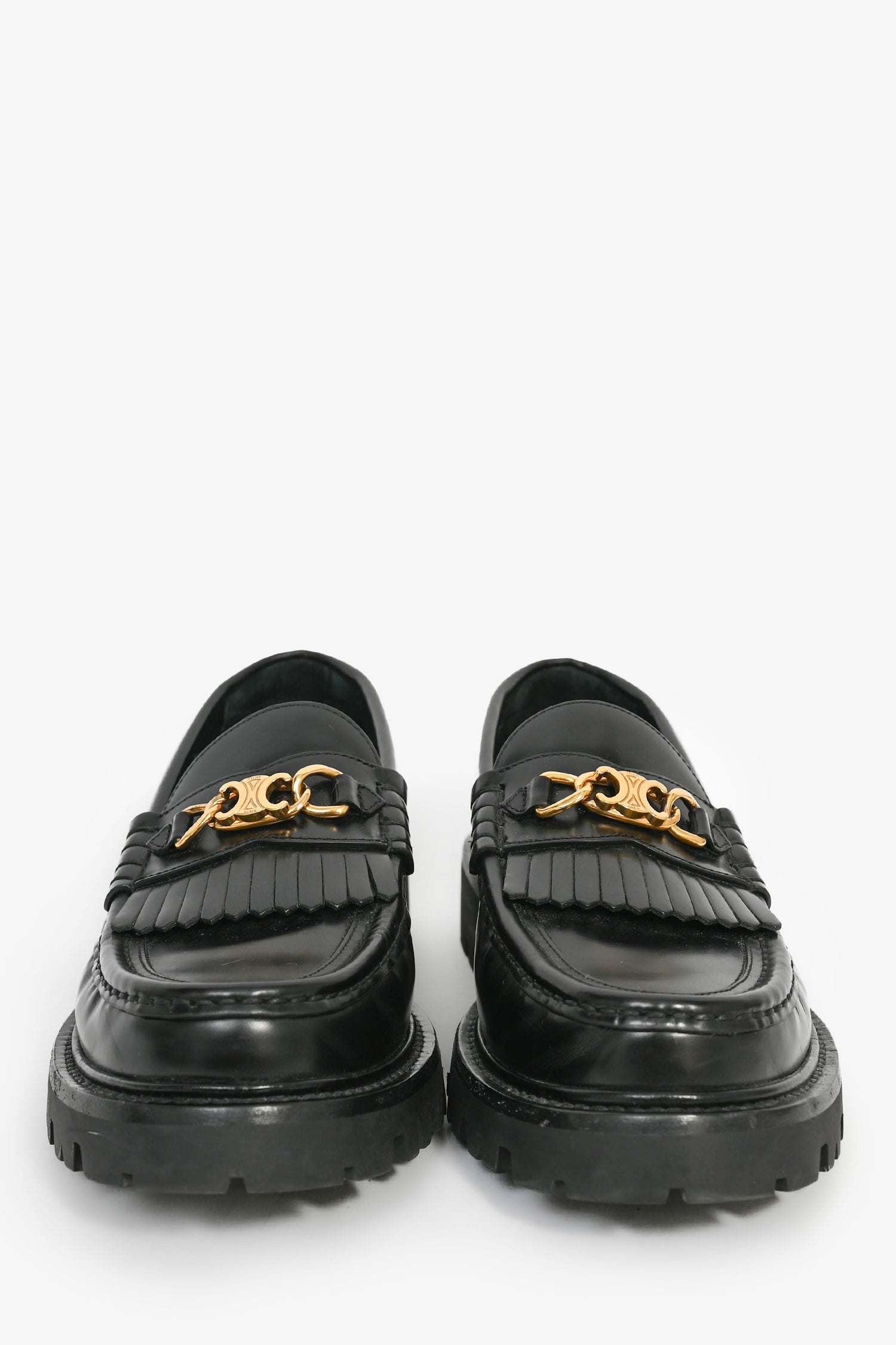 Refresh availabilityCeline Black Brushed Leather Triomphe 'Margaret' Loafers. Rounded toe. Gold-tone logo hardware. Leather insoles. Treaded rubber soles. Tonal stitching.