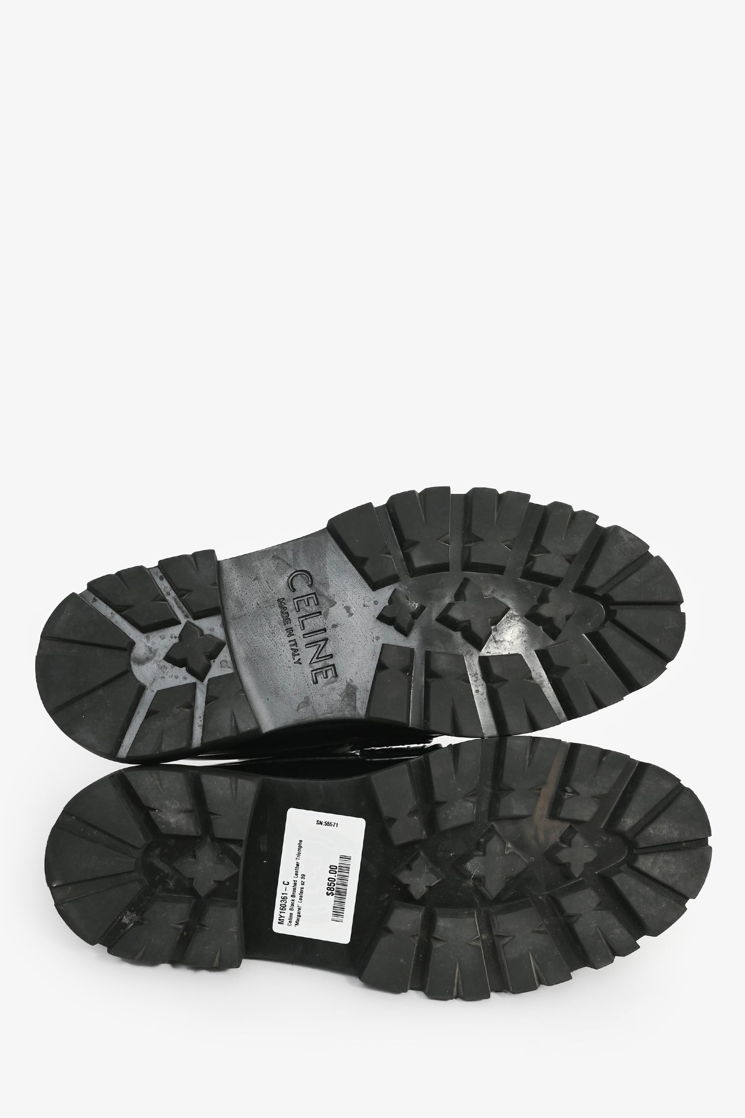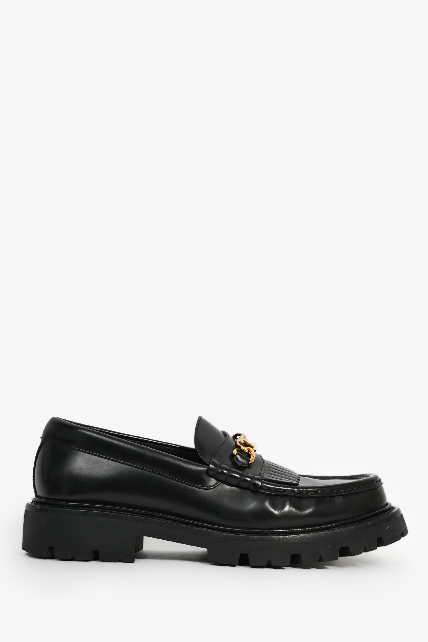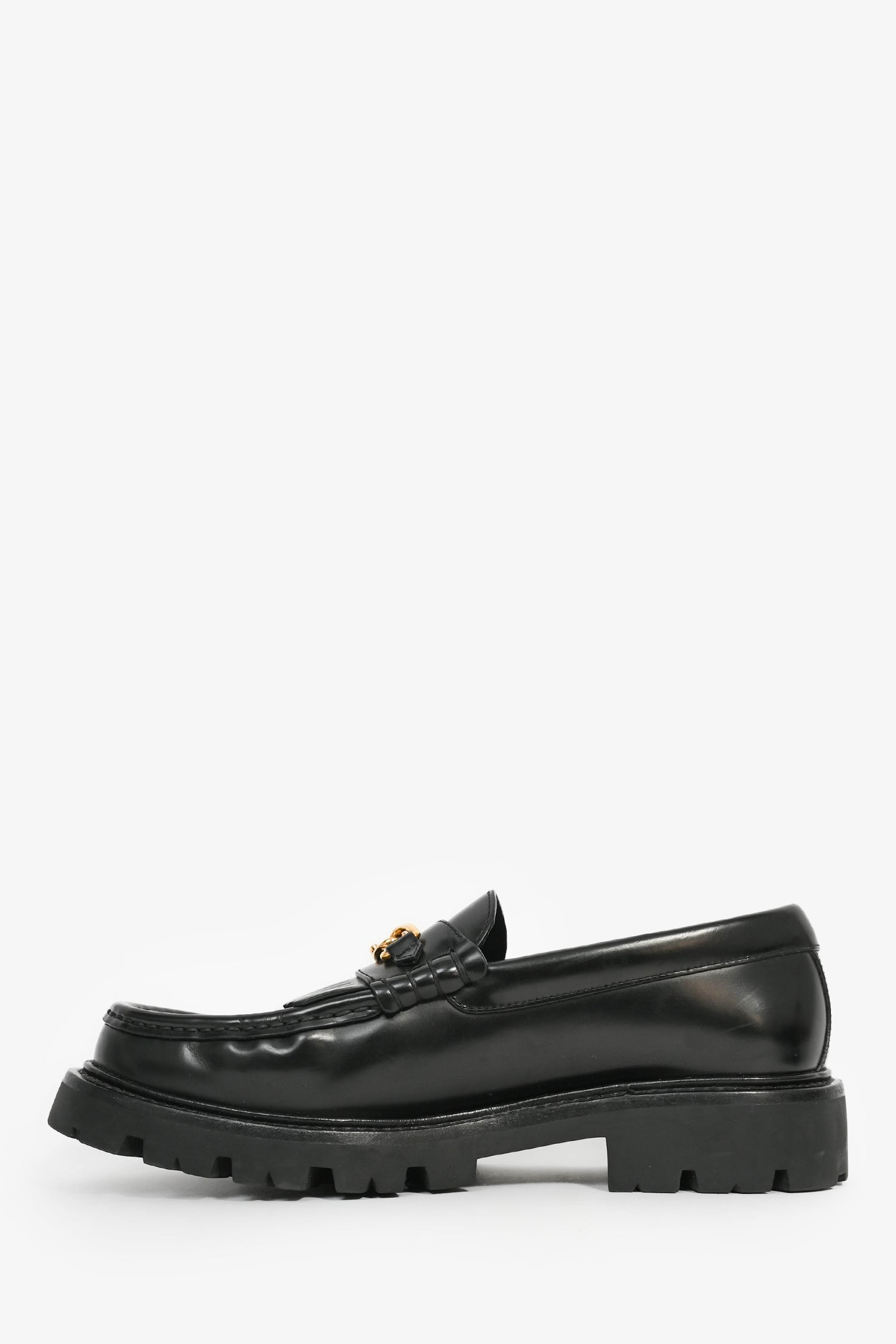Refresh availabilityCeline Black Brushed Leather Triomphe 'Margaret' Loafers. Rounded toe. Gold-tone logo hardware. Leather insoles. Treaded rubber soles. Tonal stitching.