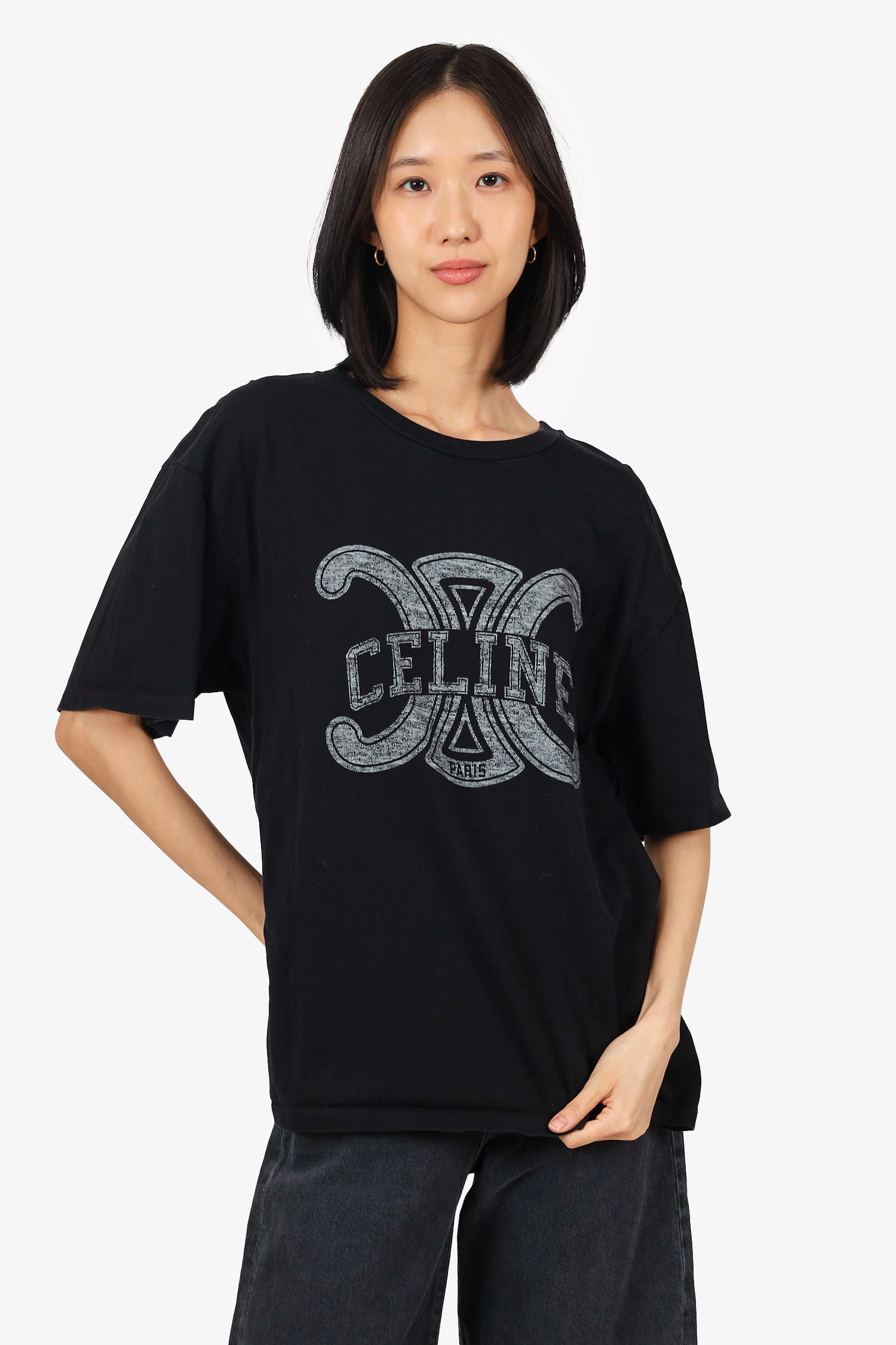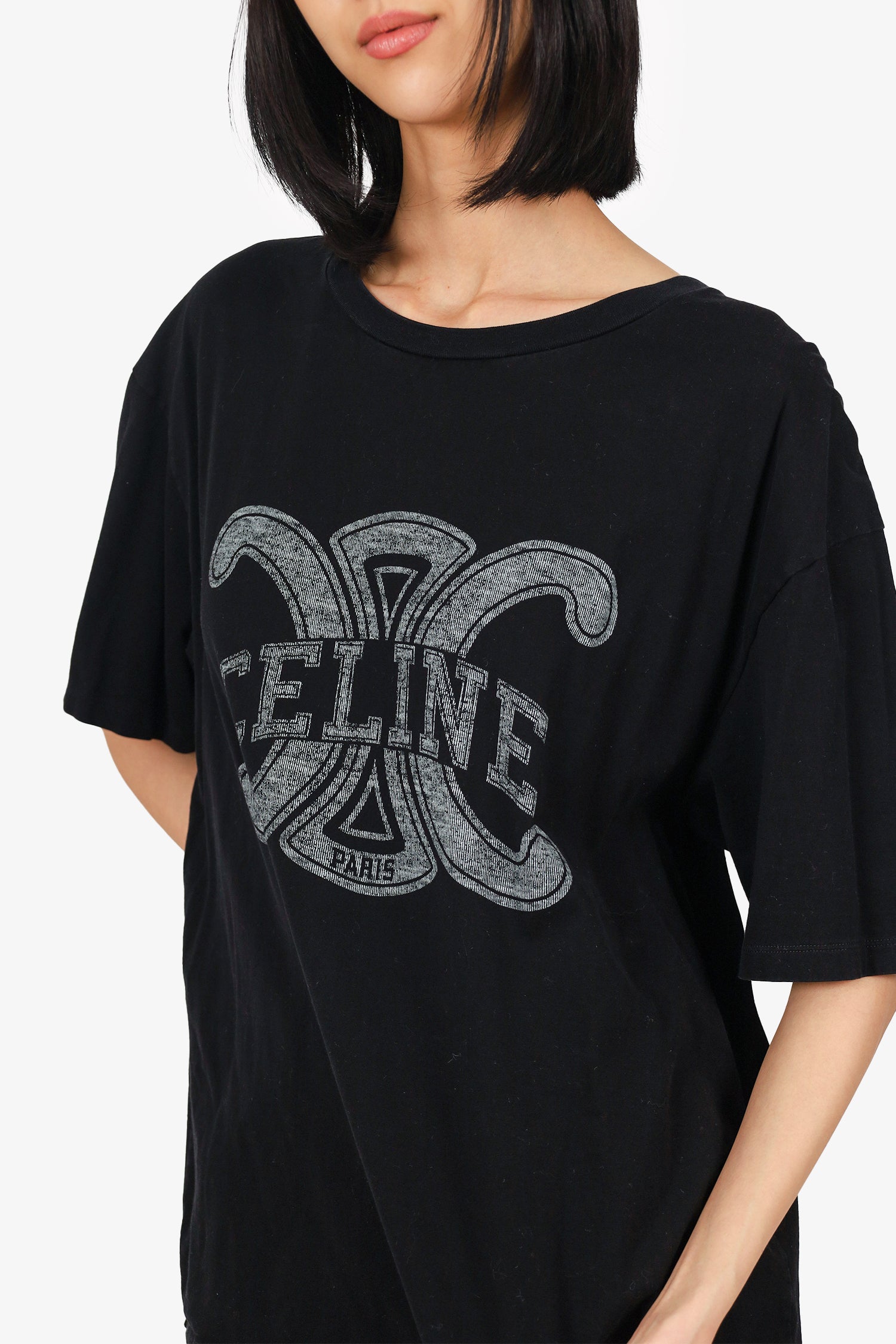 Refresh availabilityCeline Black Cotton Triomphe T-Shirt. Pull-on. Round neckline. Front centre graphic. Tonal stitching.