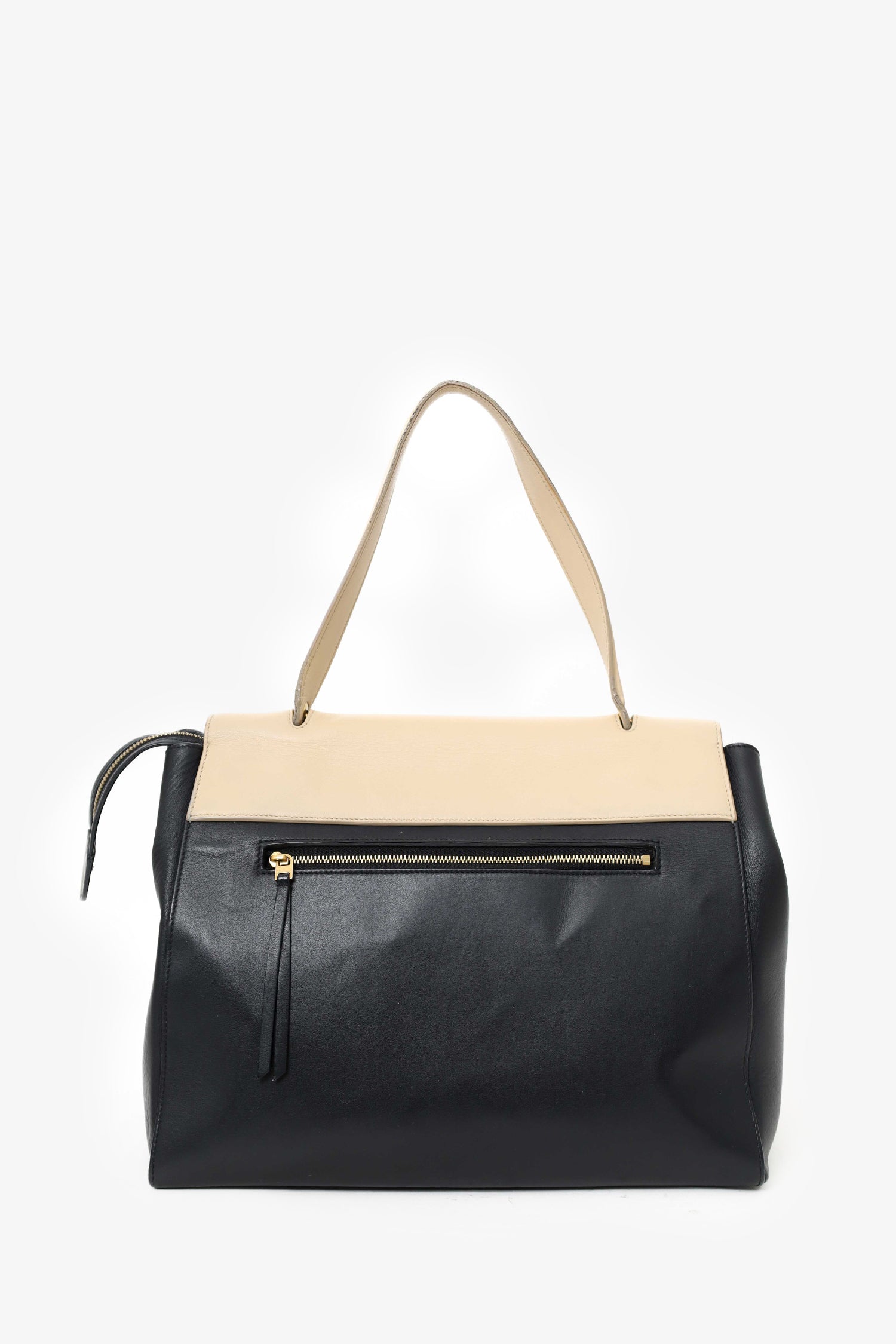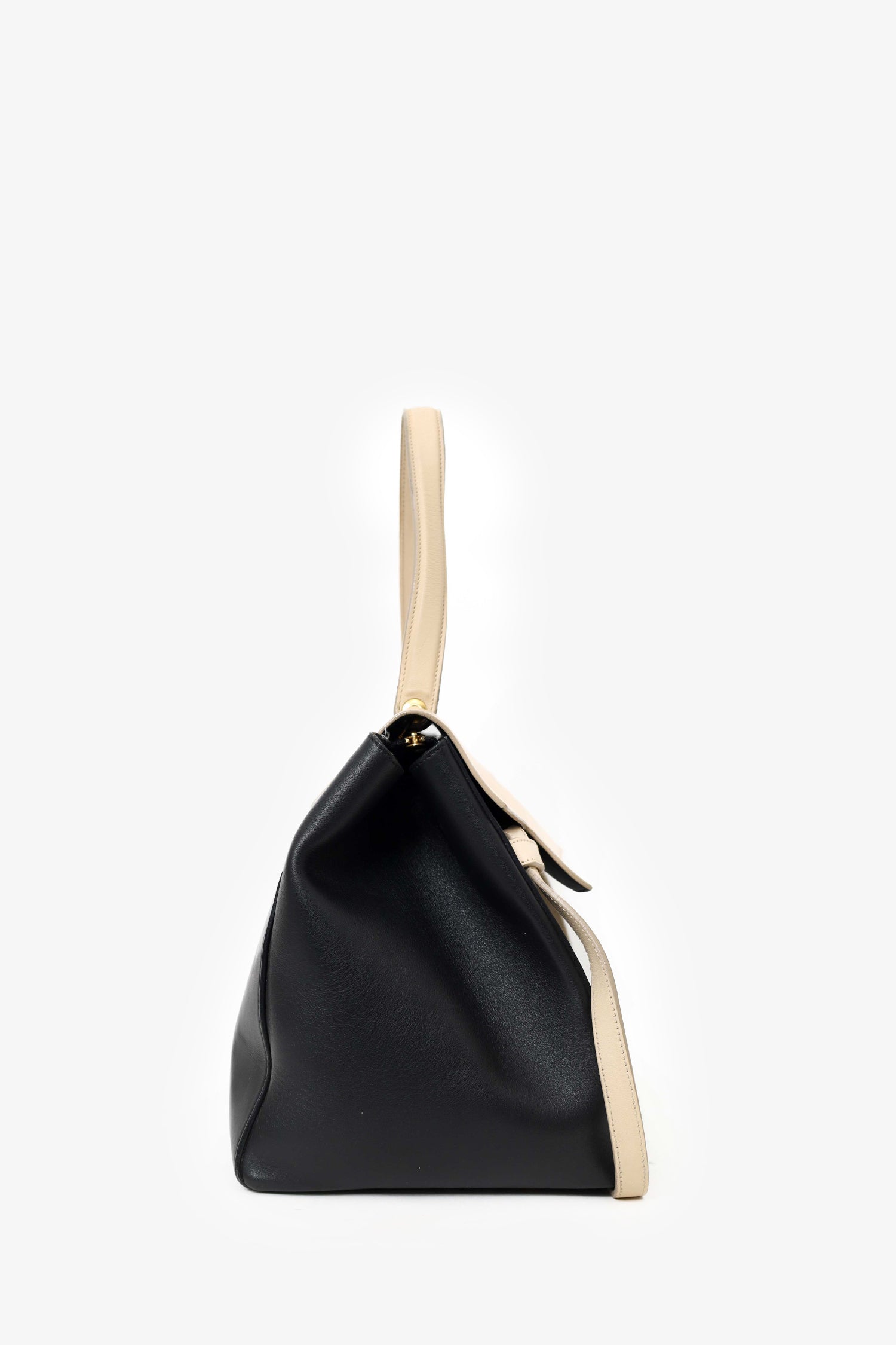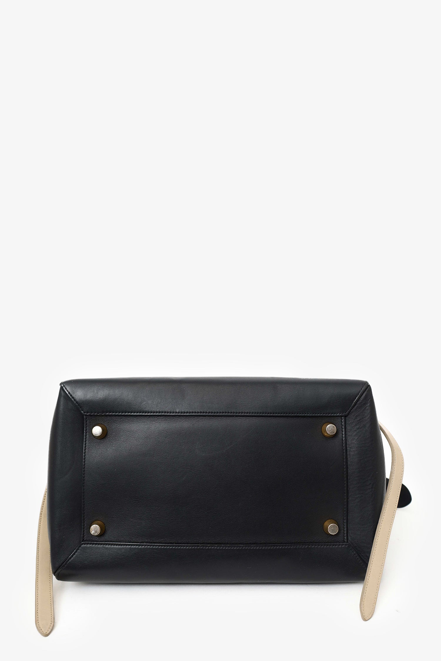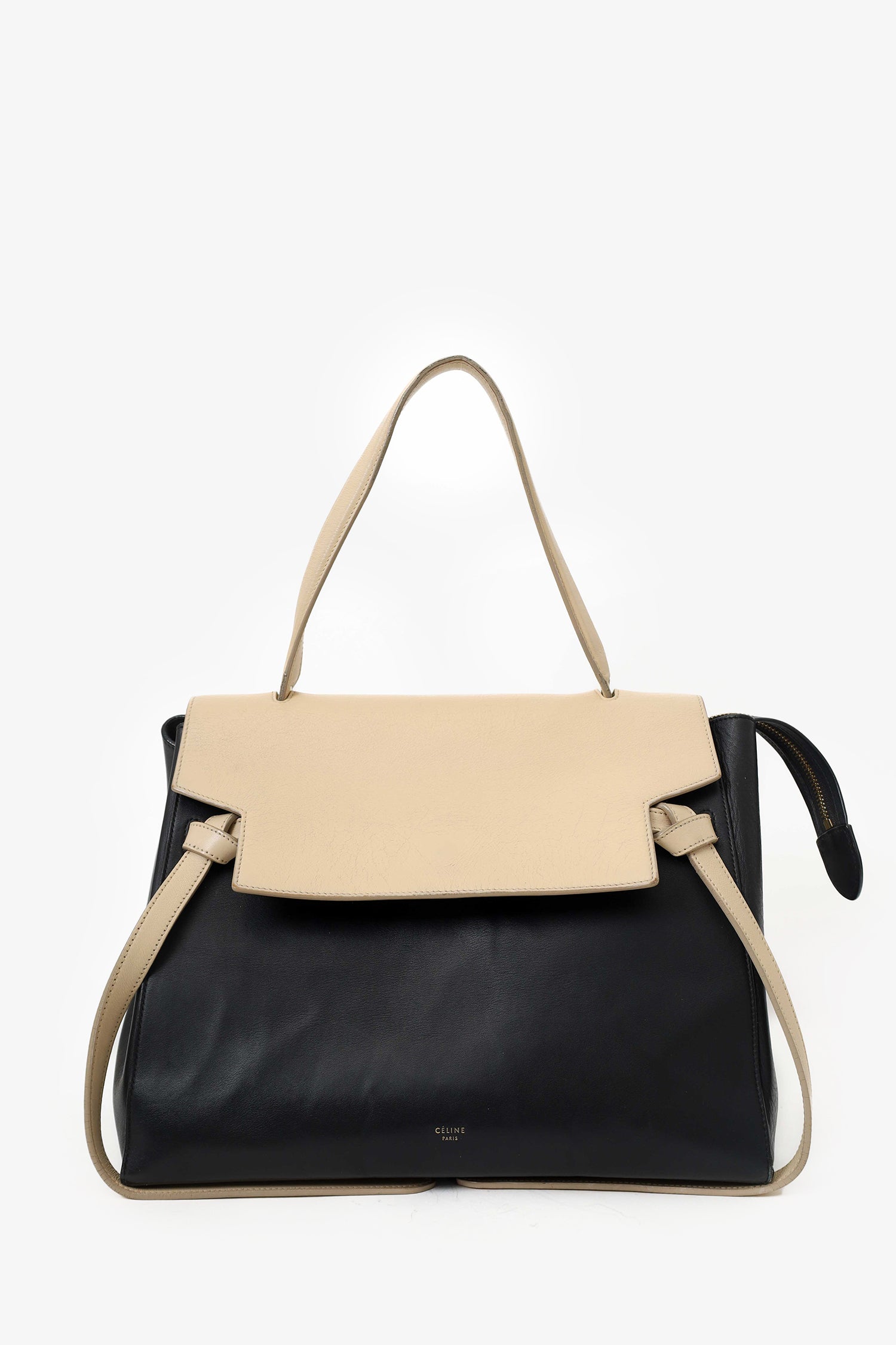 Refresh availabilityCeline Black/Cream Leather Logo Belt Bag. Front fold-over flap with slide-lock closure. Top handle. Top zip closure. Single rear zip pocket. Protective base studs. Suede-lined interior. 2 interior slip pockets. Gold-tone hardware. Tonal stitching.