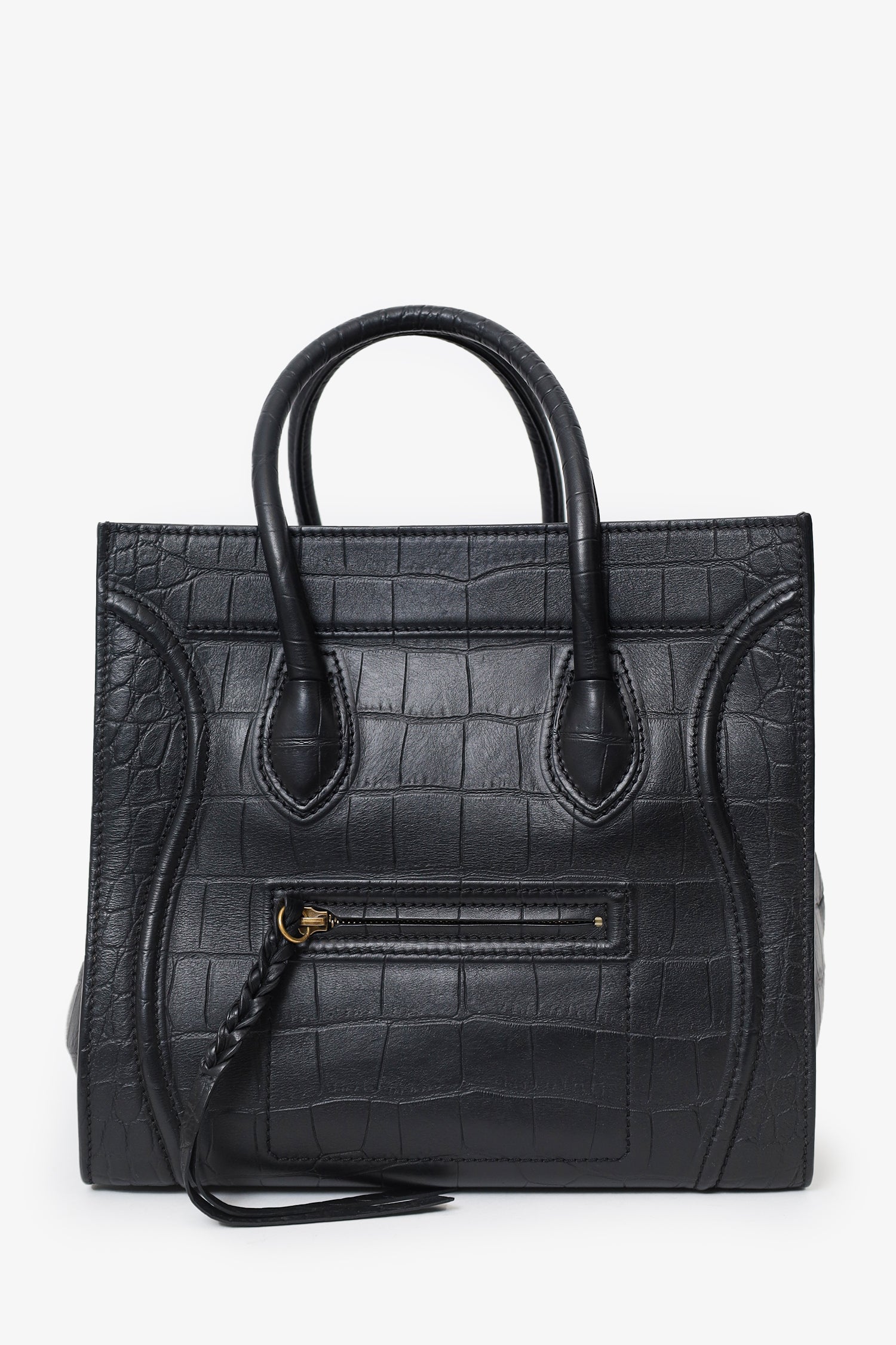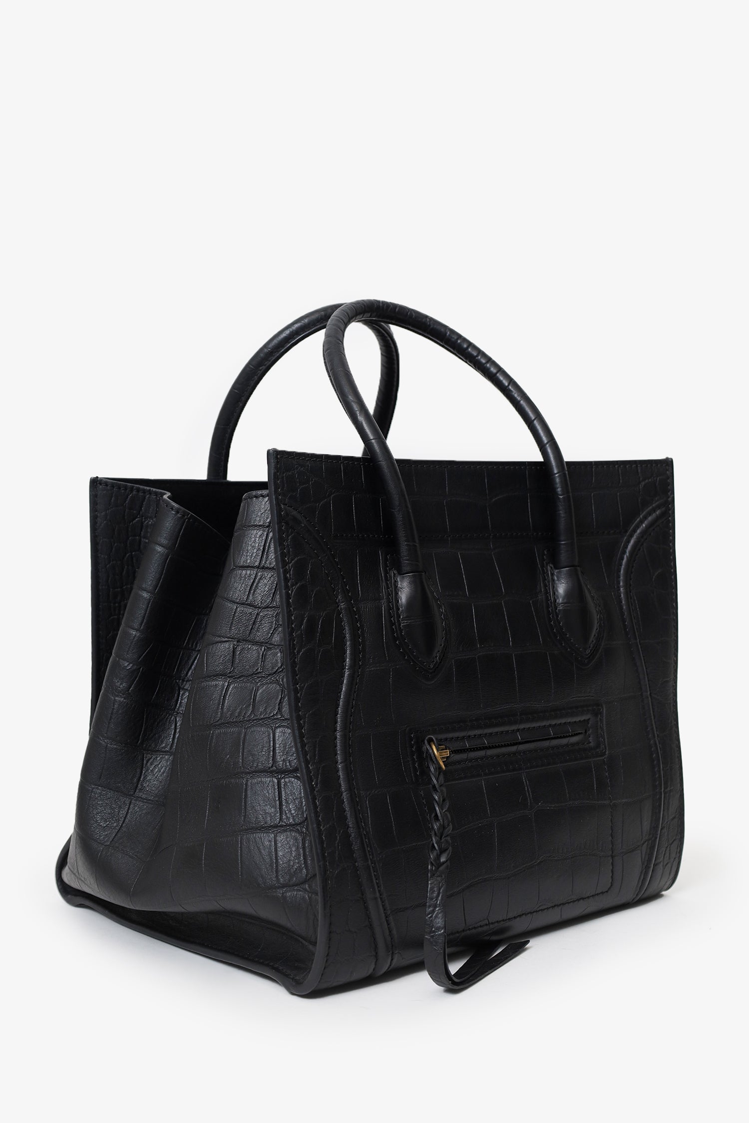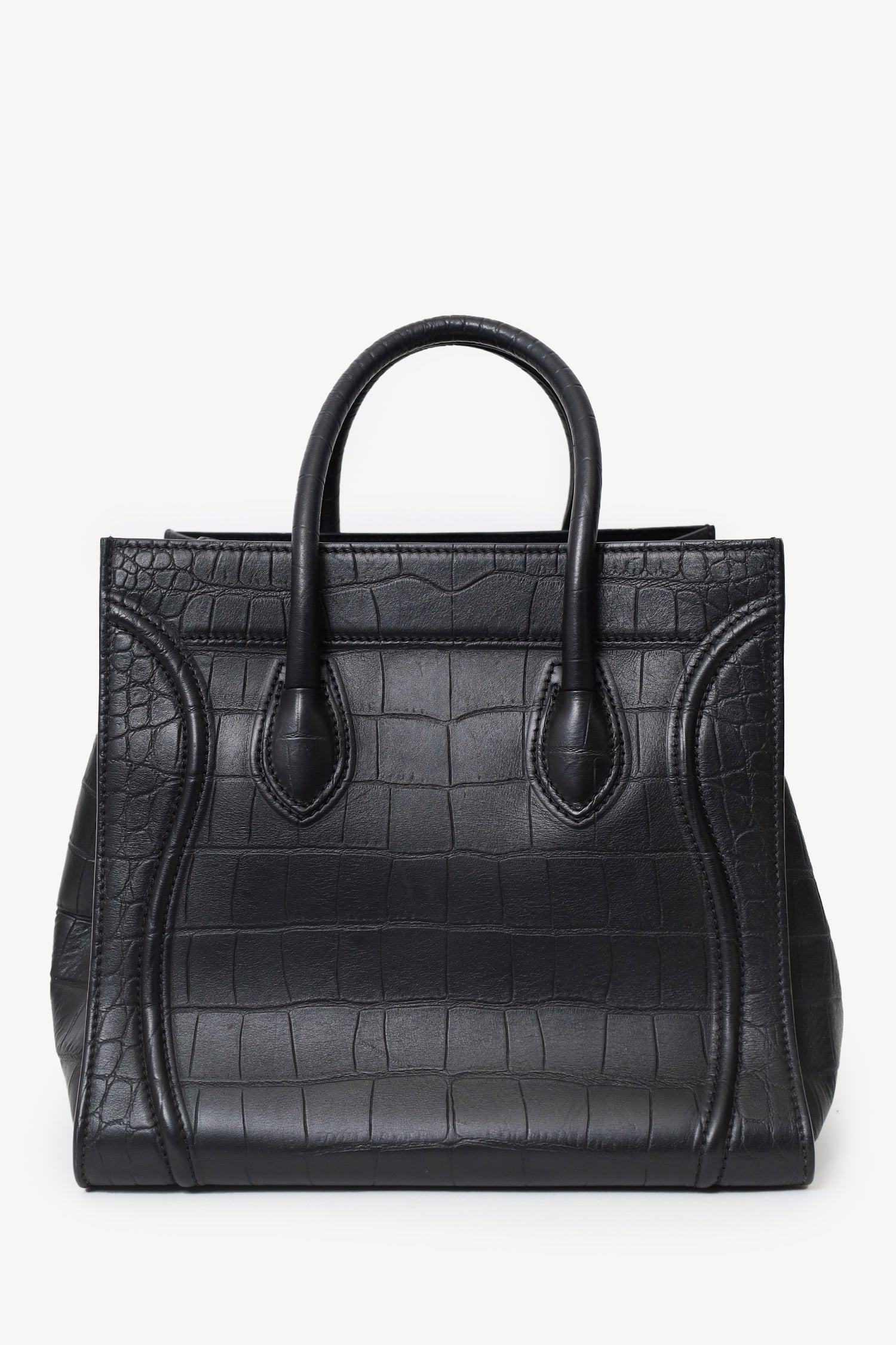 Refresh availabilityCeline Black Croc Embossed Leather Luggage Phantom Top Handle. Top open with adjustable strap closure. Twin top handles. Single front exterior zip pocket. Suede-lined interior. Single interior zip pocket. Tonal stitching. Gold-tone hardware.
