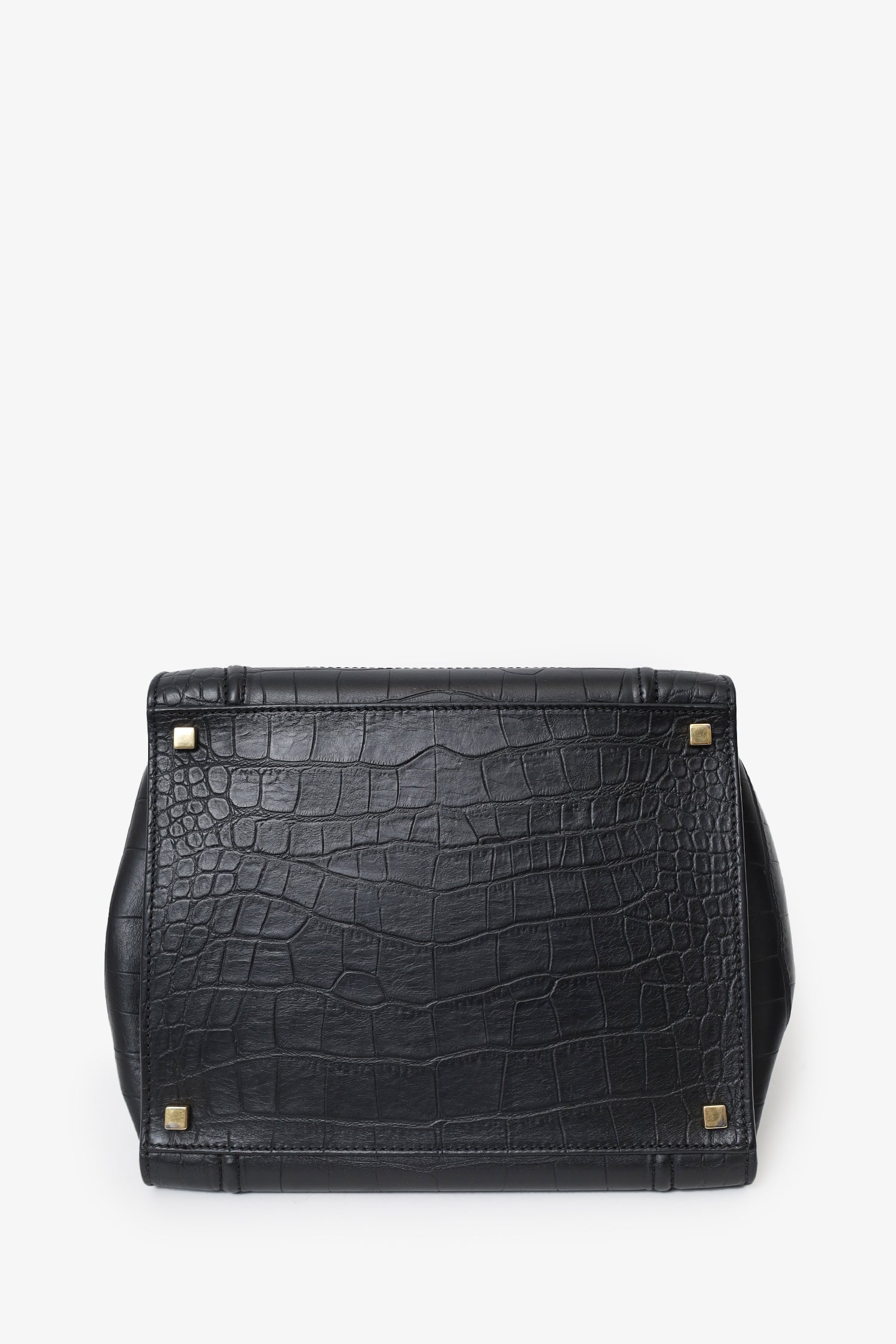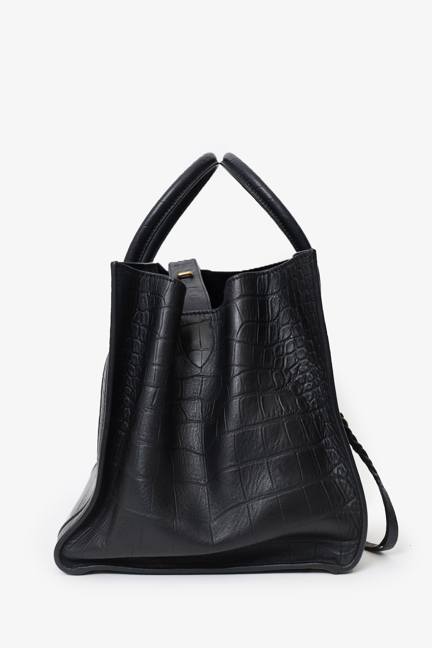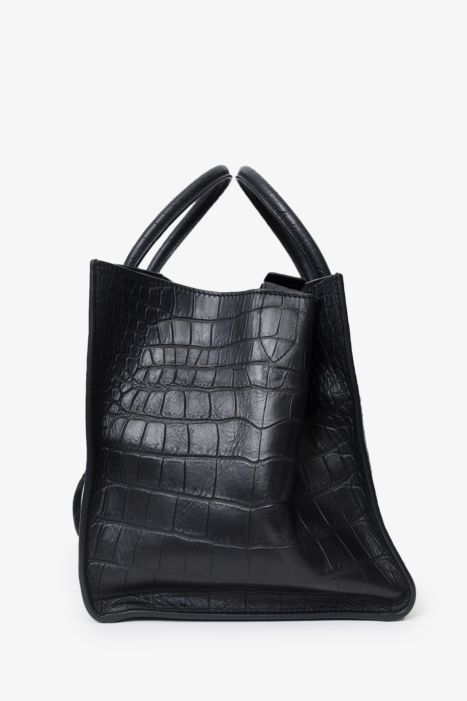 Refresh availabilityCeline Black Croc Embossed Leather Luggage Phantom Top Handle. Top open with adjustable strap closure. Twin top handles. Single front exterior zip pocket. Suede-lined interior. Single interior zip pocket. Tonal stitching. Gold-tone hardware.
