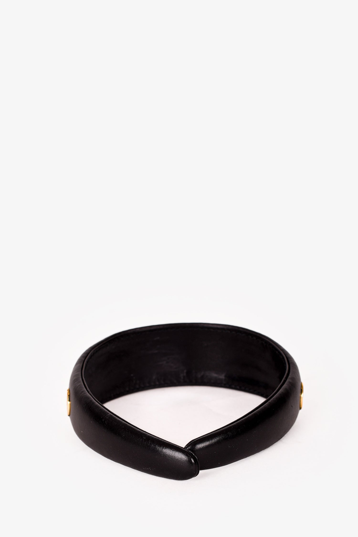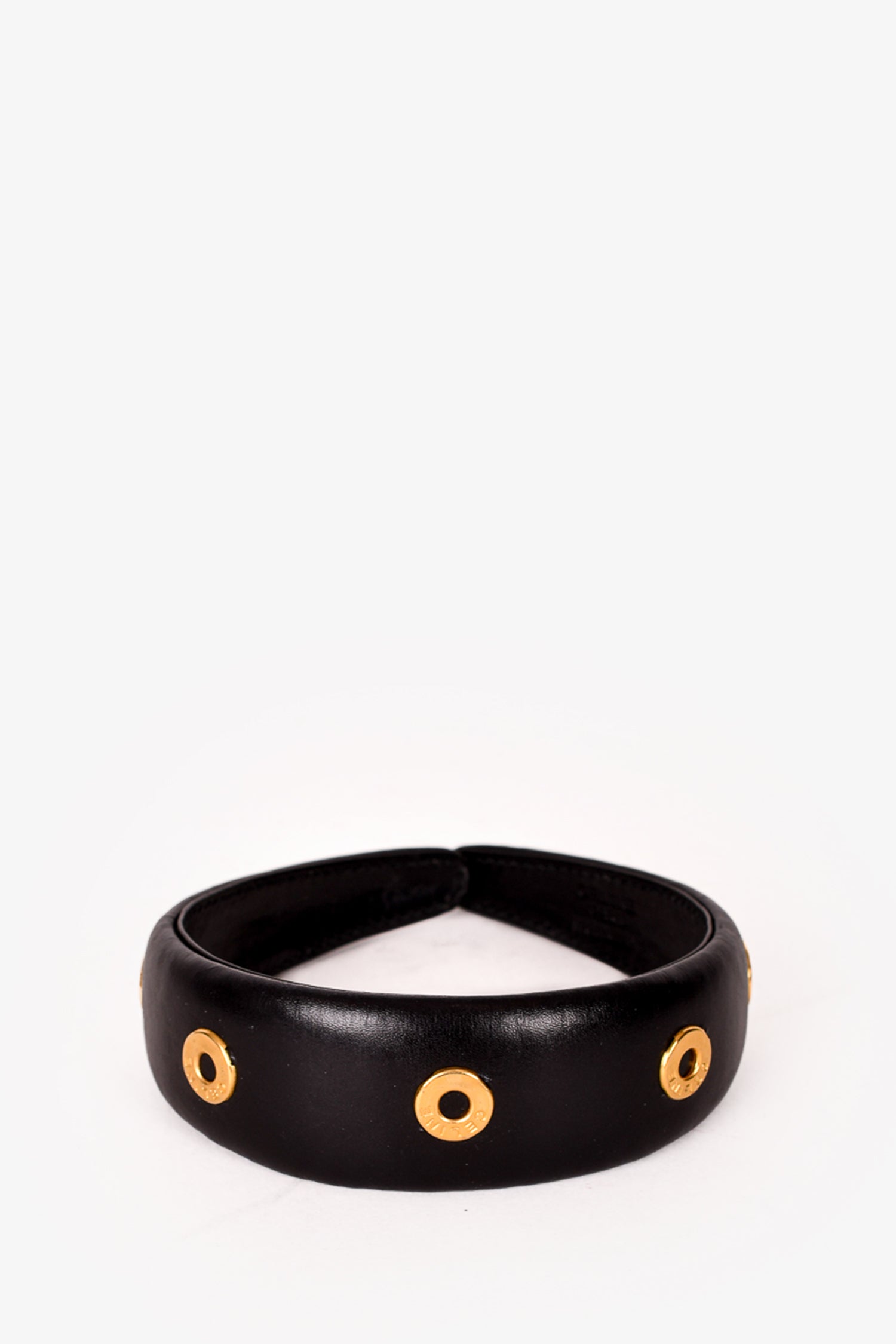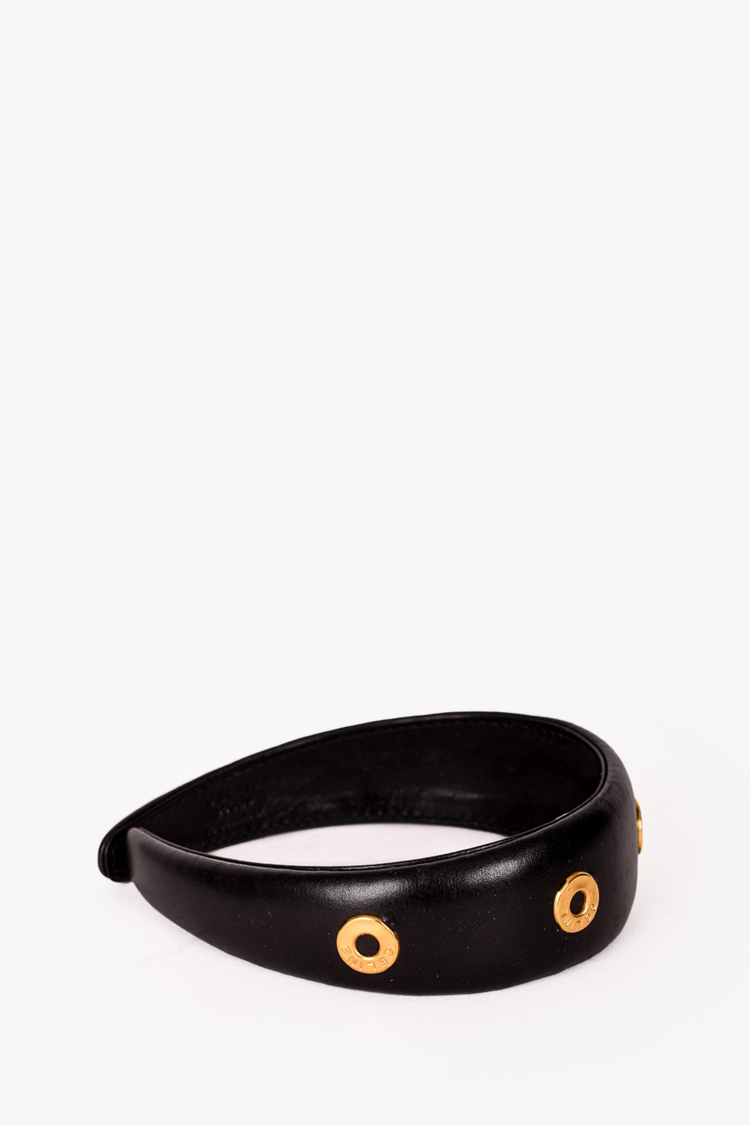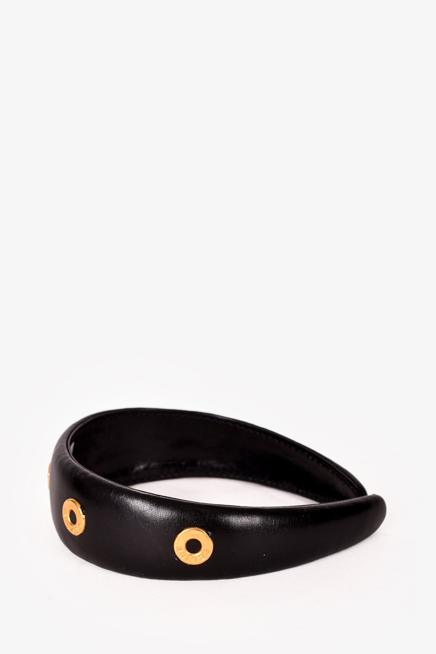 Celine Black/Gold Toned Leather Ring Embellished Headband. Tonal stitching.