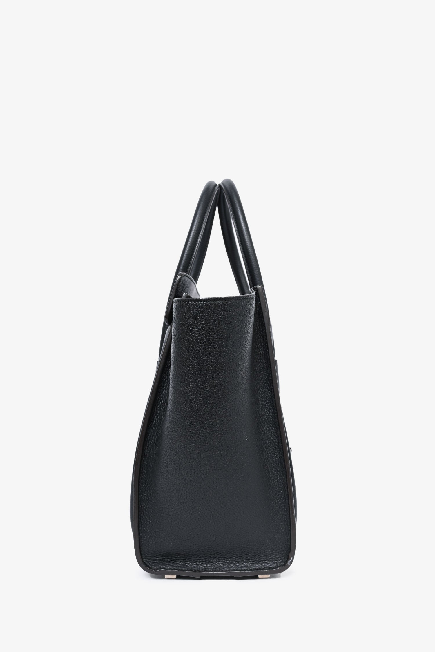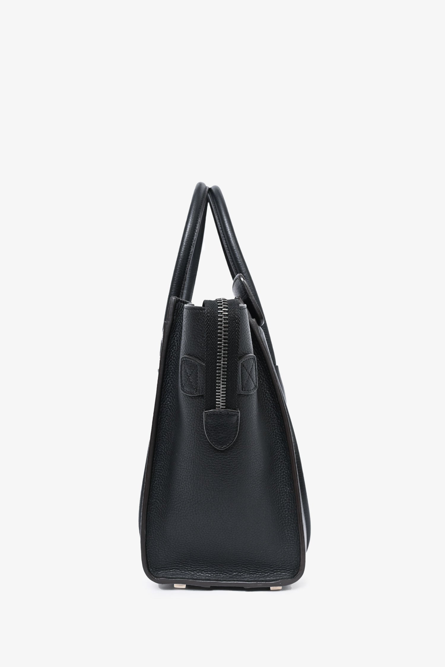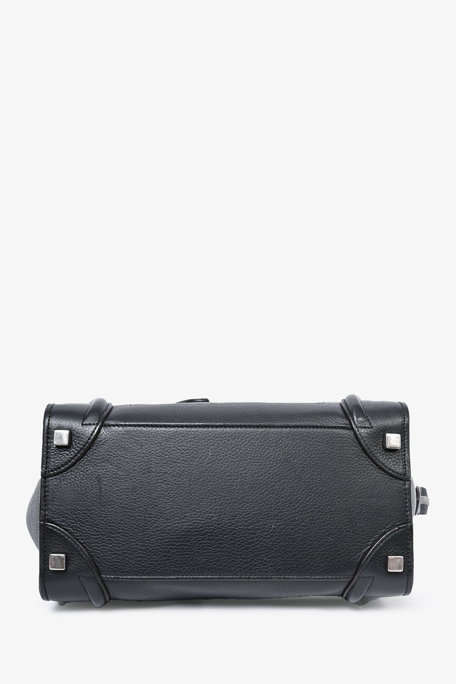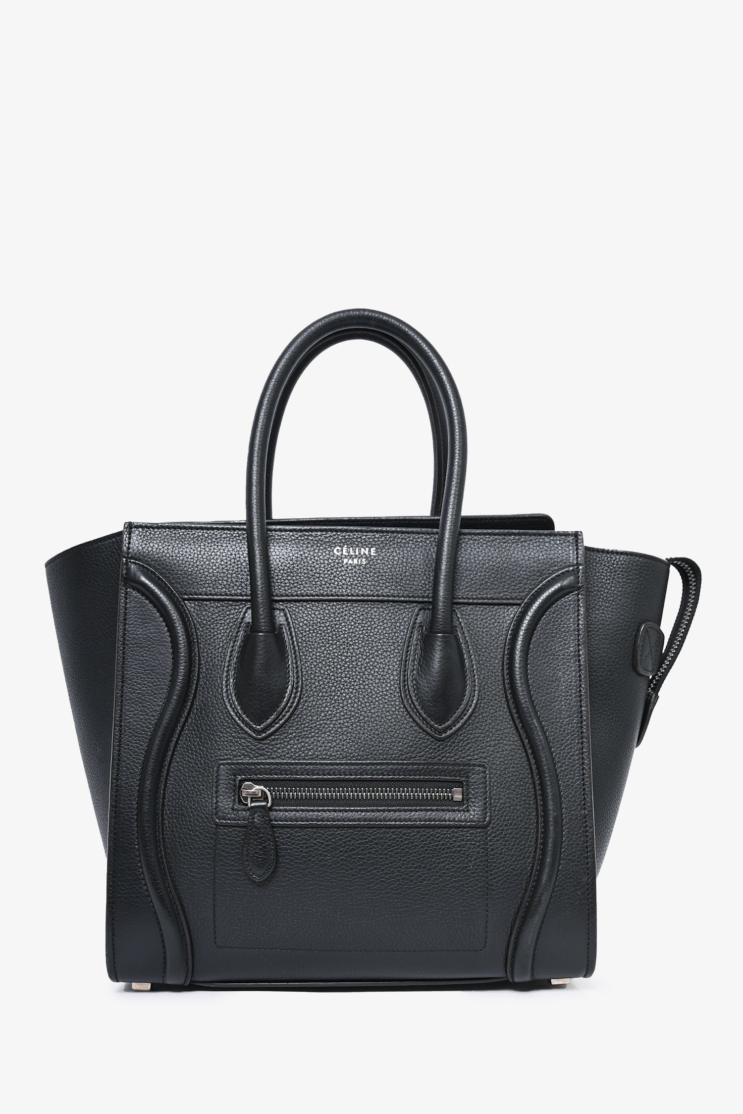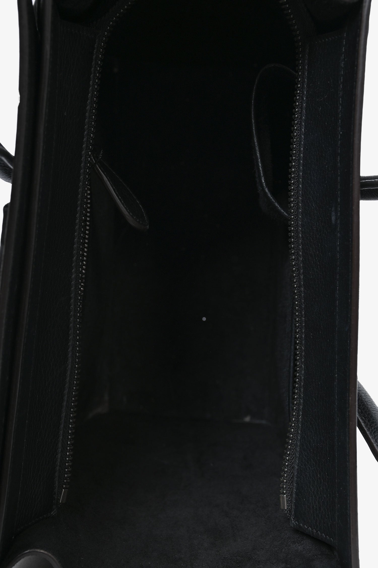 Refresh availabilityCeline Black Grained Leather Phantom Tote. Dual rolled handles. Front zip pocket. Top zip closure. Tonal suede interior lining. 3 interior wall pockets; 2 slip and 1 with zip closure. Protective metal bottom. Silver-tone hardware.