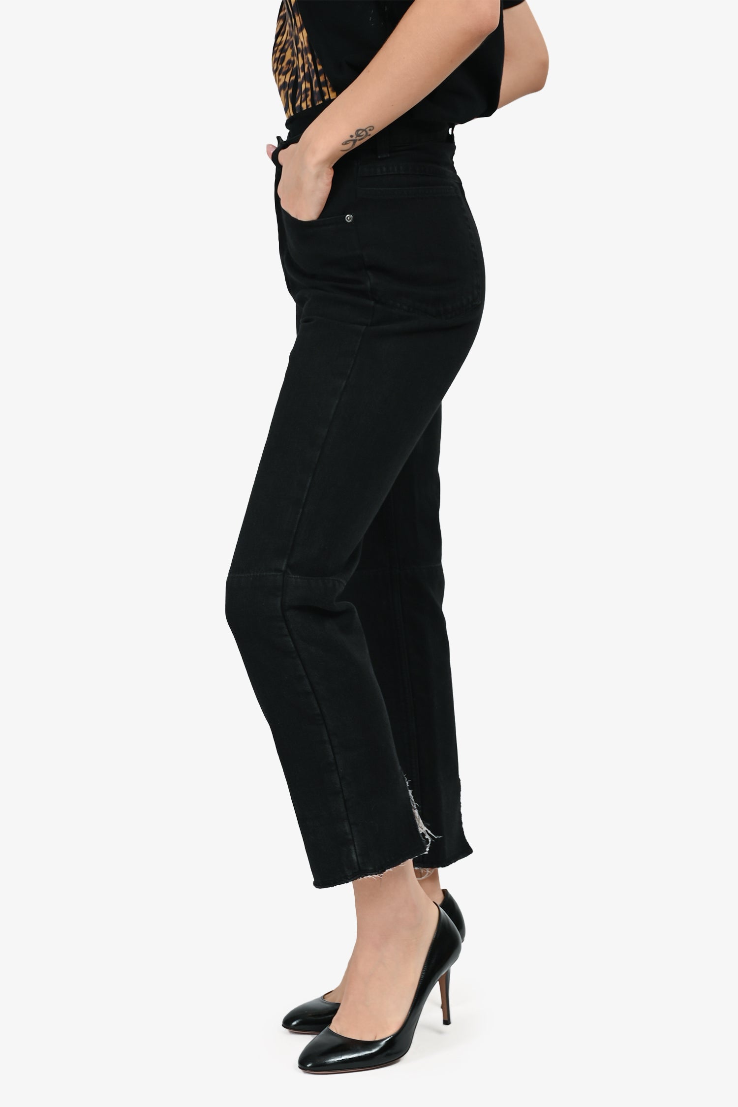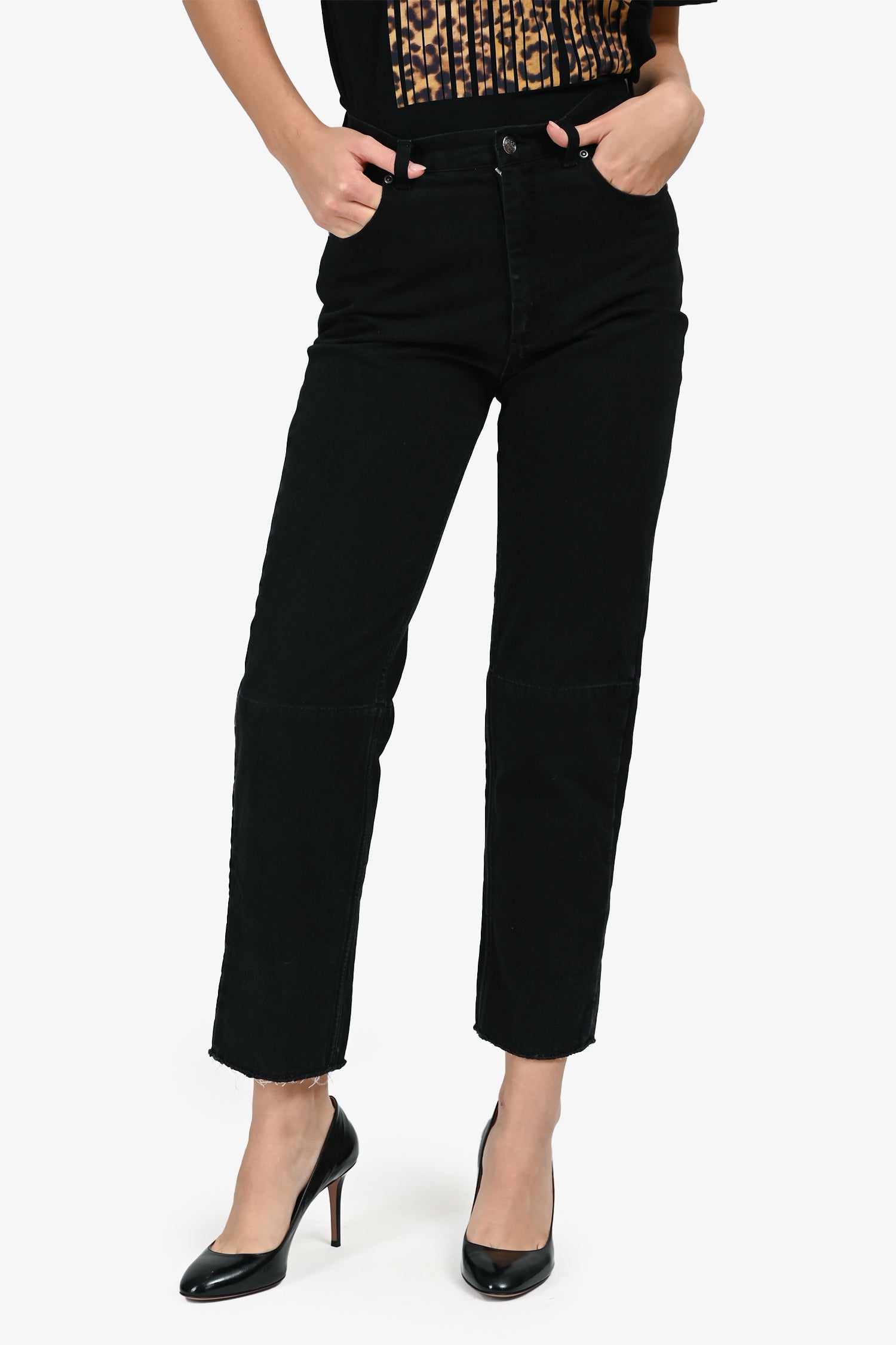 Refresh availabilityCeline Black High-Waisted Straight Jeans. Slip-on. Front zip and button closure. Belt loops at waistband. 2 front pockets, 1 coin pocket; 2 rear patch pockets. Slits at bottom hem. Raw edge. Silver-tone hardware. Tonal stitching.