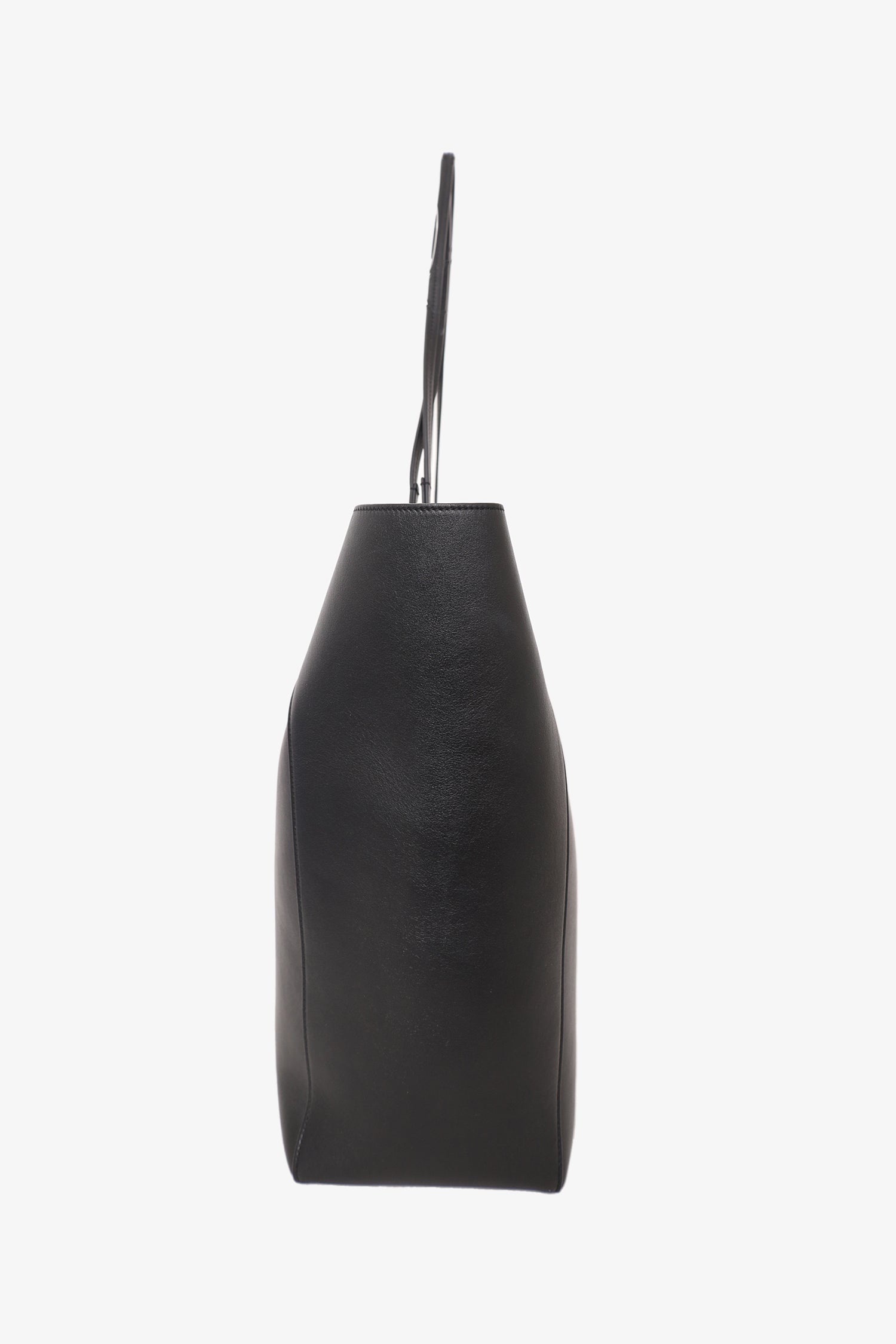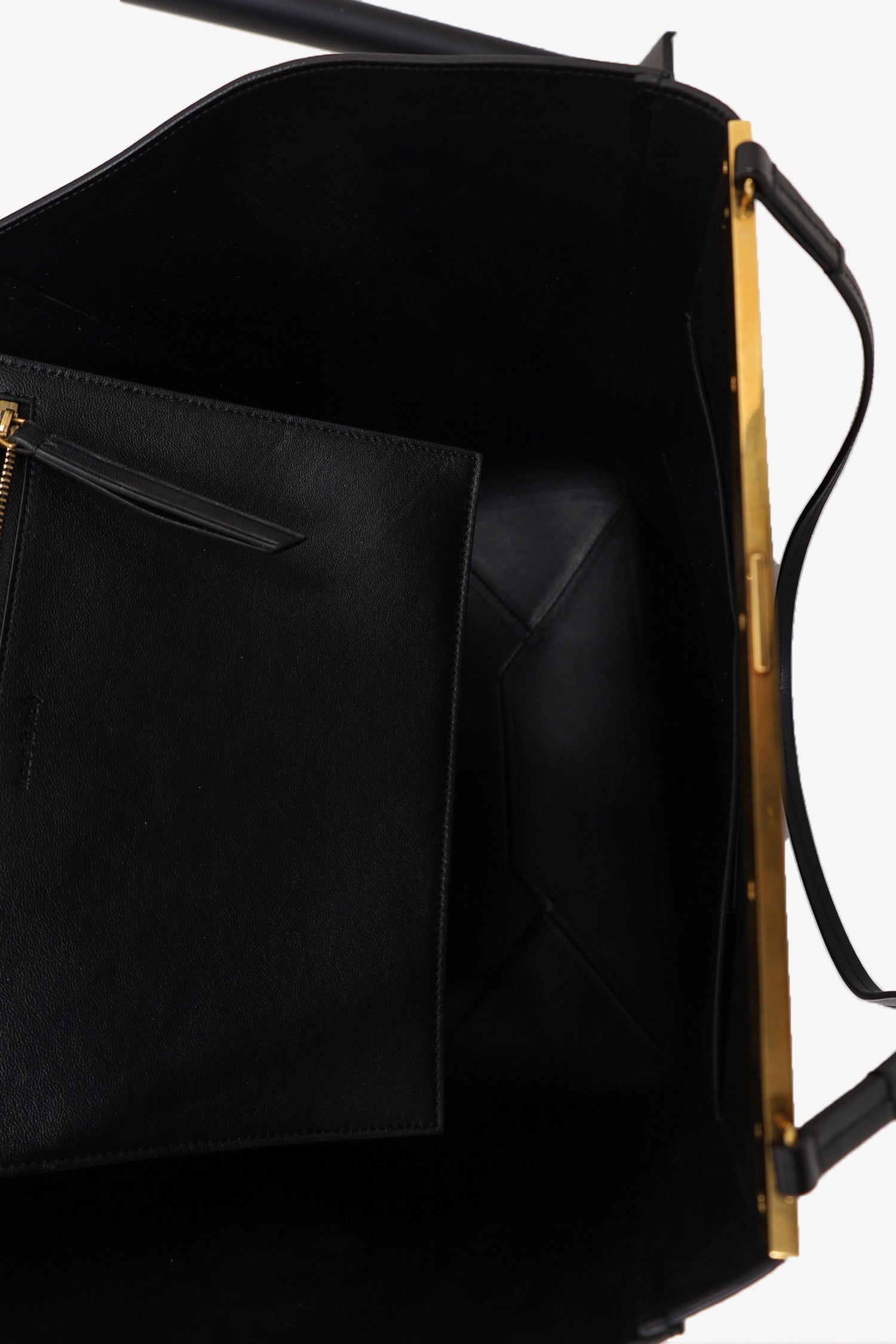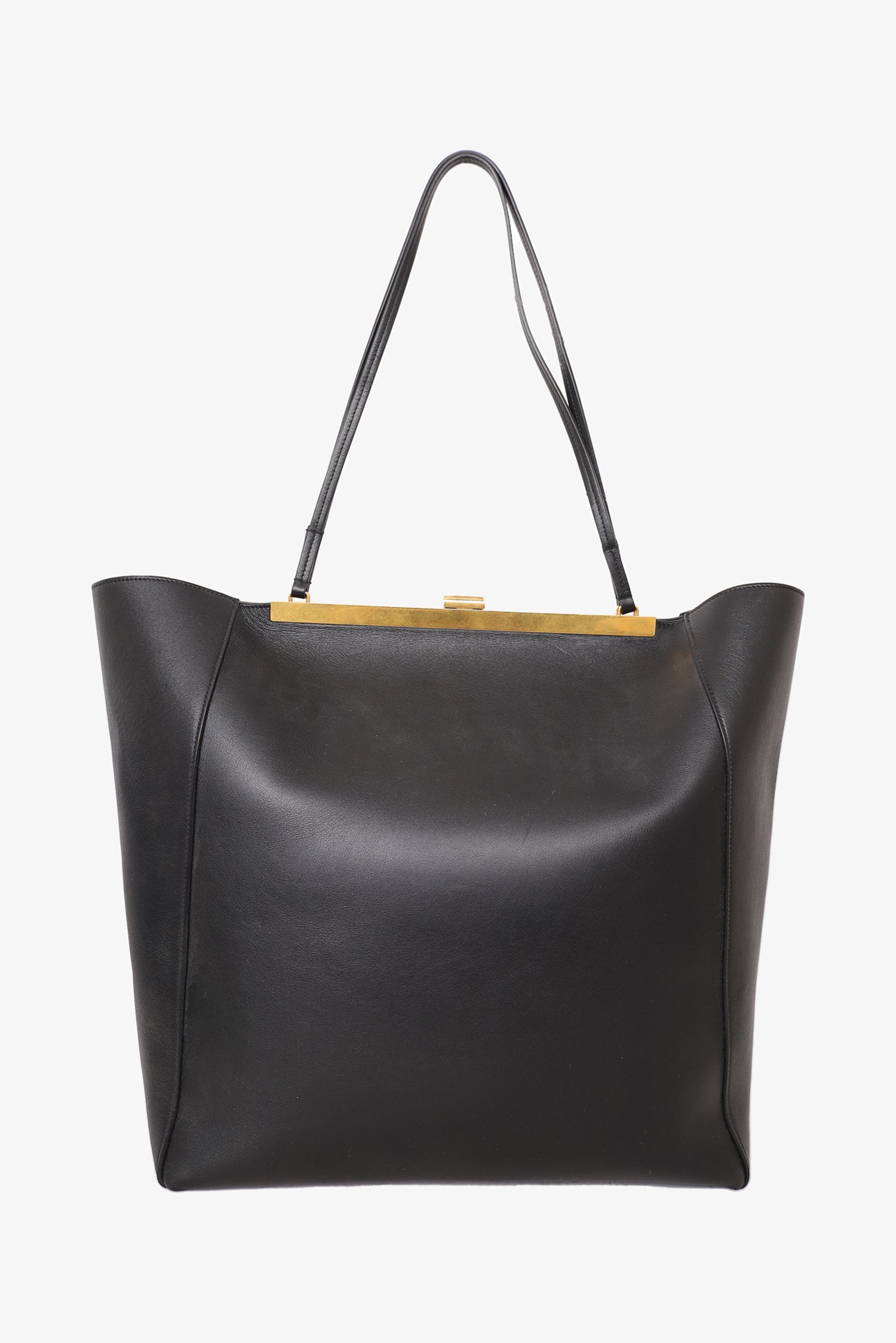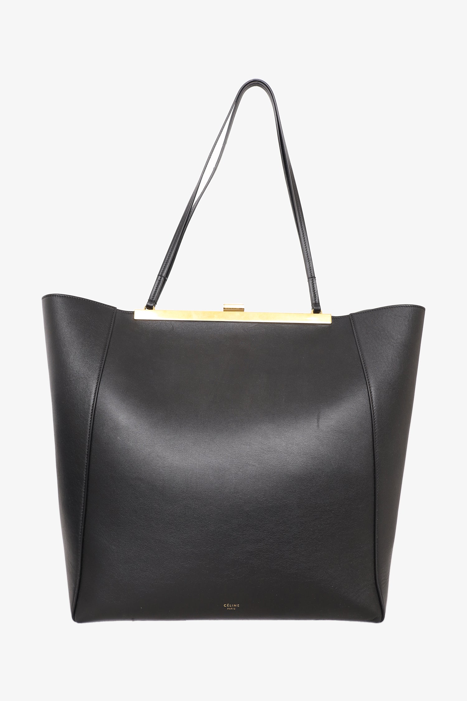 Refresh availabilityCeline Black Leather Clasp Cabas Tote. Twin handles. Top latch closures. 2 itnerior slip pockets. Gold-toned hardware. Tonal stitching.