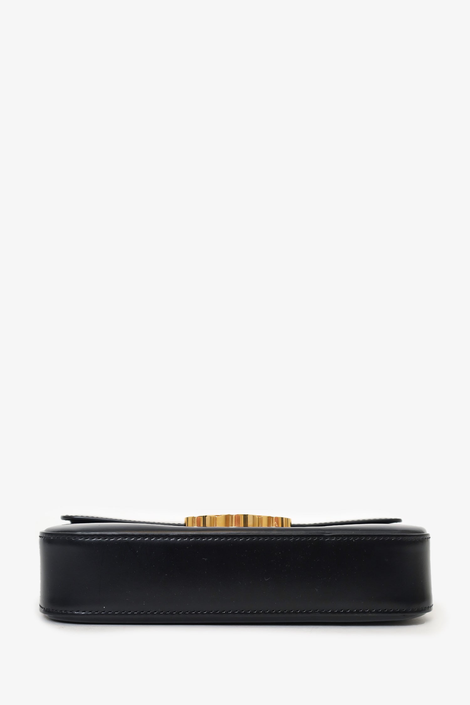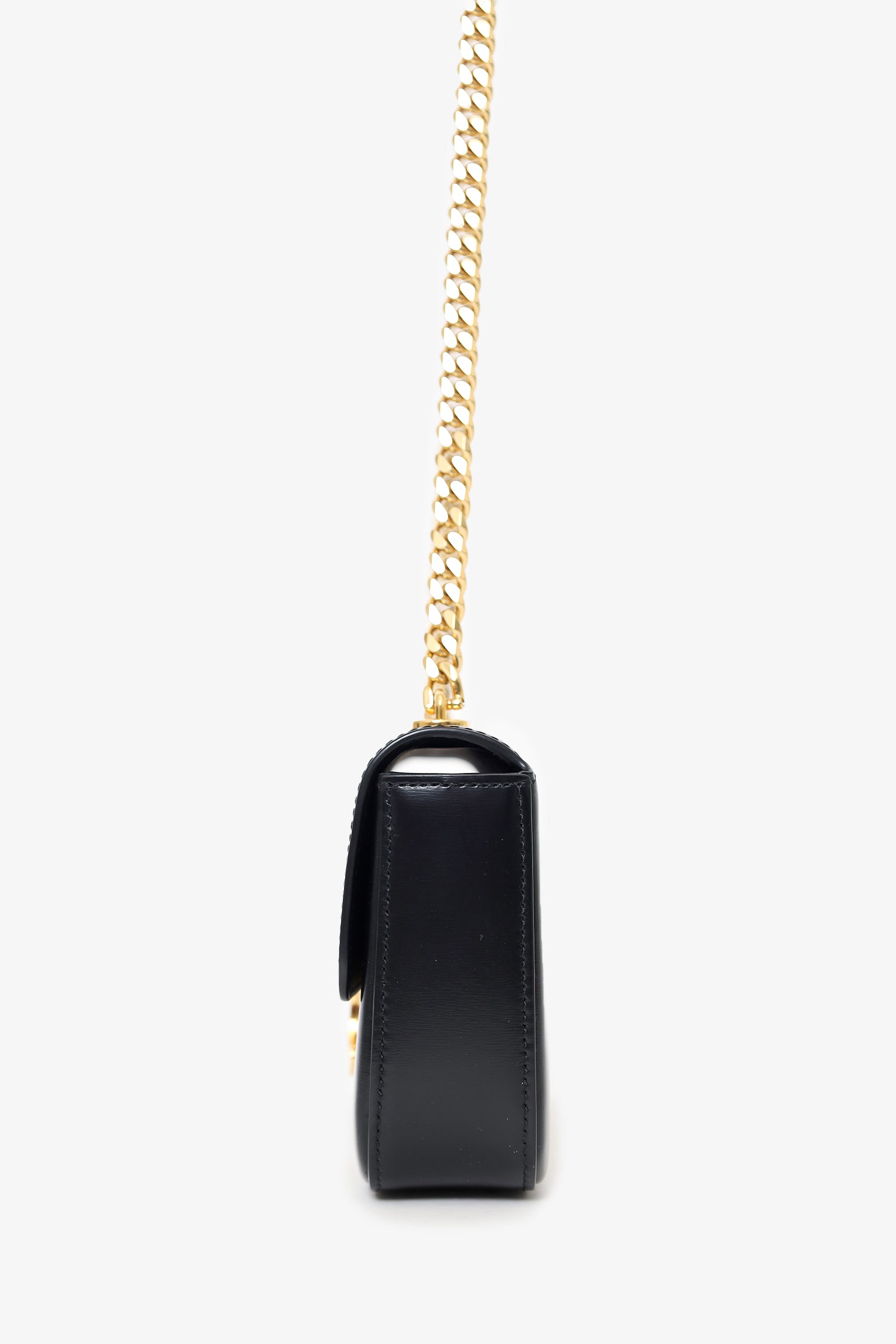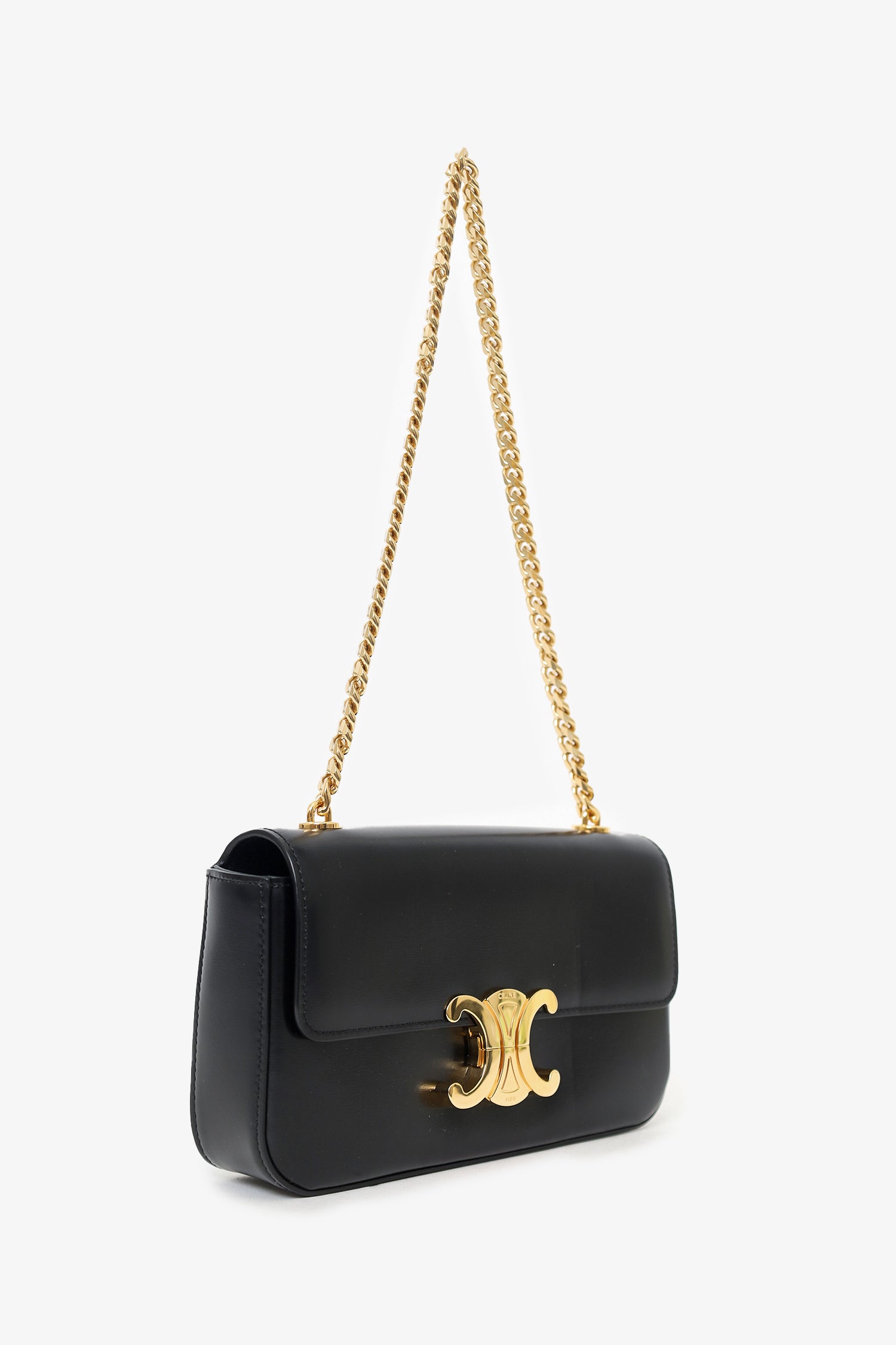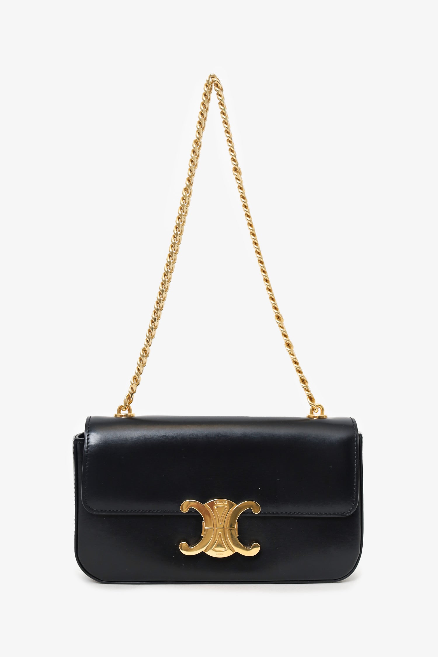 Refresh availabilityCeline Black Leather Claude Triomphe Chain Shoulder Bag. Front fold-over flap with pinch-lock closure. Chainlink shoulder strap. Single interior slip pocket. Gold-tone hardware. Tonal stitching.