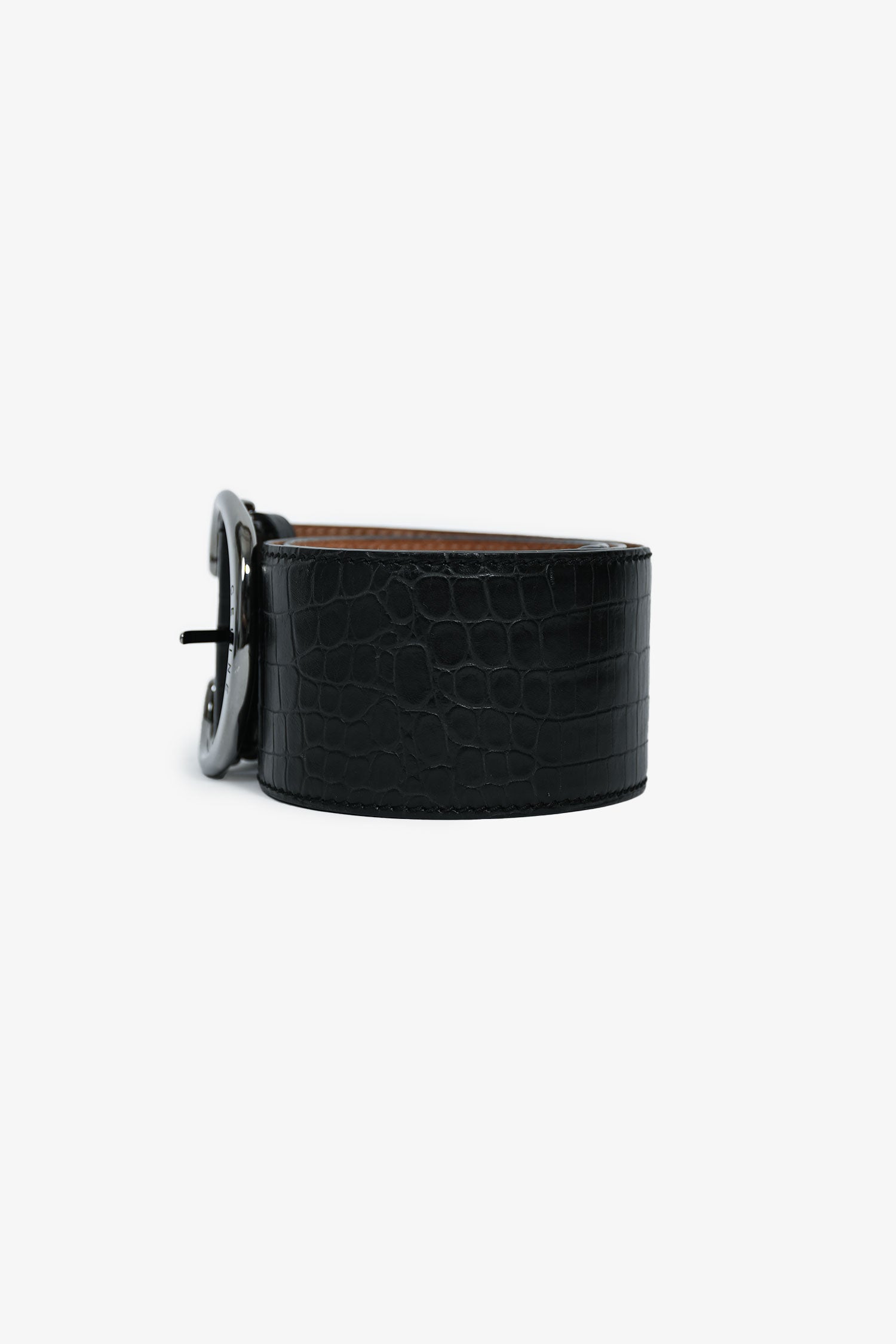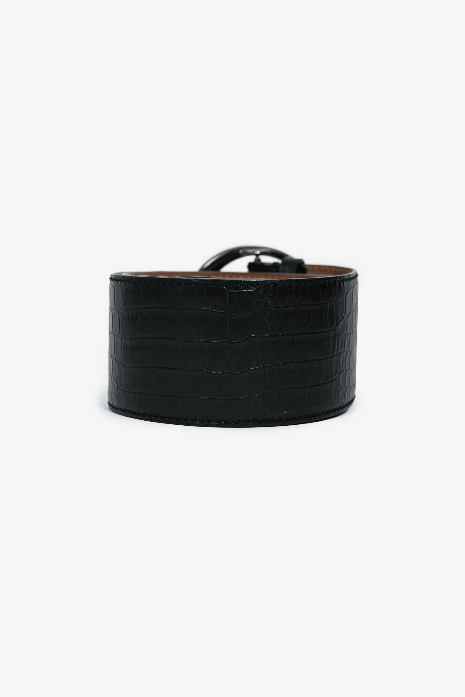 Refresh availabilityCeline Black Leather Croc Embossed Wide Belt. Silver-tone hardware. Suede interior. Tonal stitching.